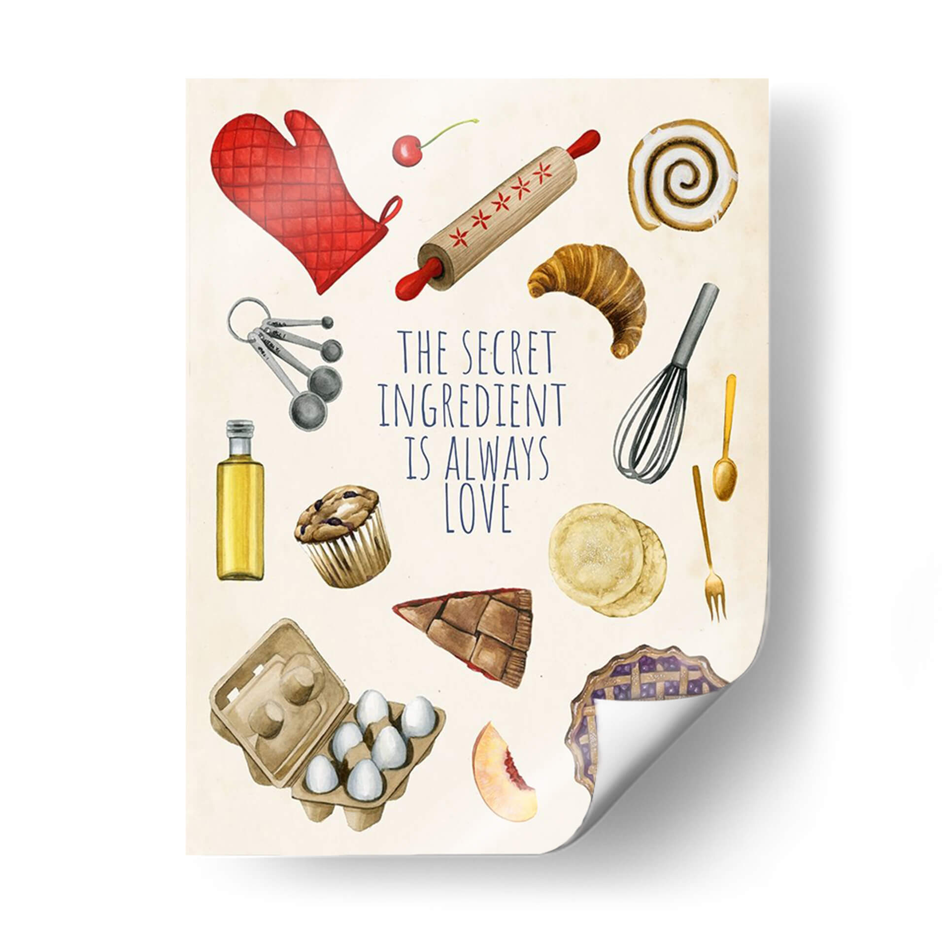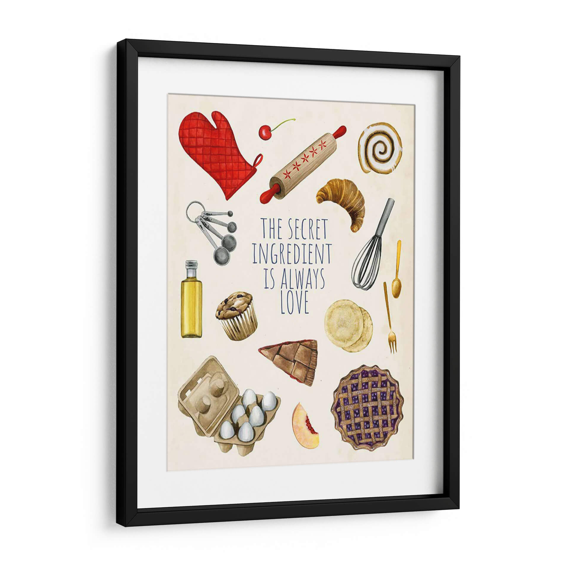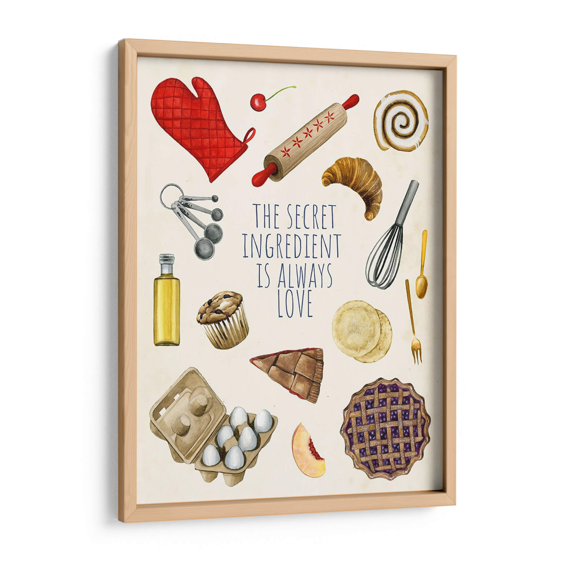 Celebra la alegría de la cocina con "Ingrediente Secreto I", una encantadora obra de arte de Grace Popp que captura la esencia de la repostería casera. Esta pieza vibrante presenta una colección de iconos culinarios, que incluyen un guante de horno rojo, un rodillo con un diseño distintivo, un croissant dorado, un batidor de alambre, un muffin recién horneado, huevos frescos en su cartón, una rodaja de melocotón jugosa, una porción de pastel de bayas y otros elementos esenciales de repostería, todos dispuestos sobre un fondo suave y texturizado. La frase central "THE SECRET INGREDIENT IS ALWAYS LOVE" ("El ingrediente secreto es siempre el amor") añade un toque personal y cálido, haciendo de este cuadro decorativo una adición perfecta para cualquier cocina, comedor o espacio donde se comparta el amor por la comida. Los colores vivos y el estilo detallado pero juguetón lo convierten en un punto focal alegre y acogedor. Ideal para quienes buscan añadir un toque de personalidad y calidez a su hogar, este cuadro es una oda a la creatividad y el afecto en la cocina.