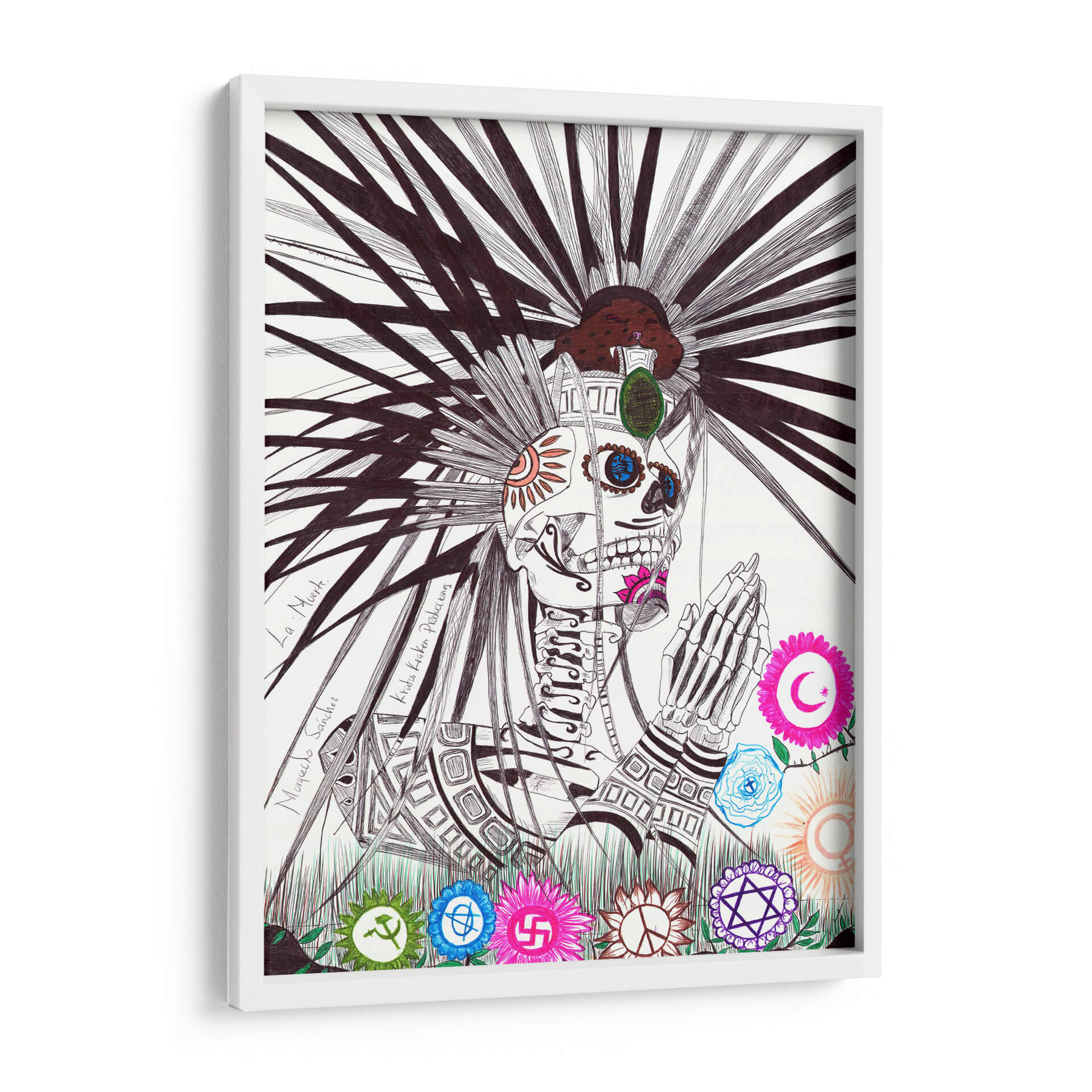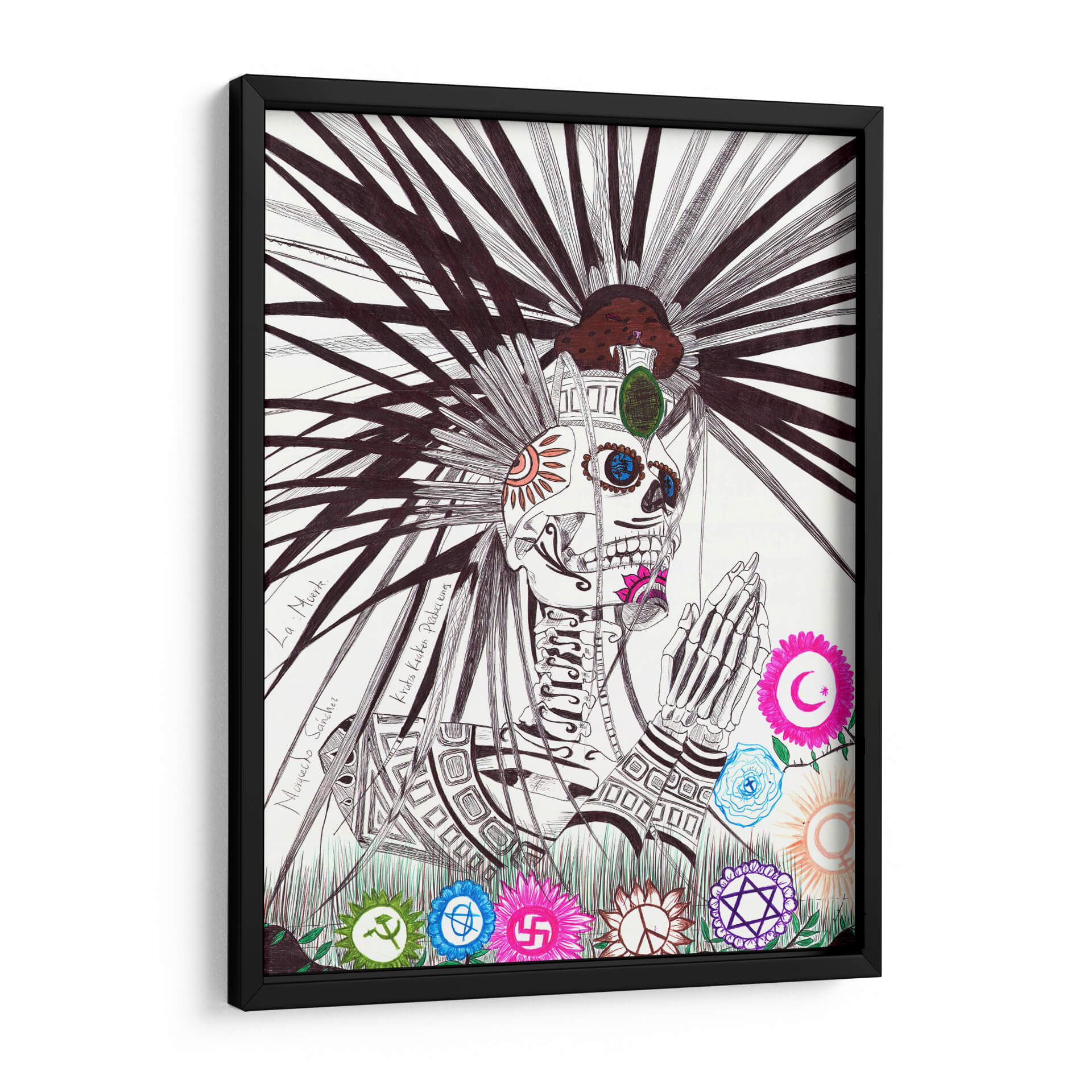 Sumérgete en la intrigante obra de arte 'La Muerte' de Morquecho Sánchez, un cuadro decorativo que desafía las convenciones y explora la dualidad de la existencia. Esta pieza, ejecutada con un detallado trazo a mano alzada, presenta una figura esquelética adornada con símbolos culturales y espirituales, rodeada de flores estilizadas que representan diversas ideologías y creencias. La paleta de colores, aunque predominantemente en blanco y negro, se ve realzada por sutiles toques de color en las flores y en los detalles del rostro del esqueleto, creando un contraste fascinante y una atmósfera introspectiva. El estilo de la obra, que fusiona elementos del surrealismo con una estética gráfica y detallada, la convierte en un punto focal cautivador para cualquier espacio. Ideal para salas de estar modernas, estudios o cualquier lugar donde se aprecie el arte que invita a la reflexión y al debate. 'La Muerte' no es solo una decoración, es una declaración visual que estimula la conversación y añade profundidad a tu entorno. Un cuadro decorativo que combina audacia y simbolismo para aquellos que buscan una pieza de arte única y con significado.