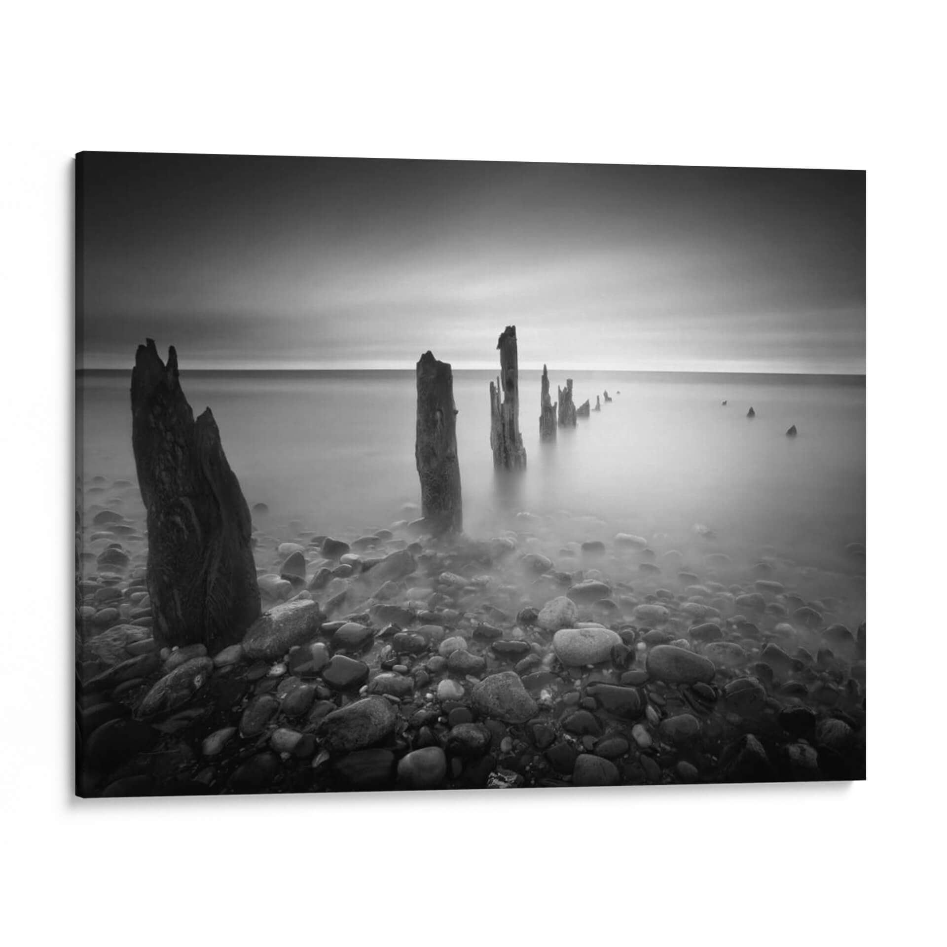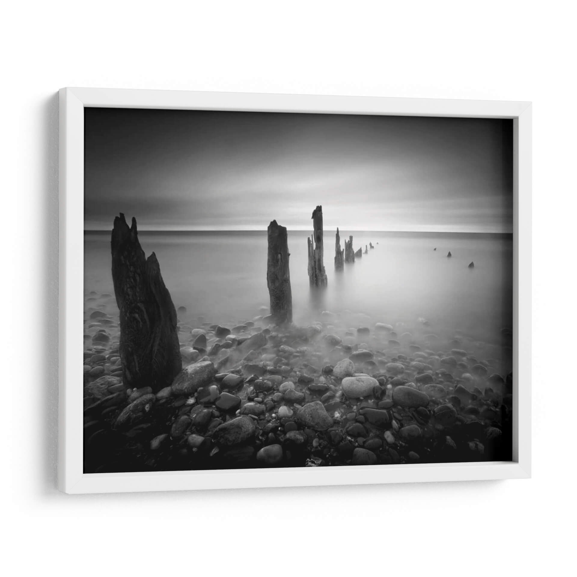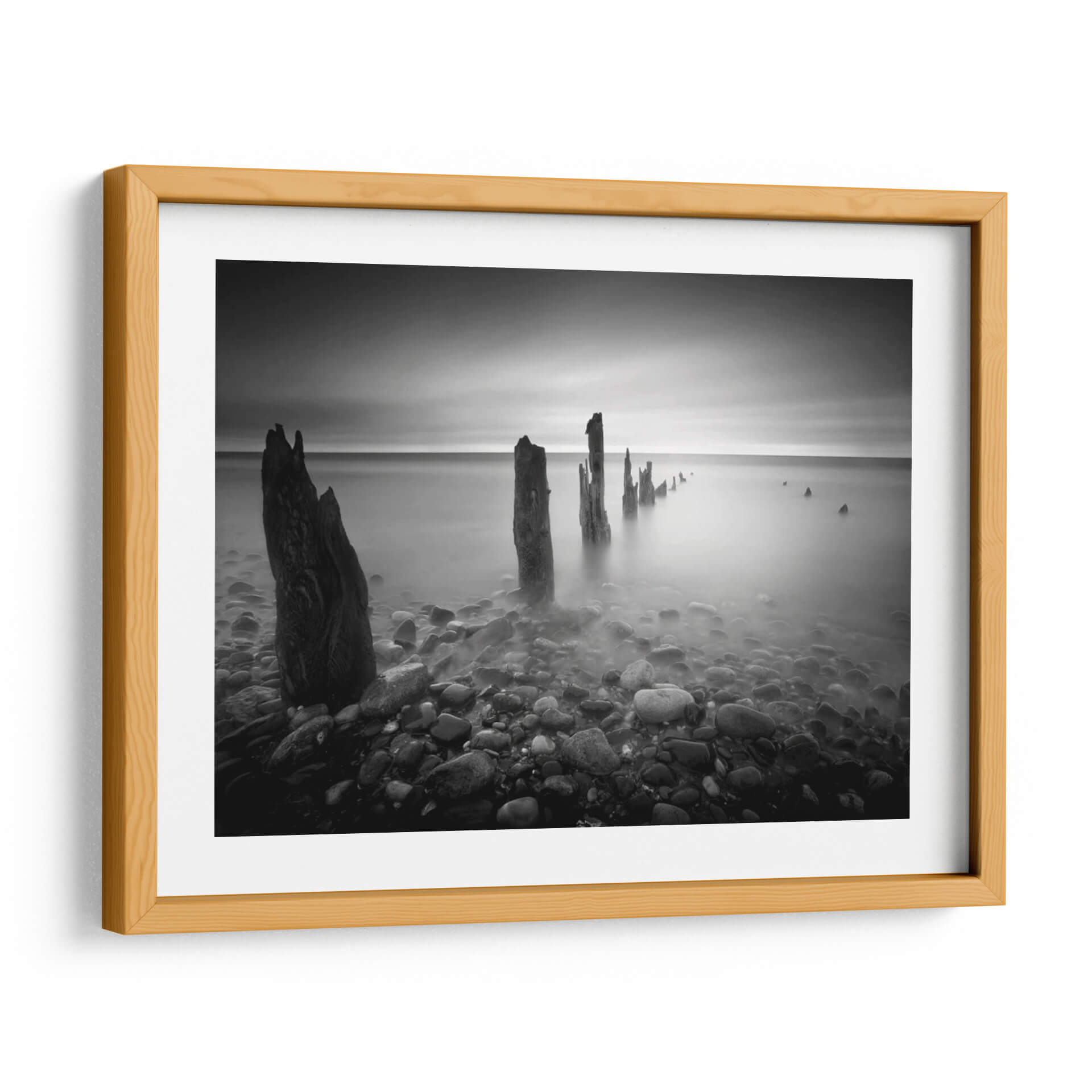Sumérgete en la atmósfera melancólica y serena de "Luz Tenue", una obra maestra fotográfica de Martin Henson. Esta pieza evoca la quietud de un paisaje costero al amanecer o atardecer, capturada en un estilo monocromático que resalta la textura y la forma. Los restos de antiguas estructuras de madera emergen del agua y se alinean en el horizonte, creando una sensación de historia y temporalidad. La paleta de grises, desde los negros profundos de los troncos hasta los blancos etéreos del cielo y el mar, otorga a la imagen una cualidad atemporal y contemplativa. Las piedras pulidas por el agua en primer plano añaden detalle y anclan la composición. "Luz Tenue" es ideal para aquellos que buscan infundir sus espacios con una sensación de calma y reflexión. Este cuadro decorativo es perfecto para salones modernos, oficinas minimalistas o dormitorios donde se desea un toque de serenidad y elegancia. Su composición lineal y la profundidad creada por la bruma marina invitan a la introspección, convirtiendo esta obra en un punto focal que inspira paz y tranquilidad. Añade esta fotografía artística a tu colección y transforma tu hogar en un santuario de calma.