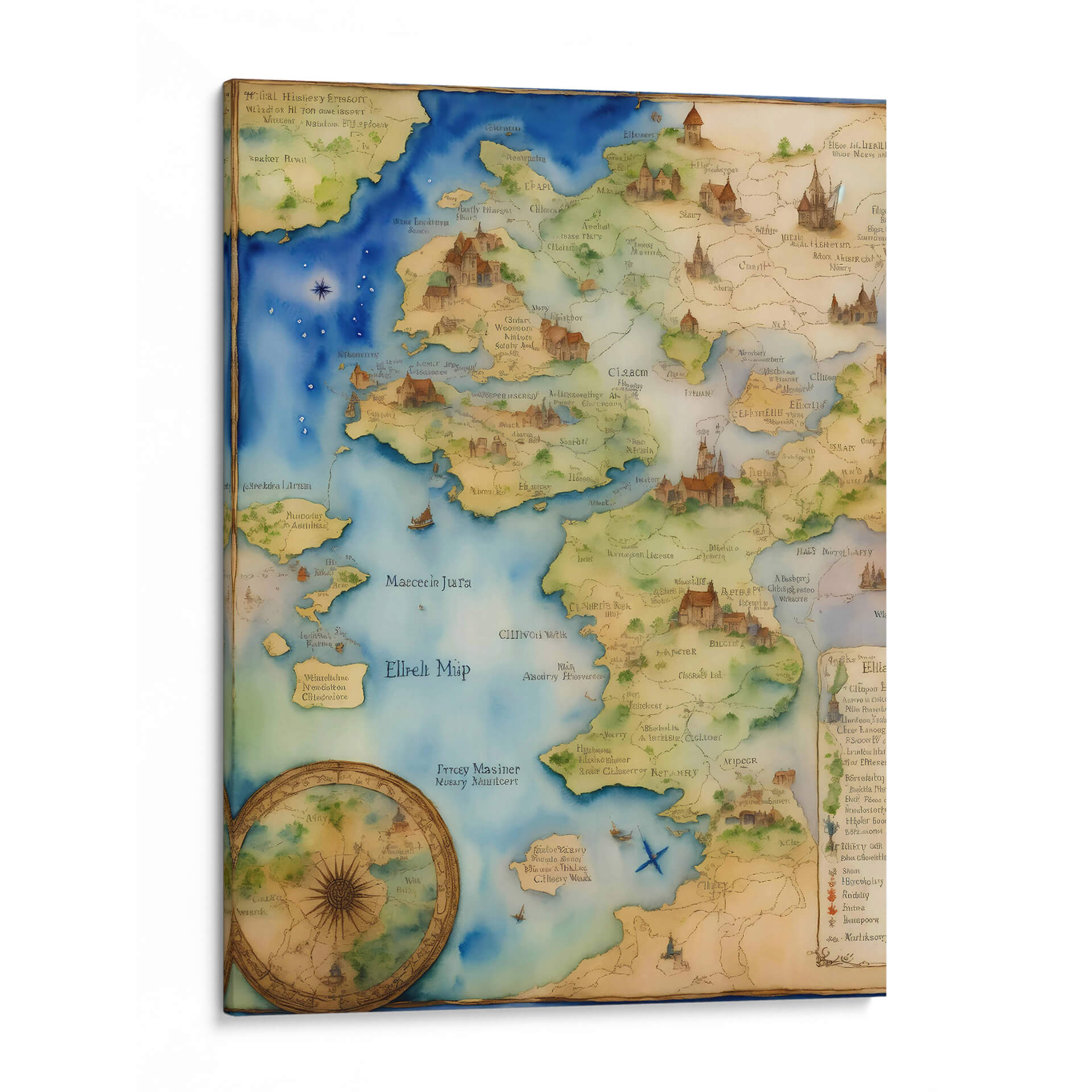 Embárquese en un viaje visual con 'Mapa Elfo', una cautivadora obra de arte digital que evoca la maravilla y la aventura de tierras fantásticas. Este cuadro decorativo presenta una representación detallada de un mundo imaginario, con intrincados detalles de paisajes, asentamientos y cuerpos de agua que invitan a la exploración. La paleta de colores, dominada por tonos azules celestes y verdes terrosos, junto con sutiles toques de ocre y marrón, crea una atmósfera serena pero intrigante. El estilo artístico, inspirado en mapas antiguos y la estética de la fantasía épica, se complementa con un diseño que recuerda a las ilustraciones cartográficas tradicionales, incluyendo una brújula decorativa en la esquina inferior izquierda. Cada elemento, desde las montañas estilizadas hasta los pequeños poblados, está pintado con una delicadeza que despierta la imaginación y el deseo de descubrir los secretos ocultos en este lienzo. 'Mapa Elfo' es más que una simple decoración de pared; es una invitación a soñar y a añadir un toque de misticismo y escapismo a cualquier espacio, ideal para salones, estudios o cualquier habitación que busque inspirar la curiosidad y la creatividad.