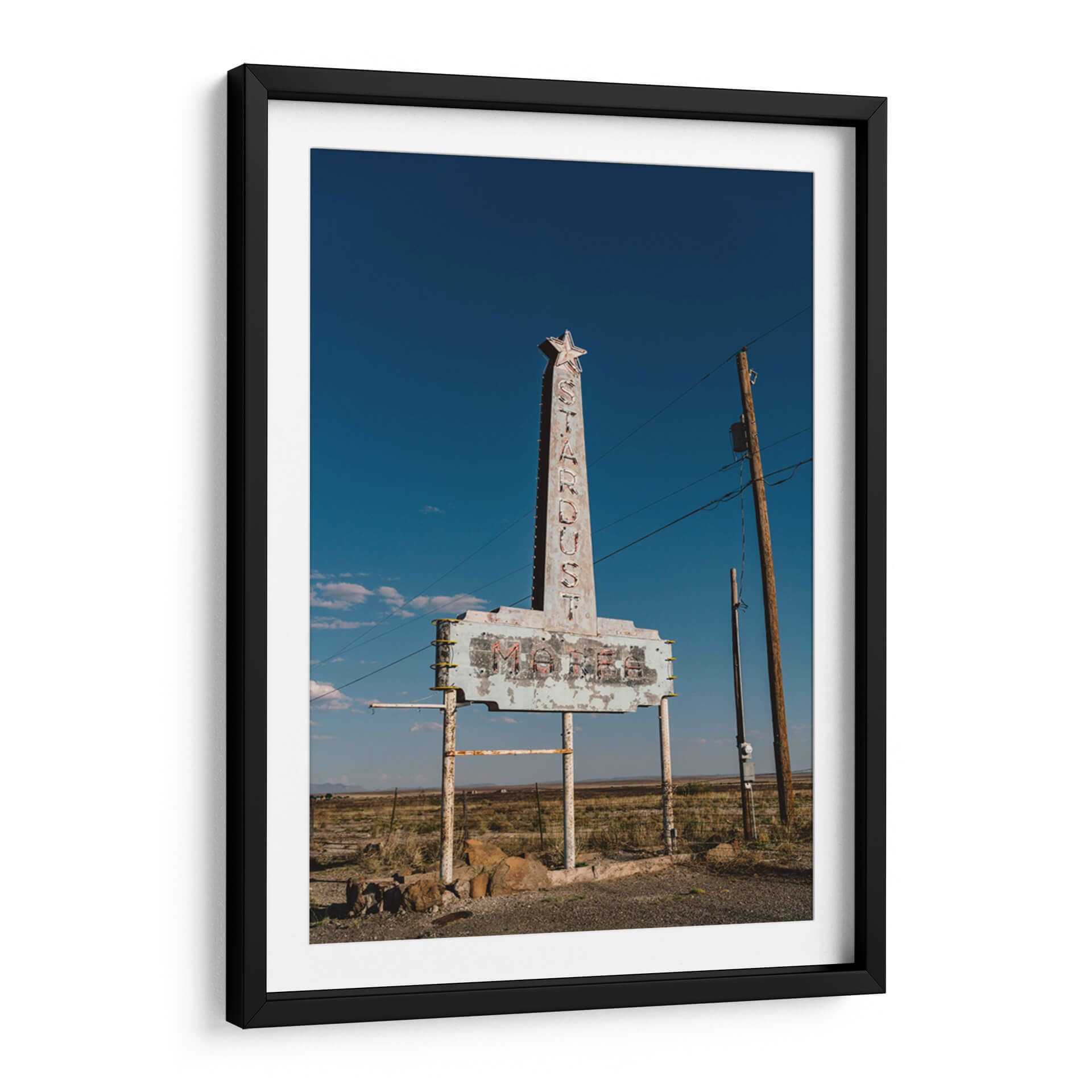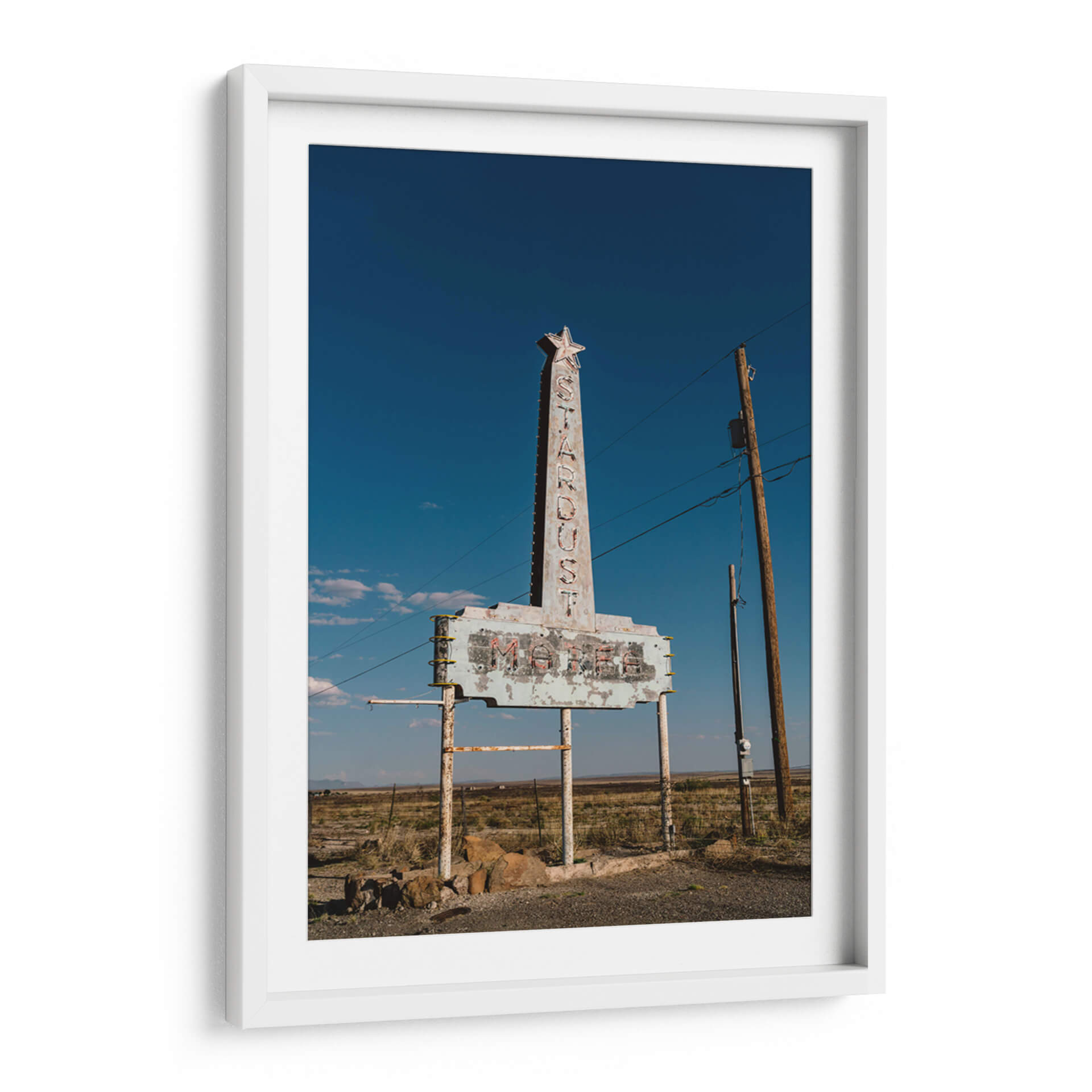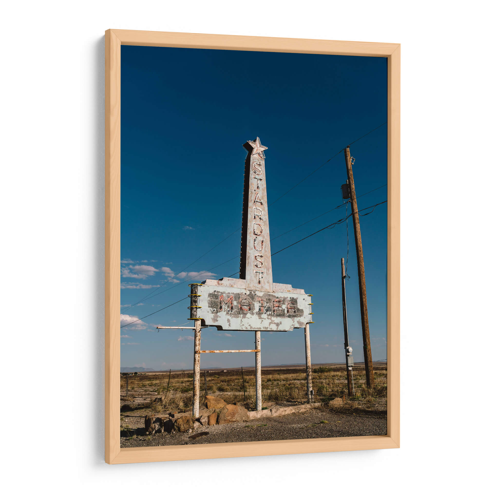Sumérgete en la nostalgia y el encanto del viejo oeste con 'Marfa Stardust', una obra de Bethany Young que captura la esencia de un letrero de motel abandonado bajo un cielo azul despejado. Este cuadro decorativo evoca una sensación de aventura, de historias pasadas y de la belleza efímera de los lugares olvidados. La paleta de colores, dominada por los tonos azules profundos del cielo y los ocres terrosos del paisaje árido, crea una atmósfera serena pero a la vez evocadora. El letrero, con su tipografía retro y su aspecto desgastado, se erige como un monumento a tiempos pasados, invitando a la reflexión y al viaje imaginario. La composición, centrada en el icónico letrero y enmarcada por la inmensidad del paisaje y la utilidad de un poste de luz, transmite una sensación de soledad y resistencia. 'Marfa Stardust' es perfecta para añadir un toque de carácter único y una narrativa visual intrigante a cualquier espacio, desde un salón moderno hasta un estudio o una oficina. Ideal para amantes de la fotografía de carretera, el arte con temática retro y aquellos que buscan una pieza que hable de viajes y recuerdos. Este cuadro decorativo es un recordatorio visual de la belleza que se encuentra en lo imperfecto y lo abandonado, un verdadero tesoro para tu colección de arte mural.