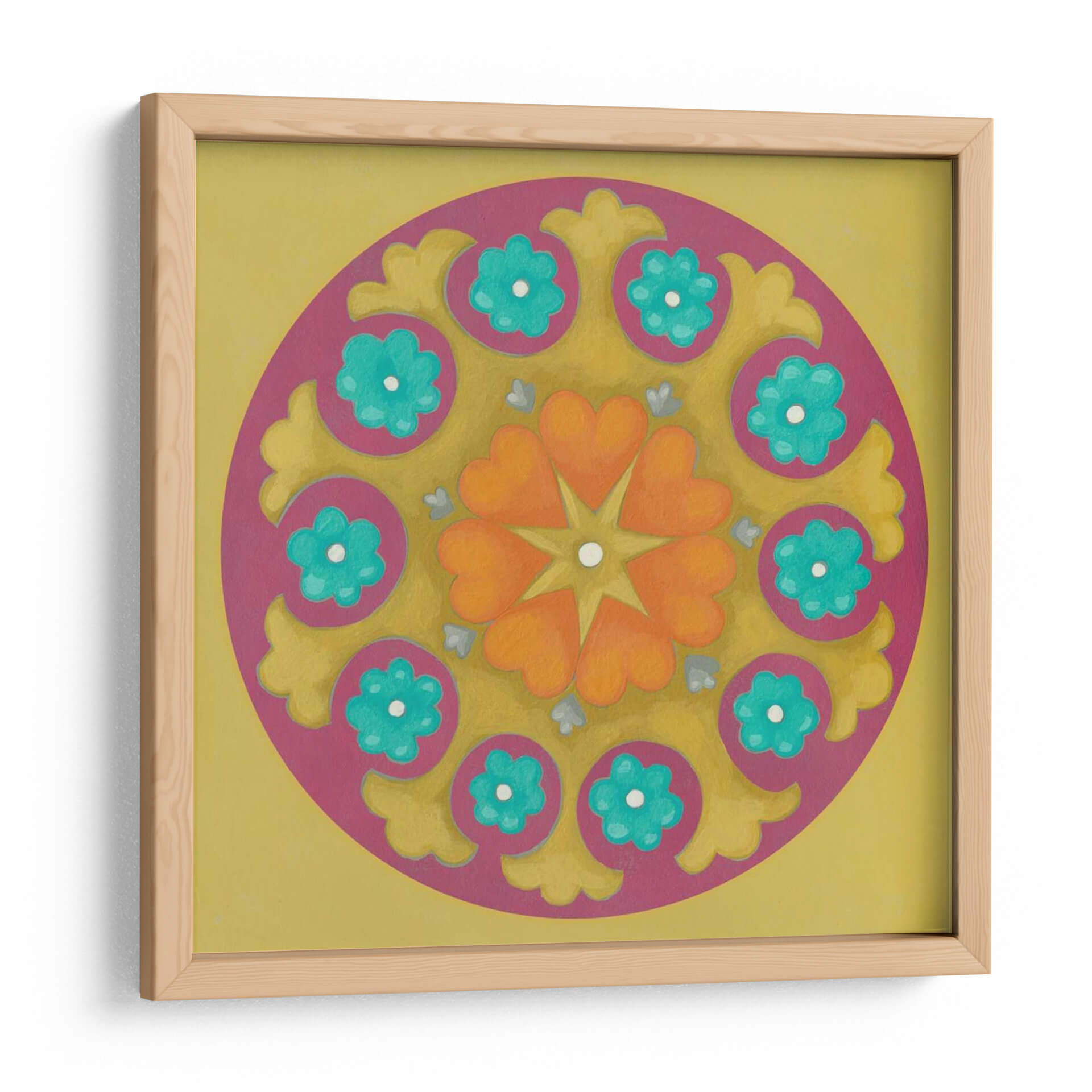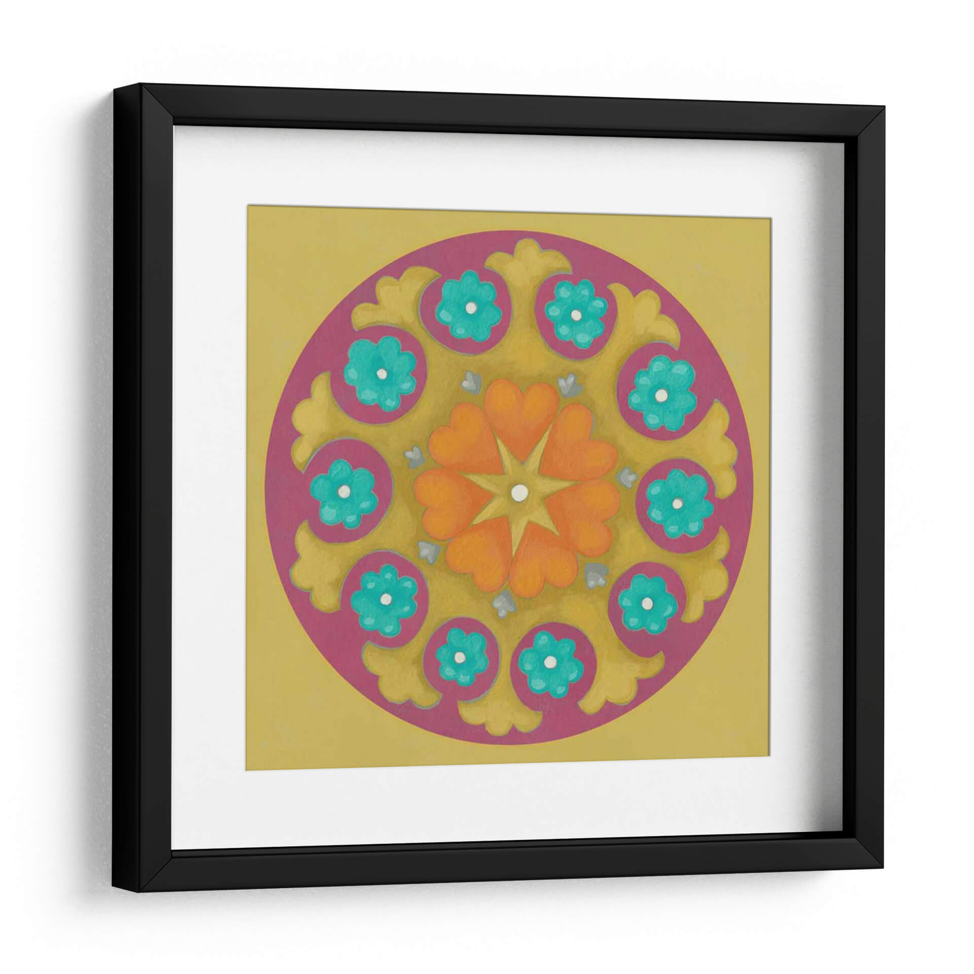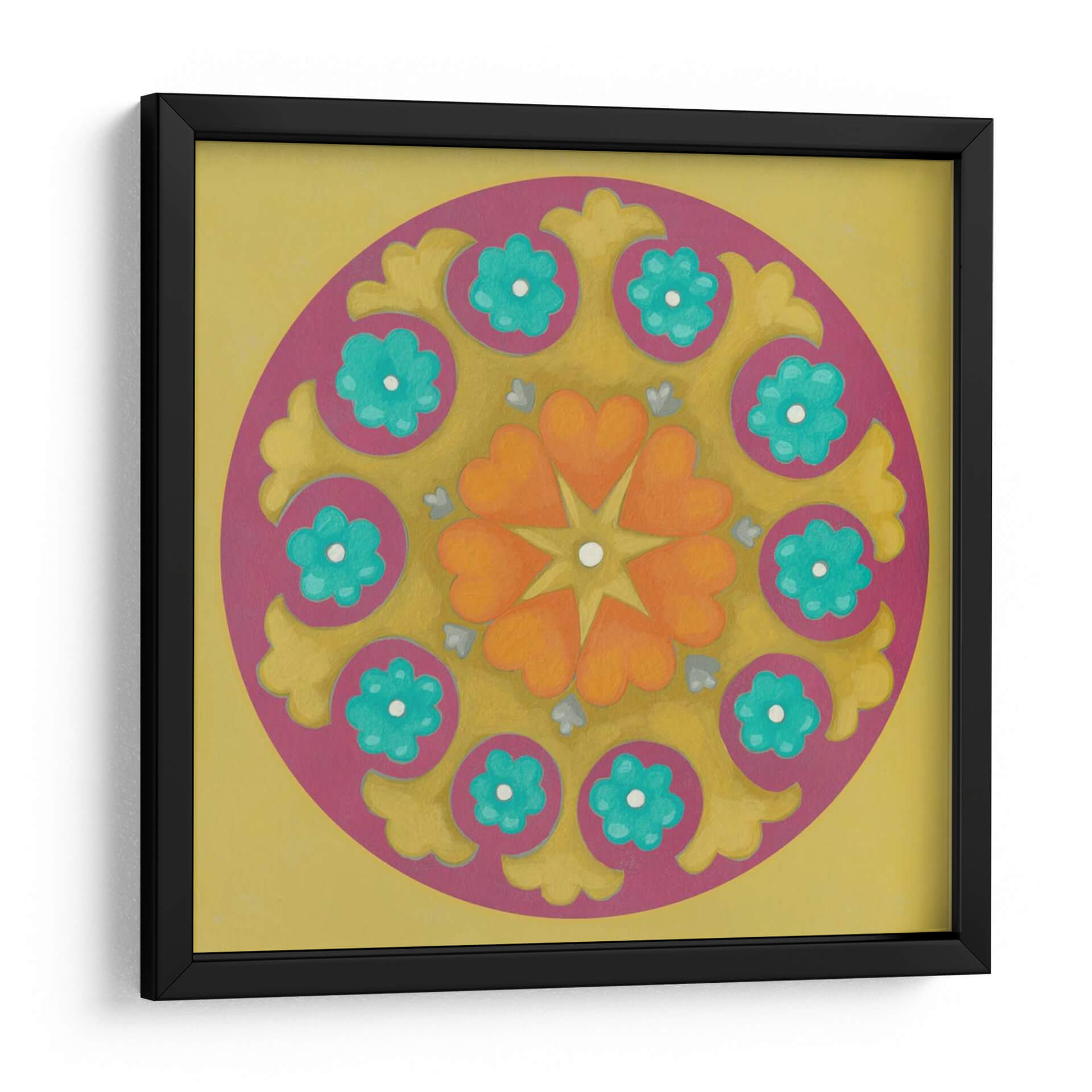 Embellece tu hogar con la vibrante energía del cuadro decorativo "Me Celebración Suzani" de Chariklia Zarris. Esta obra de arte presenta una cautivadora composición circular inspirada en los tradicionales motivos Suzani, reimaginados con un toque contemporáneo y audaz. El diseño se despliega en un armonioso patrón que evoca festividad y alegría, centrado en una flor estilizada de pétalos naranjas que irradia calidez. Alrededor, delicadas flores en tonos turquesa se asoman entre volutas en color magenta, todo ello sobre un fondo ocre que aporta luminosidad y un matiz terrenal. La paleta de colores, rica y contrastante, crea un punto focal dinámico que atrae la mirada y estimula los sentidos. Ideal para añadir un toque de color y personalidad a salones modernos, comedores o incluso a espacios de trabajo que busquen inspirar creatividad. Este cuadro decorativo no es solo una pieza de arte, sino una ventana a una celebración de la vida y la cultura, perfecta para quienes aprecian la artesanía detallada y el diseño lleno de carácter. Añade un acento de diseño étnico y moderno a tu decoración.