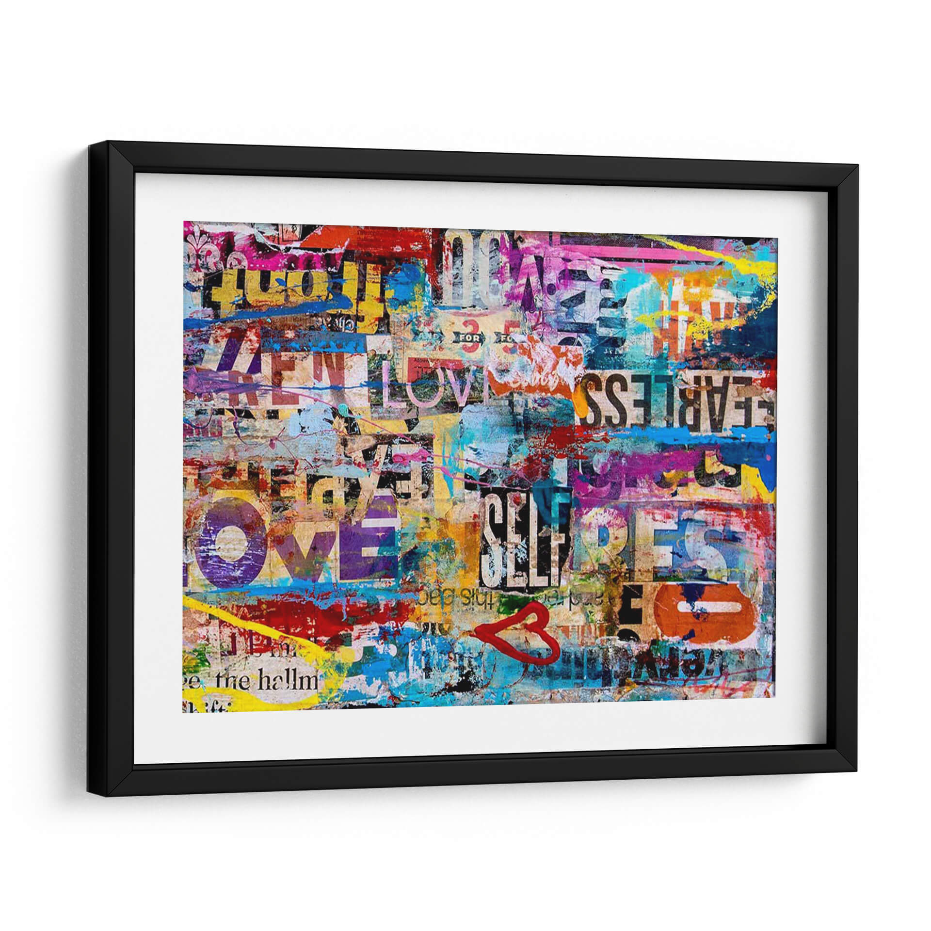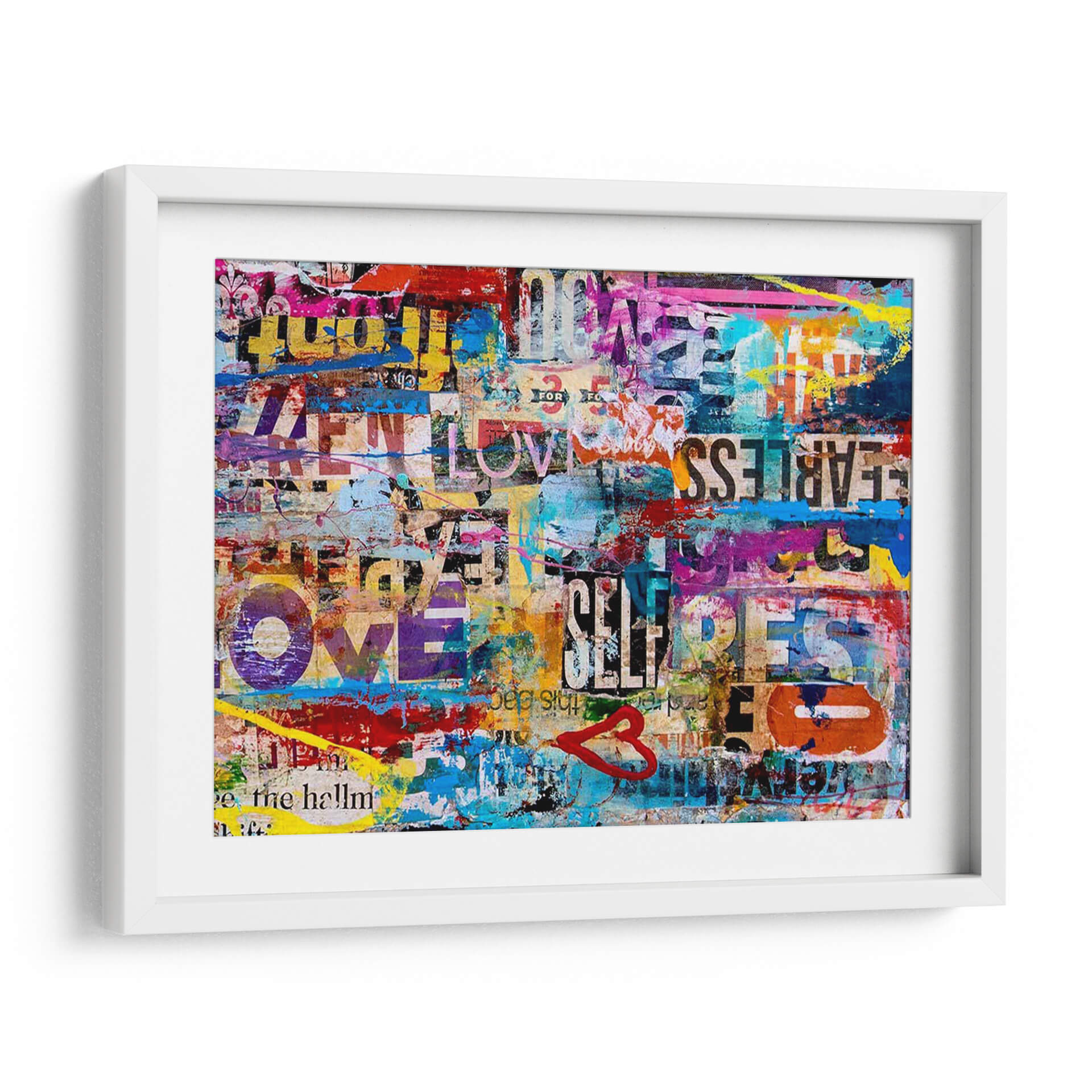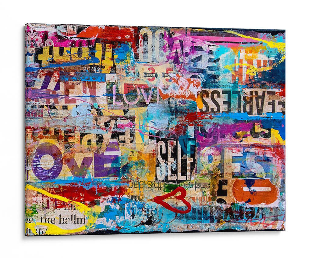 Sumérgete en la vibrante energía de "Metromix Luv II", una obra de arte contemporáneo que fusiona texto, color y emoción en una composición dinámica y cautivadora. Este cuadro decorativo es un collage urbano lleno de vida, donde fragmentos de palabras como "LOVE", "FEARLESS" y "SELF" se entrelazan con salpicaduras de pintura audaces en tonos vibrantes de azul eléctrico, amarillo brillante, rosa intenso y rojo apasionado. La técnica de collage y esténcil crea una textura visual rica, evocando la estética del arte callejero y la publicidad urbana. "Metromix Luv II" no es solo una pieza decorativa, sino una declaración de estilo que inyecta optimismo y modernidad en cualquier espacio. Su naturaleza abstracta y llena de mensajes positivos lo convierte en el punto focal perfecto para salas de estar modernas, oficinas creativas o cualquier lugar donde se desee añadir un toque de audacia y positividad. Deja que esta explosión de color y mensaje inspire conversaciones y eleve la atmósfera de tu hogar u oficina.