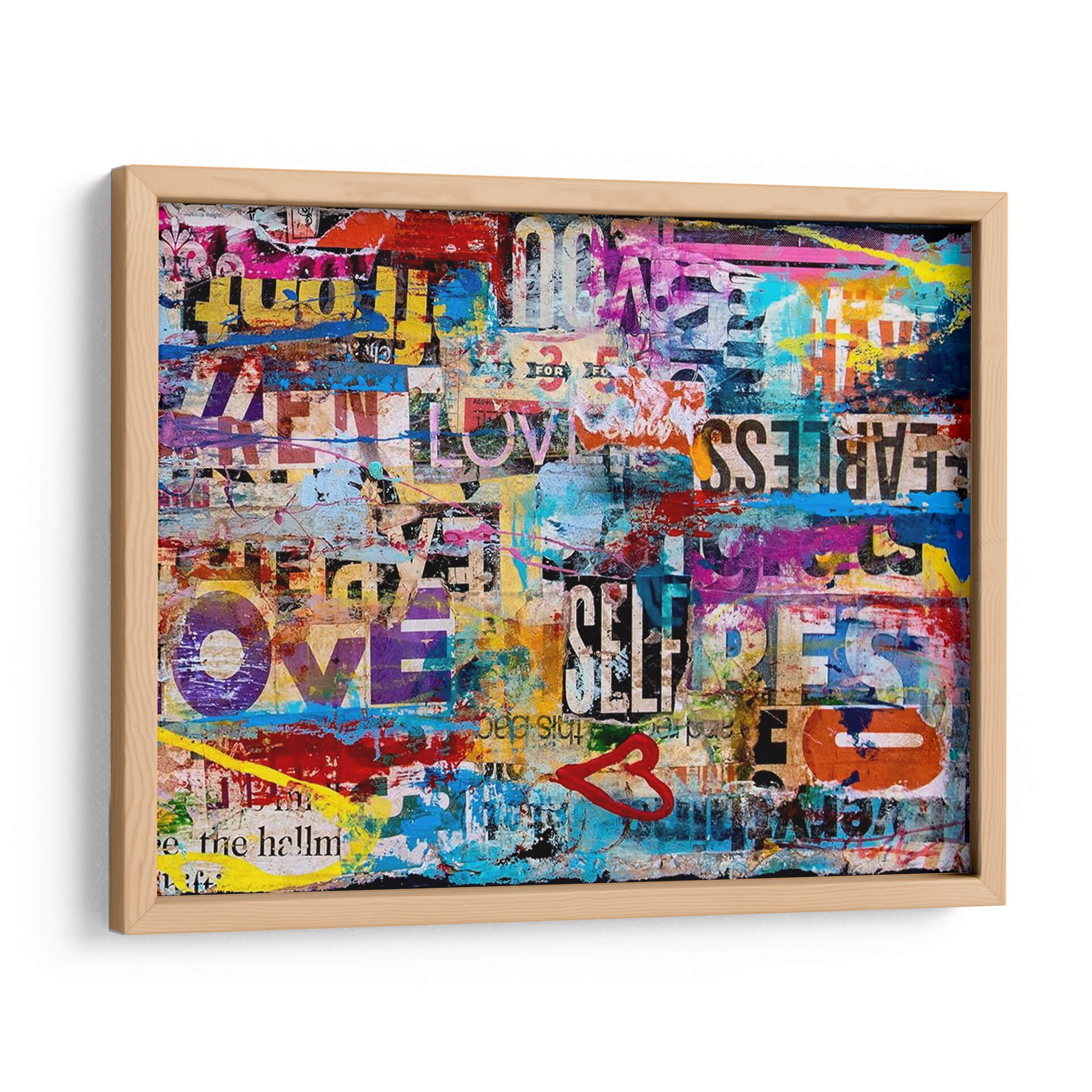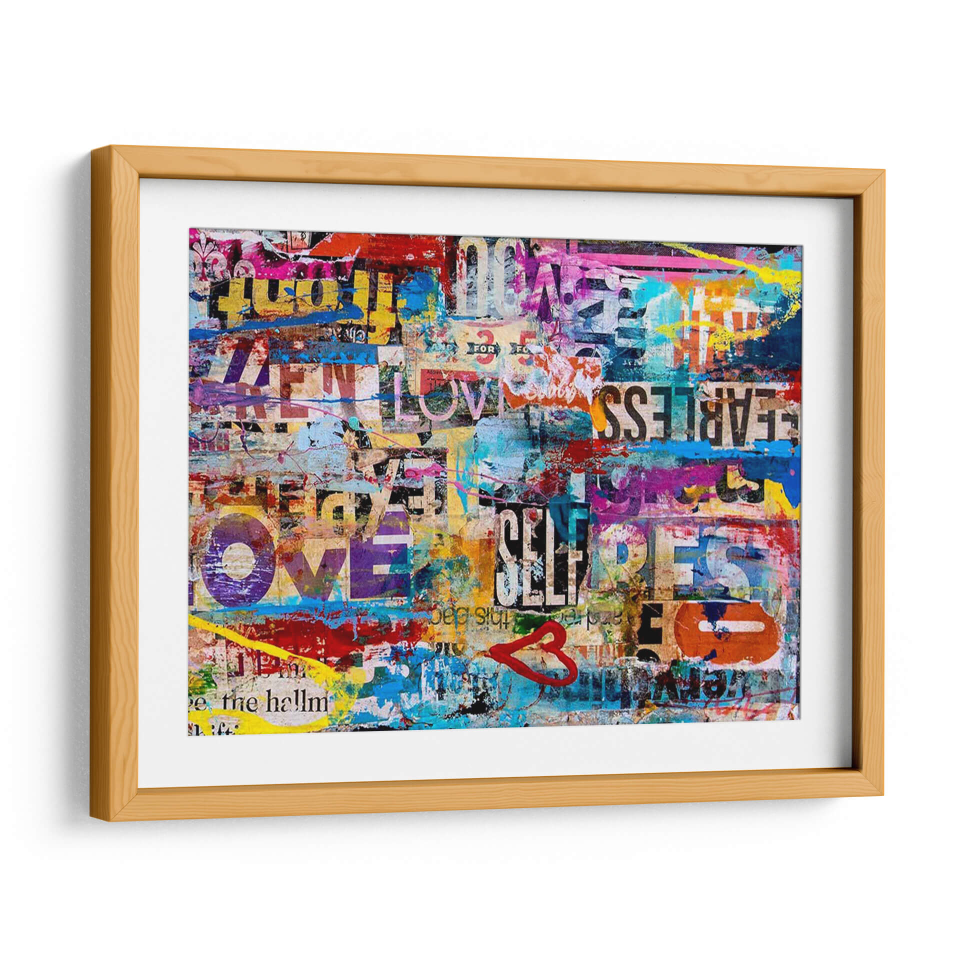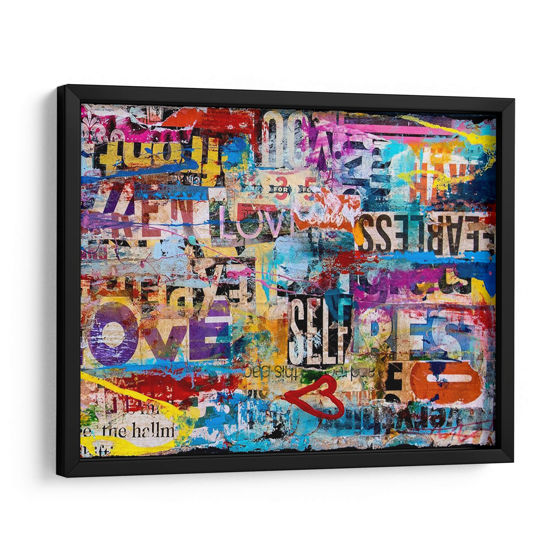 Sumérgete en la vibrante energía de "Metromix Luv II", una obra de arte contemporáneo que fusiona texto, color y emoción en una composición dinámica y cautivadora. Este cuadro decorativo es un collage urbano lleno de vida, donde fragmentos de palabras como "LOVE", "FEARLESS" y "SELF" se entrelazan con salpicaduras de pintura audaces en tonos vibrantes de azul eléctrico, amarillo brillante, rosa intenso y rojo apasionado. La técnica de collage y esténcil crea una textura visual rica, evocando la estética del arte callejero y la publicidad urbana. "Metromix Luv II" no es solo una pieza decorativa, sino una declaración de estilo que inyecta optimismo y modernidad en cualquier espacio. Su naturaleza abstracta y llena de mensajes positivos lo convierte en el punto focal perfecto para salas de estar modernas, oficinas creativas o cualquier lugar donde se desee añadir un toque de audacia y positividad. Deja que esta explosión de color y mensaje inspire conversaciones y eleve la atmósfera de tu hogar u oficina.