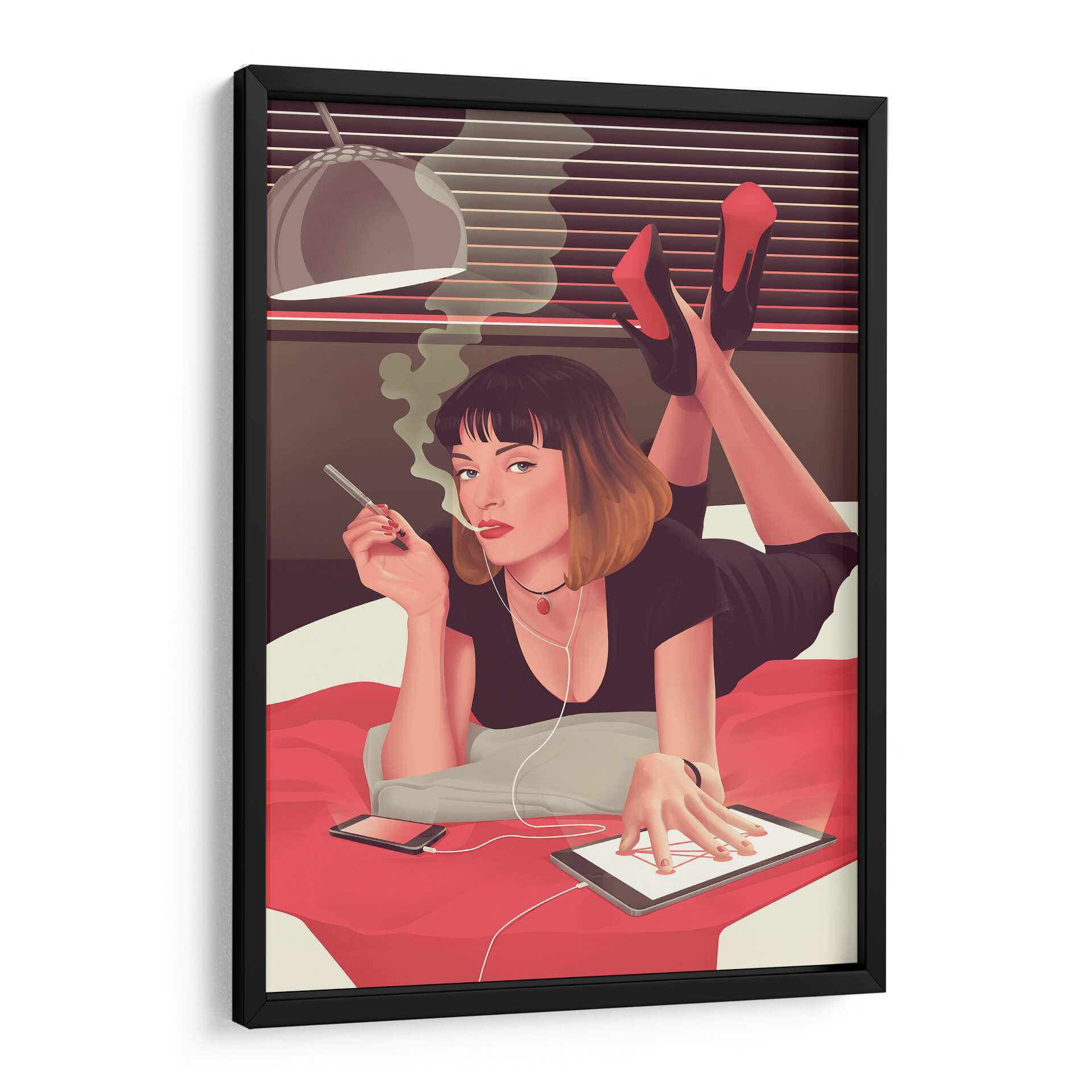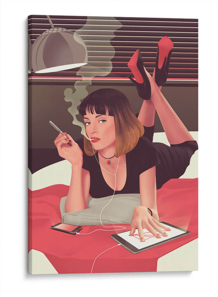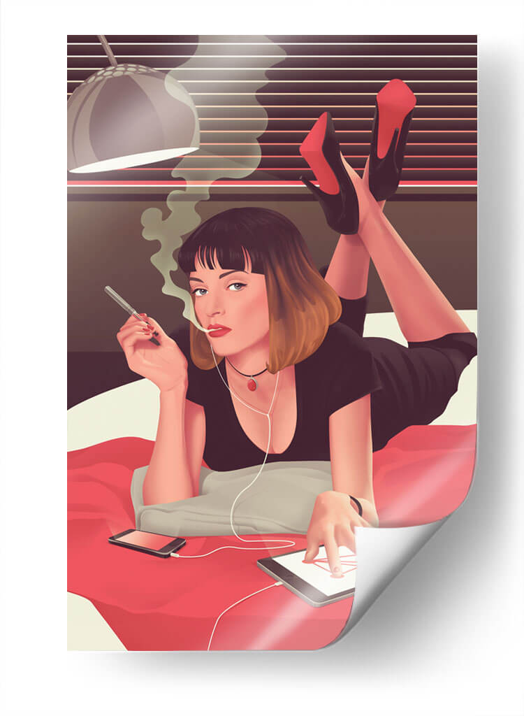 Sumérgete en la atmósfera cautivadora de "Mia siendo Mia", un cuadro decorativo que captura un momento de introspección moderna. Esta obra de arte presenta a una mujer recostada, envuelta en el humo de un cigarrillo, con auriculares conectados a una tablet. La paleta de colores, dominada por tonos cálidos y terrosos con acentos vibrantes de rojo en los tacones y el collar, crea un ambiente íntimo y a la vez enigmático. La composición, que resalta la figura central y su interacción con la tecnología, evoca una sensación de conexión contemporánea y estilo personal. Ideal para aquellos que buscan añadir un toque de sofisticación y un aire de misterio a su hogar u oficina, este cuadro decorativo es perfecto para salas de estar modernas, estudios personales o dormitorios que buscan un punto focal único. Su estilo distintivo, que combina elementos figurativos con un toque de arte pop, asegura que sea una pieza de conversación. Transforma tu espacio con este retrato intrigante que celebra la individualidad y la estética moderna.