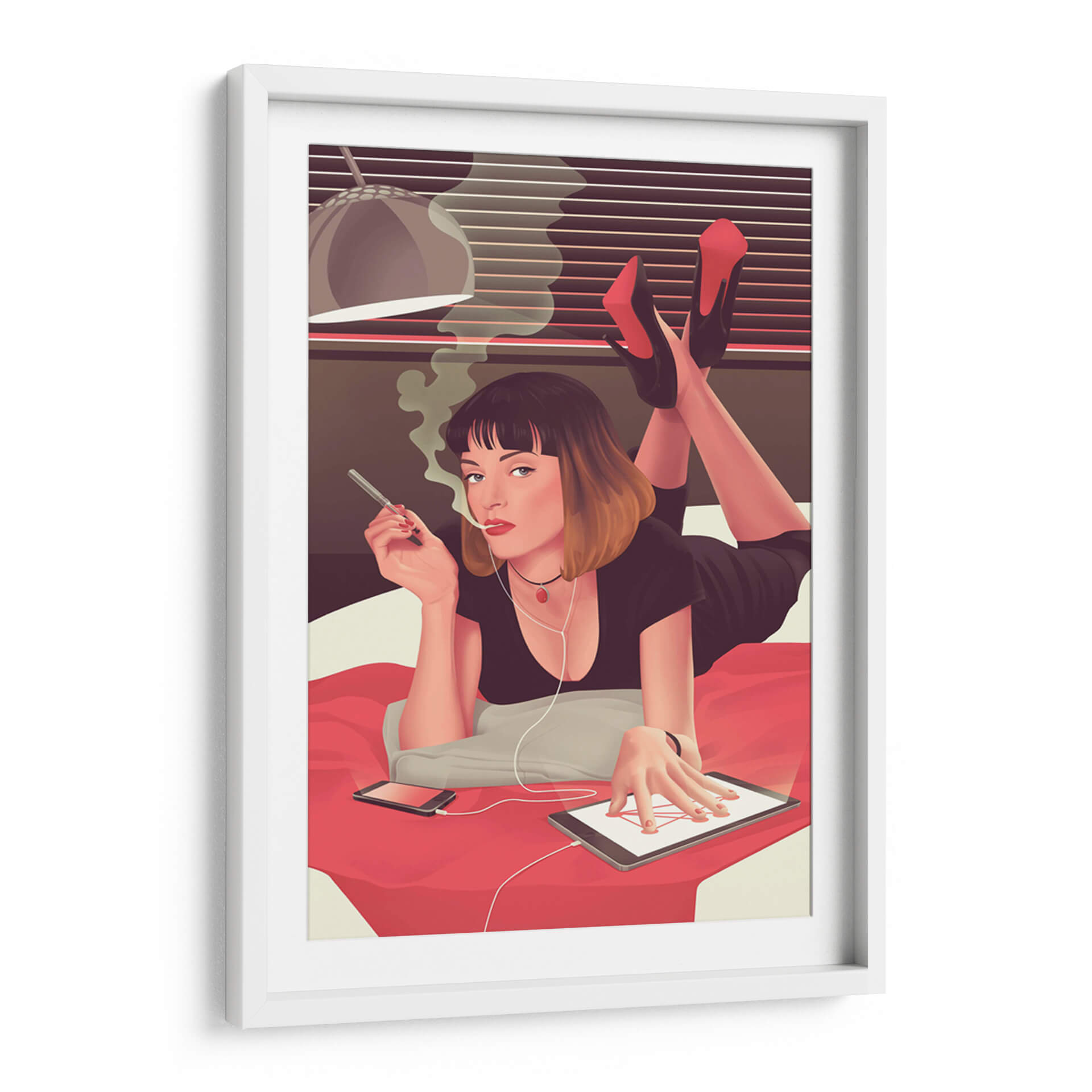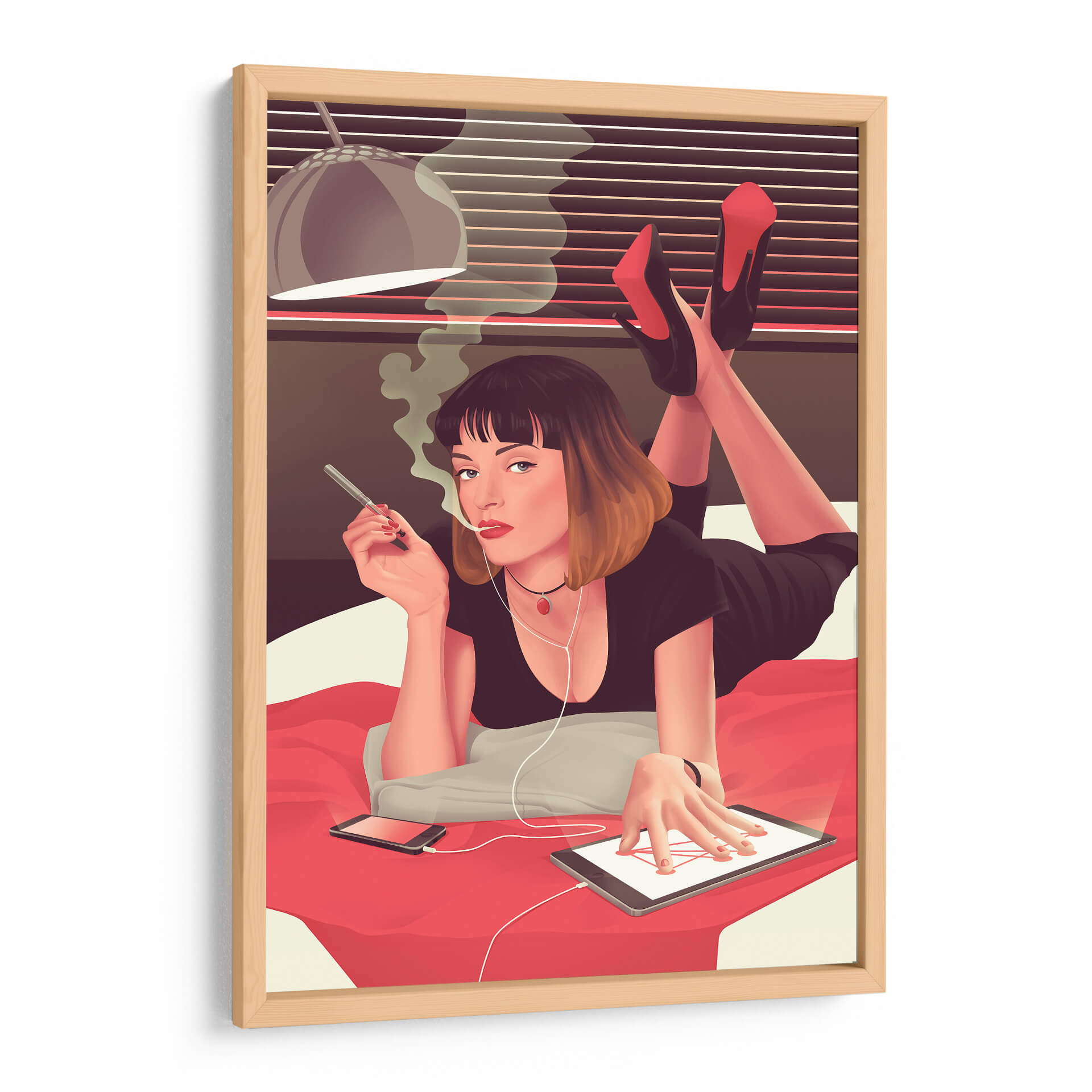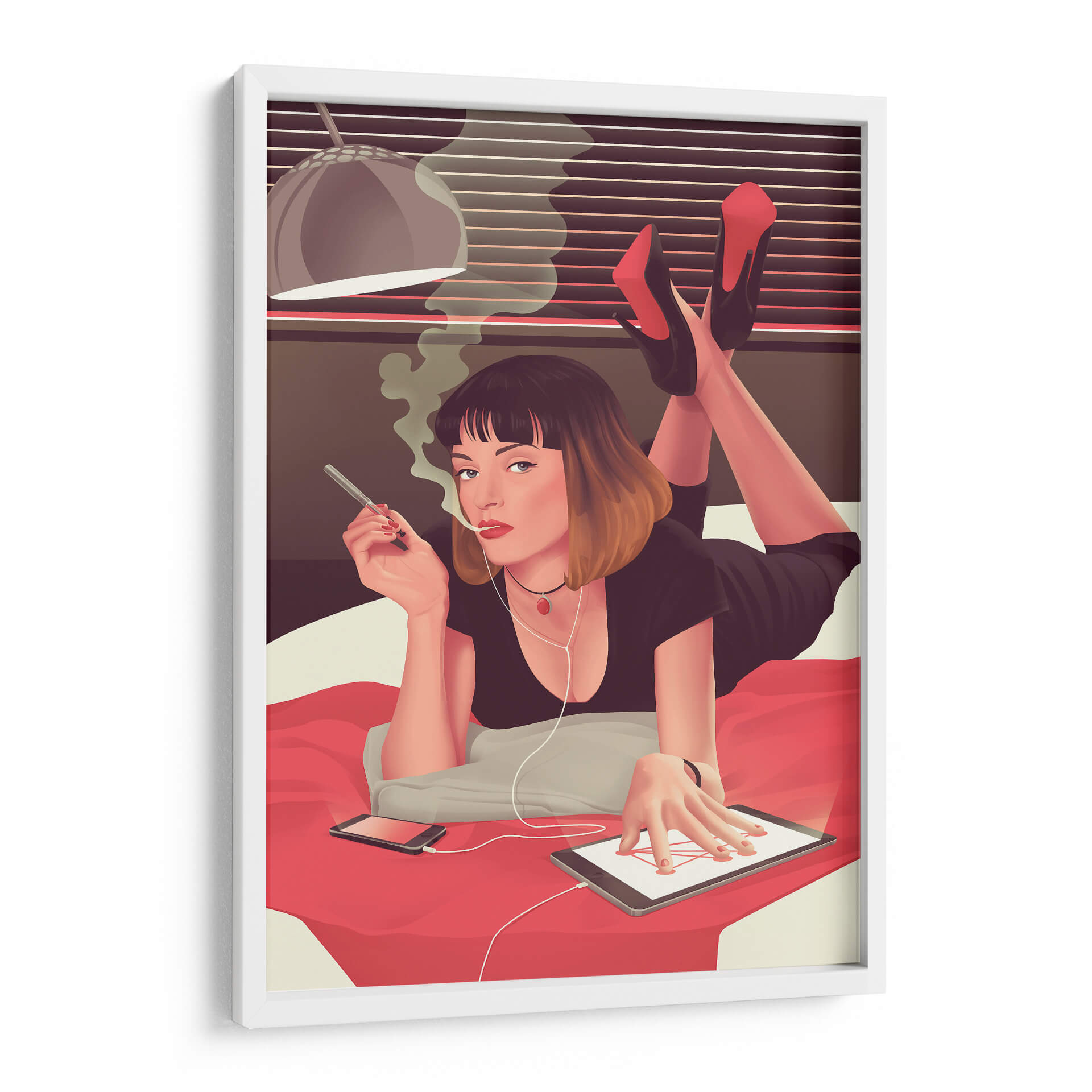Sumérgete en la atmósfera cautivadora de "Mia siendo Mia", un cuadro decorativo que captura un momento de introspección moderna. Esta obra de arte presenta a una mujer recostada, envuelta en el humo de un cigarrillo, con auriculares conectados a una tablet. La paleta de colores, dominada por tonos cálidos y terrosos con acentos vibrantes de rojo en los tacones y el collar, crea un ambiente íntimo y a la vez enigmático. La composición, que resalta la figura central y su interacción con la tecnología, evoca una sensación de conexión contemporánea y estilo personal. Ideal para aquellos que buscan añadir un toque de sofisticación y un aire de misterio a su hogar u oficina, este cuadro decorativo es perfecto para salas de estar modernas, estudios personales o dormitorios que buscan un punto focal único. Su estilo distintivo, que combina elementos figurativos con un toque de arte pop, asegura que sea una pieza de conversación. Transforma tu espacio con este retrato intrigante que celebra la individualidad y la estética moderna.