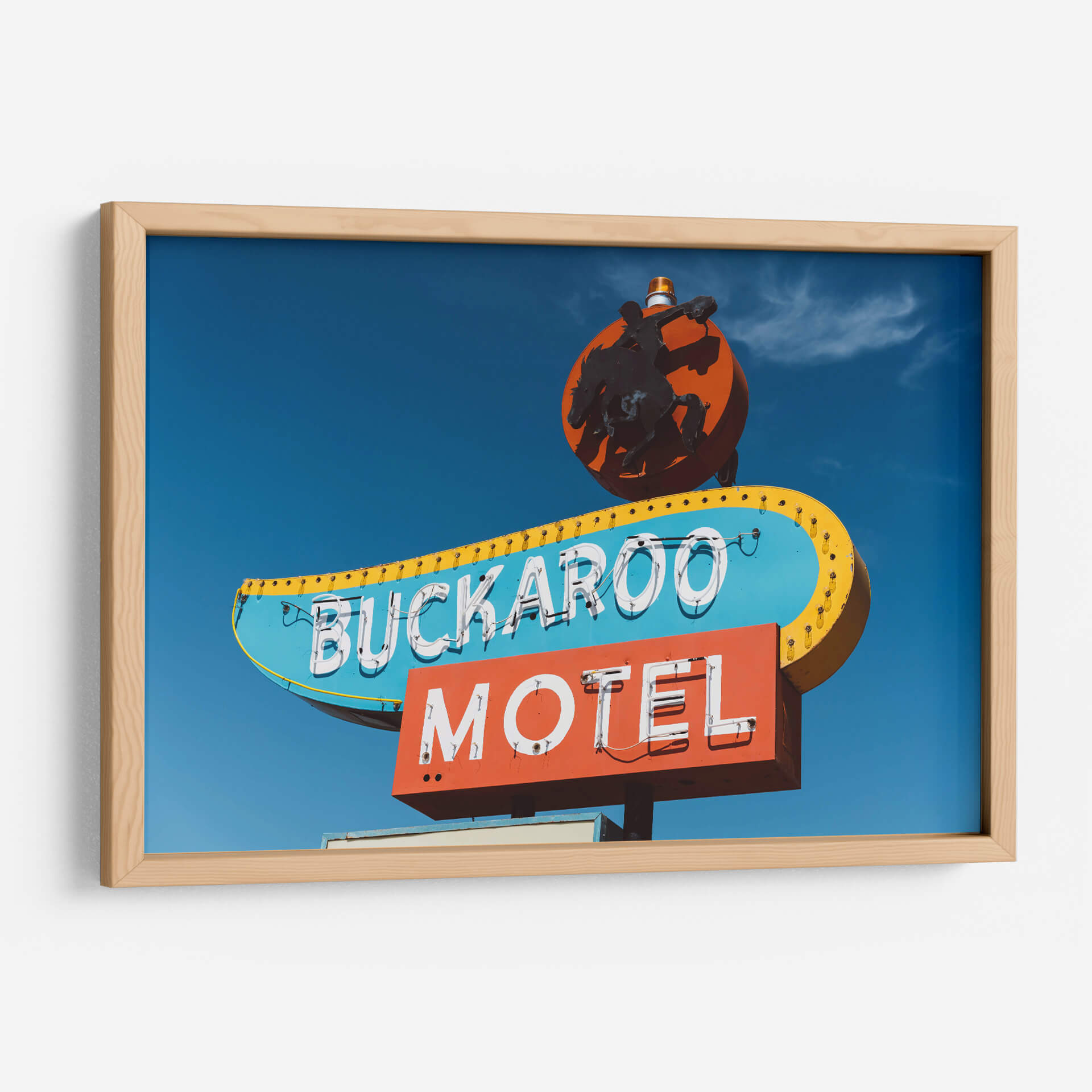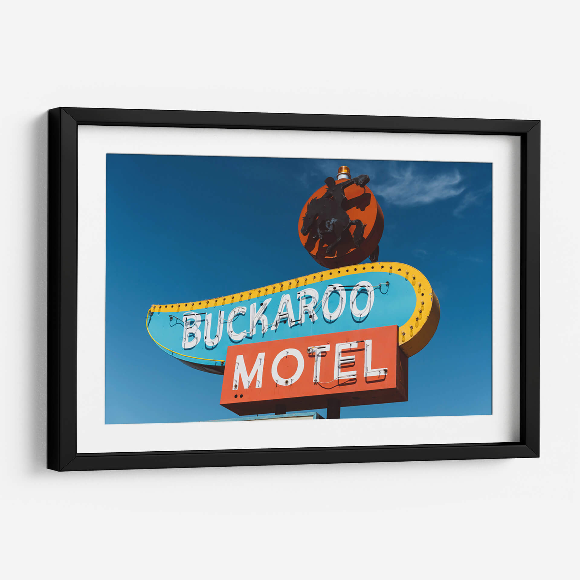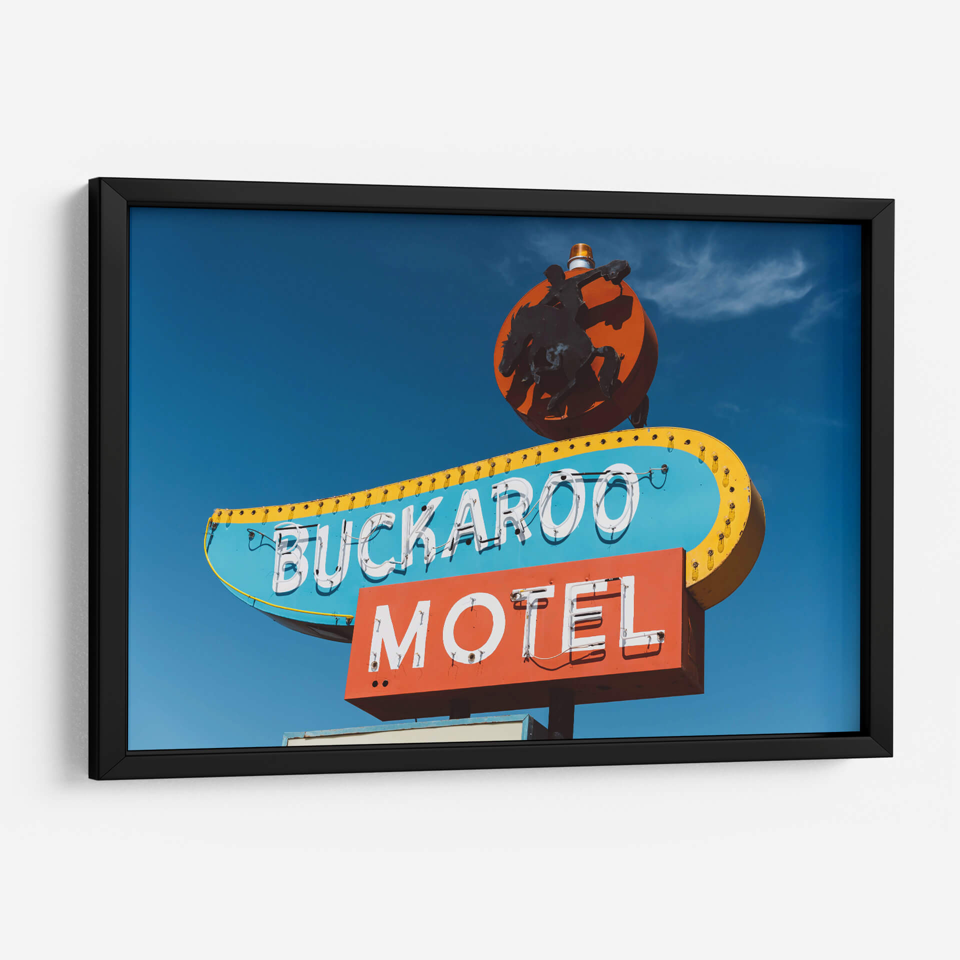 Sumérgete en la nostalgia y el encanto del viejo oeste con "Motel Buckaroo", una obra de arte que captura la esencia de los icónicos letreros de neón de América. Este cuadro decorativo presenta un vibrante letrero de motel, con las palabras "Buckaroo Motel" iluminadas en neón blanco sobre un fondo azul celeste y naranja intenso. En la parte superior, un círculo naranja audaz muestra la silueta de un jinete y su caballo, evocando imágenes de aventuras y paisajes desérticos. La paleta de colores, dominada por el azul profundo del cielo y los tonos cálidos y llamativos del letrero, crea un contraste dinámico y visualmente atractivo. El estilo, que recuerda a la fotografía vintage y al arte pop, convierte a esta pieza en un punto focal perfecto para cualquier espacio que busque un toque de carácter retro, estilo americano o un guiño a la cultura del motociclismo y los viajes por carretera. Ideal para decorar salas de estar, estudios, o incluso un bar temático, "Motel Buckaroo" infunde una atmósfera de aventura y autenticidad.