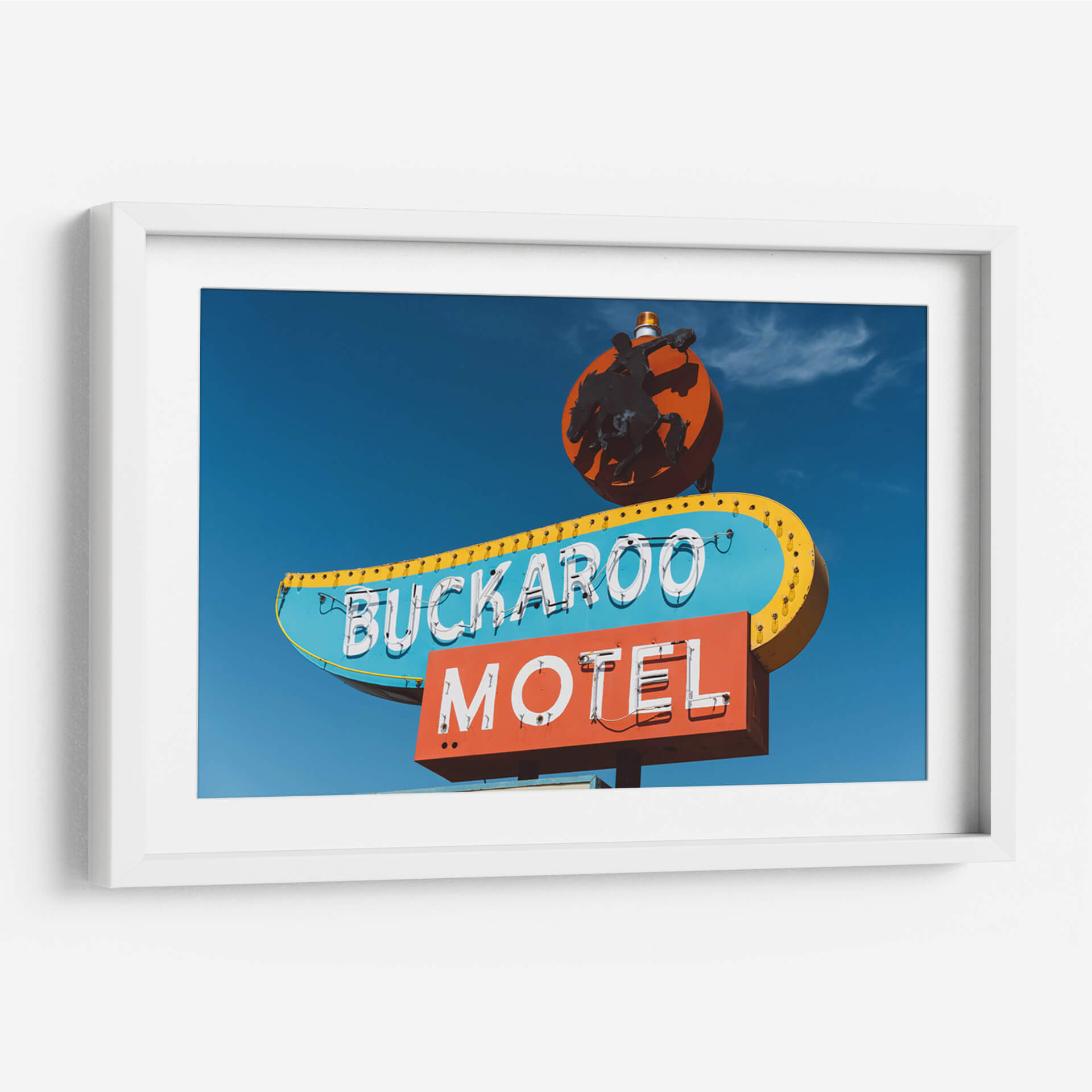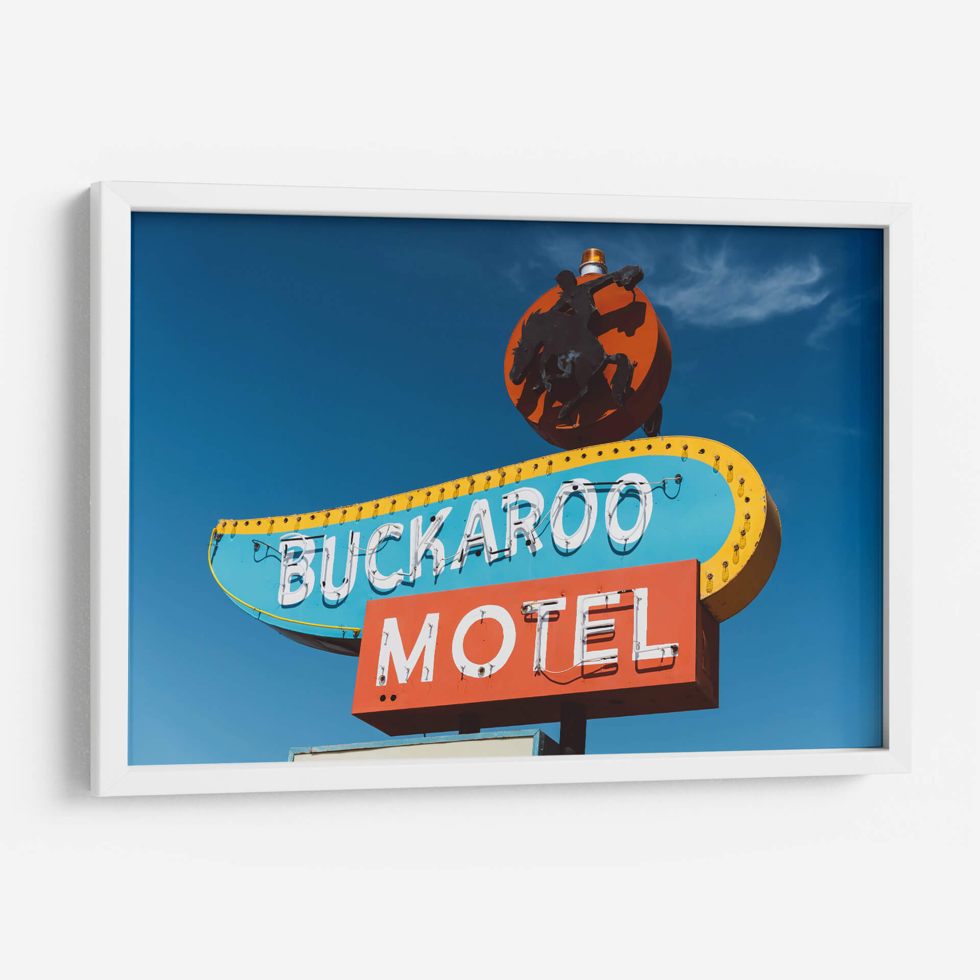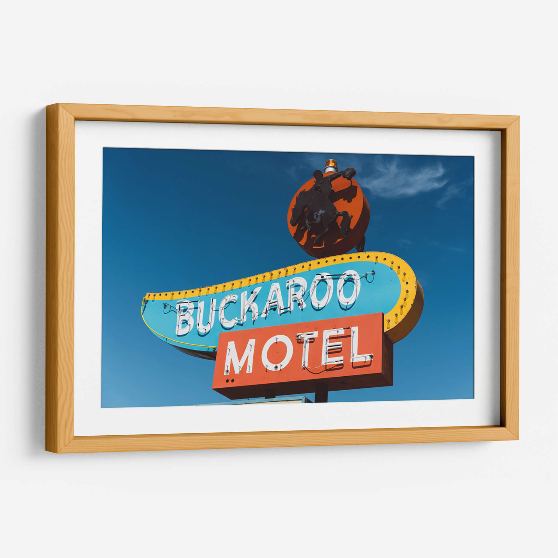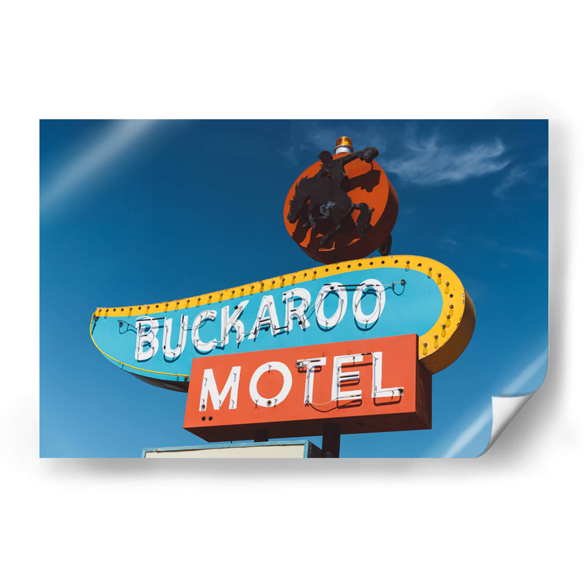 Sumérgete en la nostalgia y el encanto del viejo oeste con "Motel Buckaroo", una obra de arte que captura la esencia de los icónicos letreros de neón de América. Este cuadro decorativo presenta un vibrante letrero de motel, con las palabras "Buckaroo Motel" iluminadas en neón blanco sobre un fondo azul celeste y naranja intenso. En la parte superior, un círculo naranja audaz muestra la silueta de un jinete y su caballo, evocando imágenes de aventuras y paisajes desérticos. La paleta de colores, dominada por el azul profundo del cielo y los tonos cálidos y llamativos del letrero, crea un contraste dinámico y visualmente atractivo. El estilo, que recuerda a la fotografía vintage y al arte pop, convierte a esta pieza en un punto focal perfecto para cualquier espacio que busque un toque de carácter retro, estilo americano o un guiño a la cultura del motociclismo y los viajes por carretera. Ideal para decorar salas de estar, estudios, o incluso un bar temático, "Motel Buckaroo" infunde una atmósfera de aventura y autenticidad.