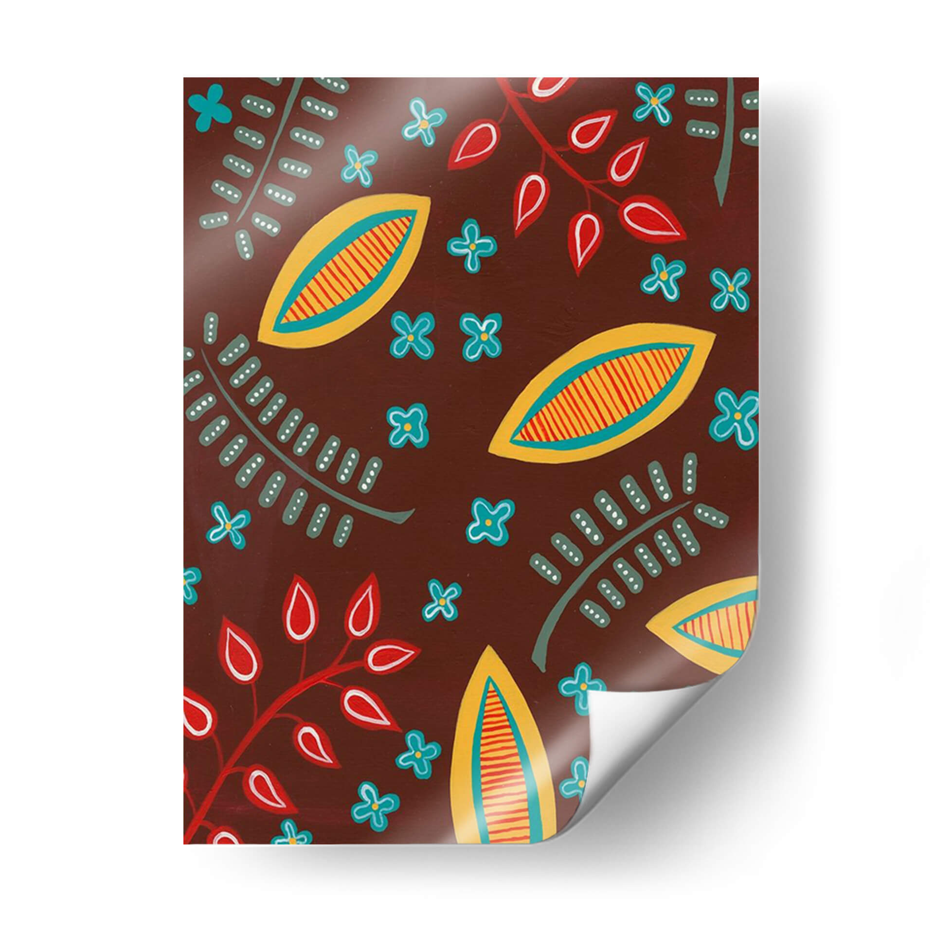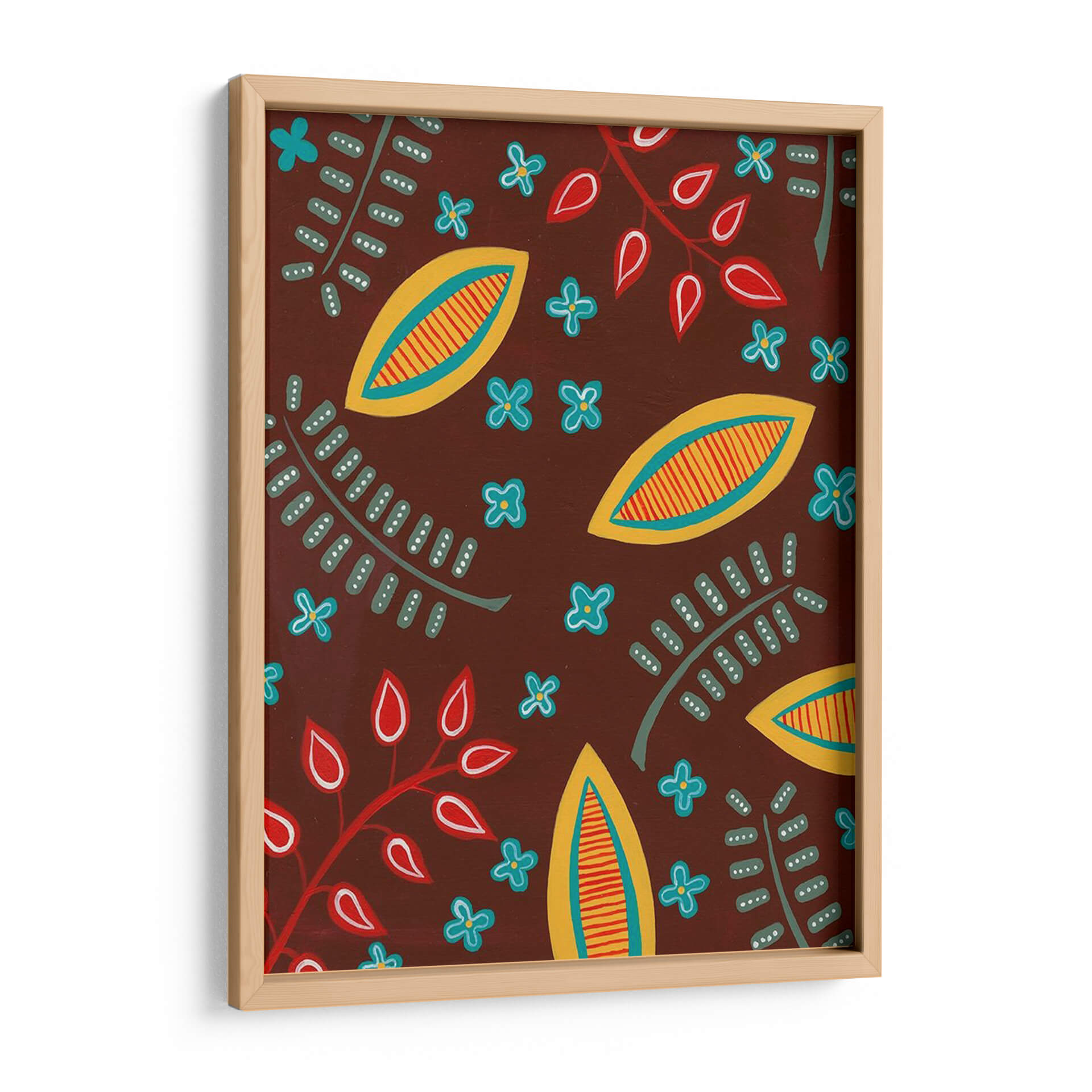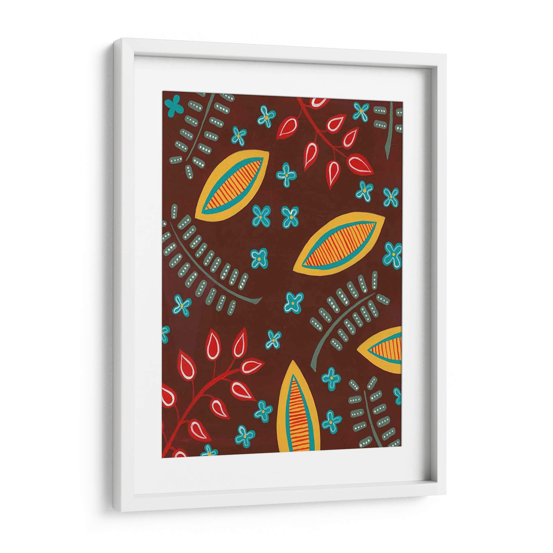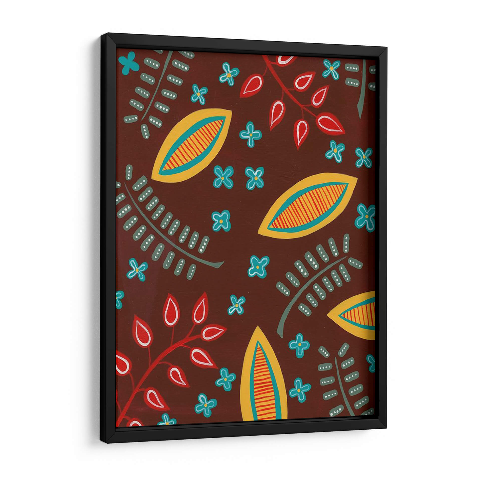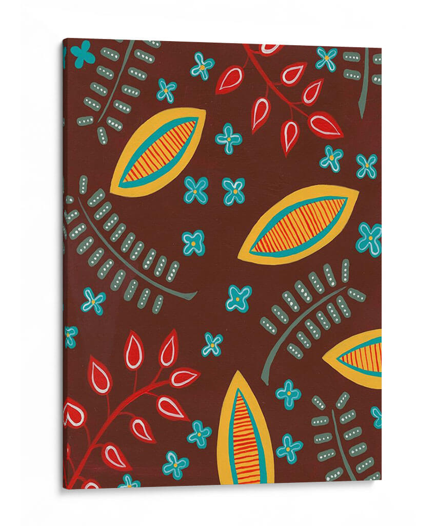 Adéntrate en un universo de formas y colores vibrantes con "Motivo Estilizado I", una obra de arte contemporáneo de Regina Moore. Este cuadro decorativo presenta un patrón cautivador y dinámico, donde elementos botánicos estilizados se entrelazan con formas abstractas que evocan la naturaleza de una manera única y moderna. La paleta de colores, dominada por un rico tono tierra que sirve de fondo, se ilumina con toques de amarillo sol, rojo pasión y azul cielo, creando un contraste visualmente estimulante. Las formas alargadas, parecidas a semillas o frutos, y las delicadas flores de cuatro pétalos, junto con las ramas con hojas simplificadas, componen una sinfonía visual que transmite una sensación de vitalidad y alegría. El estilo es claramente contemporáneo, con un toque orgánico y ligeramente rústico que lo hace accesible y atractivo. La composición, un patrón repetitivo pero con variaciones sutiles, genera un ritmo visual que mantiene el interés del espectador. "Motivo Estilizado I" es ideal para añadir un punto de interés y personalidad a cualquier espacio, ya sea una sala de estar moderna, un comedor acogedor o una oficina creativa. Este cuadro decorativo es perfecto para quienes buscan piezas de arte que inspiren optimismo y conexión con la naturaleza, aportando un toque de diseño único y artístico a su decoración.