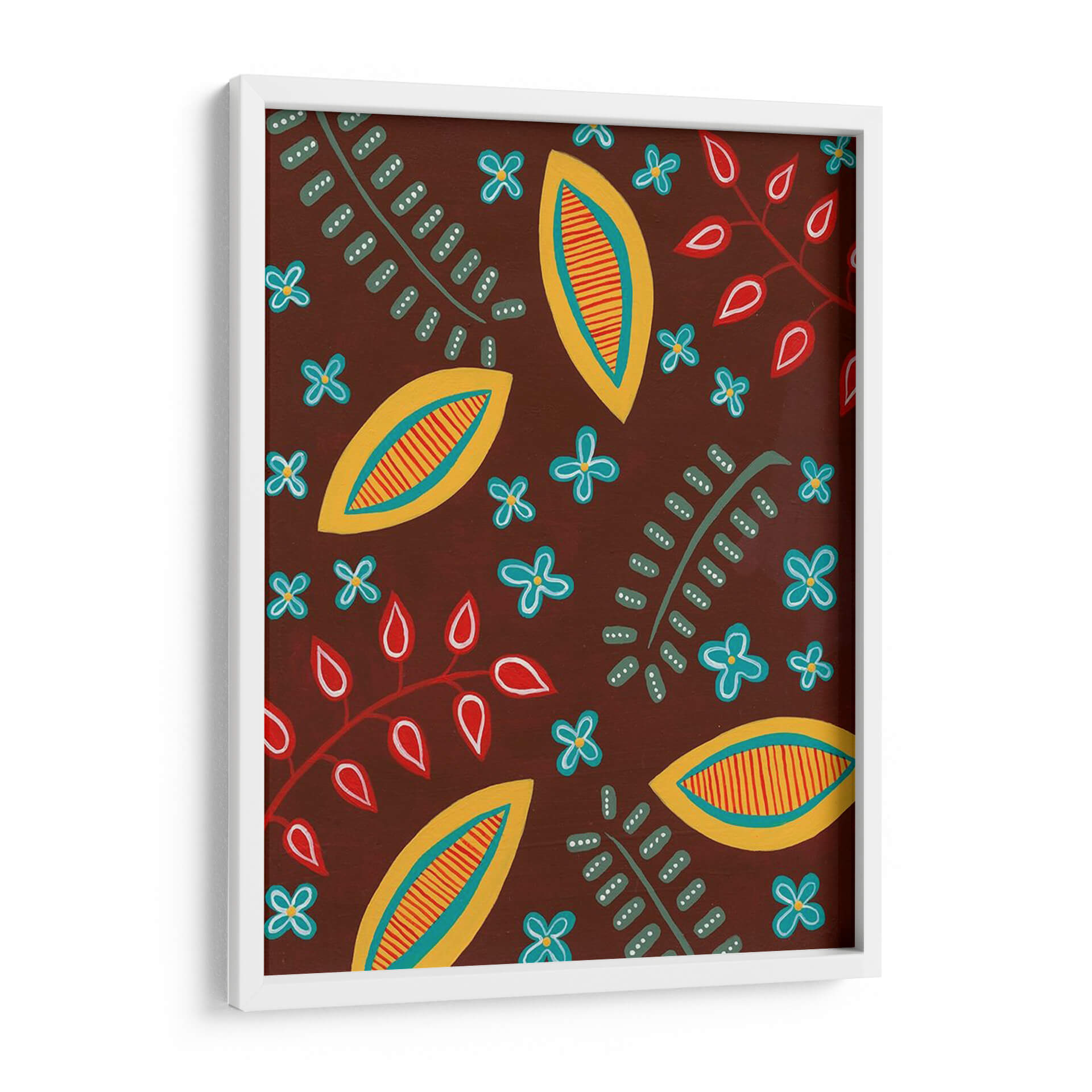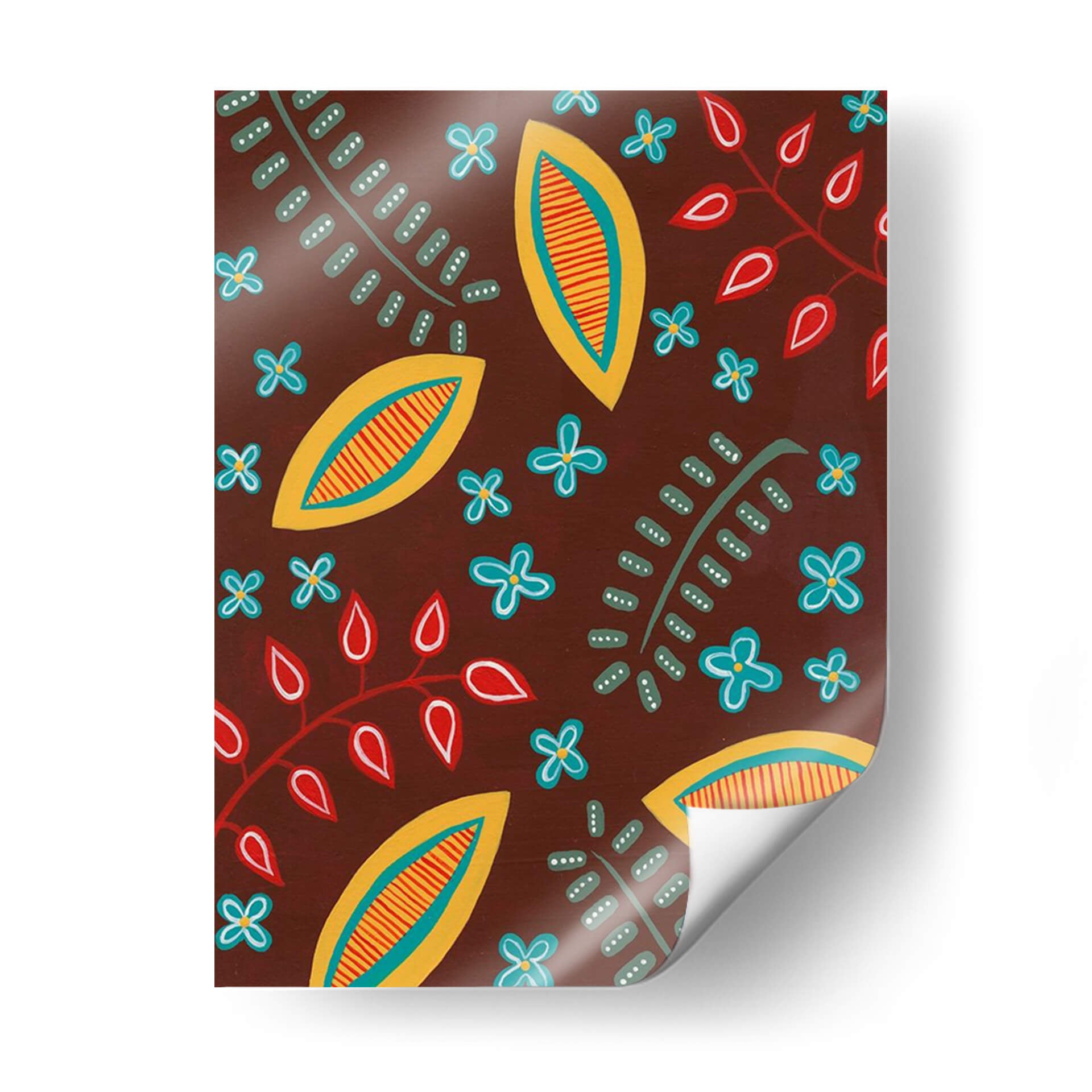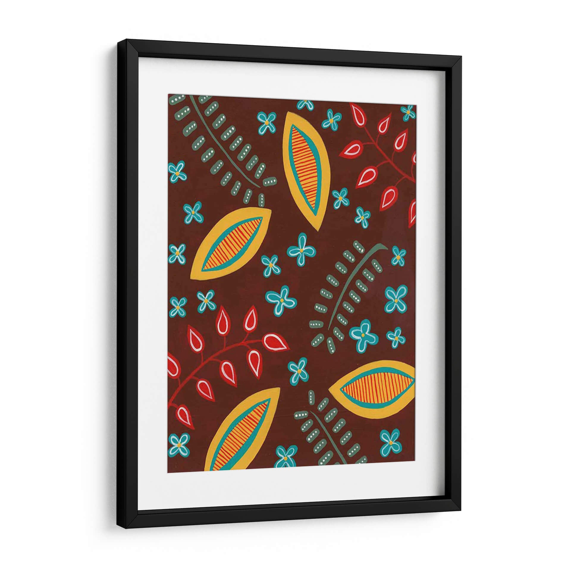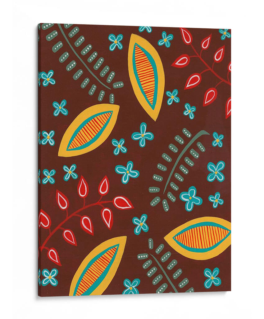 Sumérgete en la vibrante y orgánica belleza de "Motivo Estilizado II" de Regina Moore, un cuadro decorativo que transforma cualquier espacio con su encantador patrón botánico. Esta obra captura la esencia de la naturaleza estilizada a través de formas audaces y una paleta de colores terrosos y alegres. El fondo marrón profundo sirve como un lienzo rico para las hojas y flores que parecen danzar en un ritmo visual cautivador. Las formas alargadas de color amarillo y turquesa, reminiscentes de vainas o semillas, contrastan maravillosamente con las delicadas flores en forma de trébol y las ramas rojas con contornos sutiles. La repetición rítmica de estos elementos crea una sensación de armonía y movimiento, invitando a la contemplación. El estilo artístico, que combina elementos del arte folclórico con un enfoque moderno, lo hace perfecto para una variedad de decoraciones, desde lo bohemio hasta lo contemporáneo. Este cuadro decorativo es ideal para añadir un toque de color y vida a salones, dormitorios o estudios, aportando una atmósfera de calidez y conexión con la naturaleza. Su diseño único y su ejecución artística lo convierten en una pieza central que no pasará desapercibida.