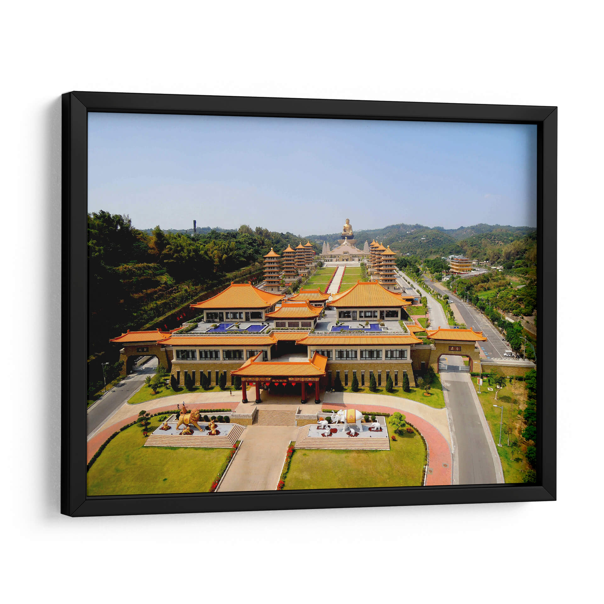 Embárquese en un viaje visual hacia la majestuosidad y la serenidad con este impactante cuadro decorativo del Museo del Buda Fo Guang Shan. La obra captura una vista panorámica de este complejo arquitectónico, destacando sus tejas naranjas vibrantes, las estupas imponentes y la figura dorada del Buda que se alza en la distancia. La composición meticulosa guía la mirada a través de los jardines cuidados y las estructuras simétricas, creando una sensación de orden y paz. La paleta de colores, dominada por tonos cálidos de naranja, verdes exuberantes y el contraste del cielo azul claro, evoca una atmósfera de tranquilidad y espiritualidad. Este cuadro decorativo es ideal para infundir calma y un toque de sofisticación oriental en cualquier espacio, ya sea una sala de estar moderna, un estudio tranquilo o una oficina que busque inspiración. Su estilo fotorealista y su detallada representación lo convierten en una pieza de conversación, invitando a la contemplación y al aprecio por la belleza arquitectónica y la atmósfera de devoción. Añada un aire de serenidad y grandeza a su hogar u oficina con esta representación artística única.