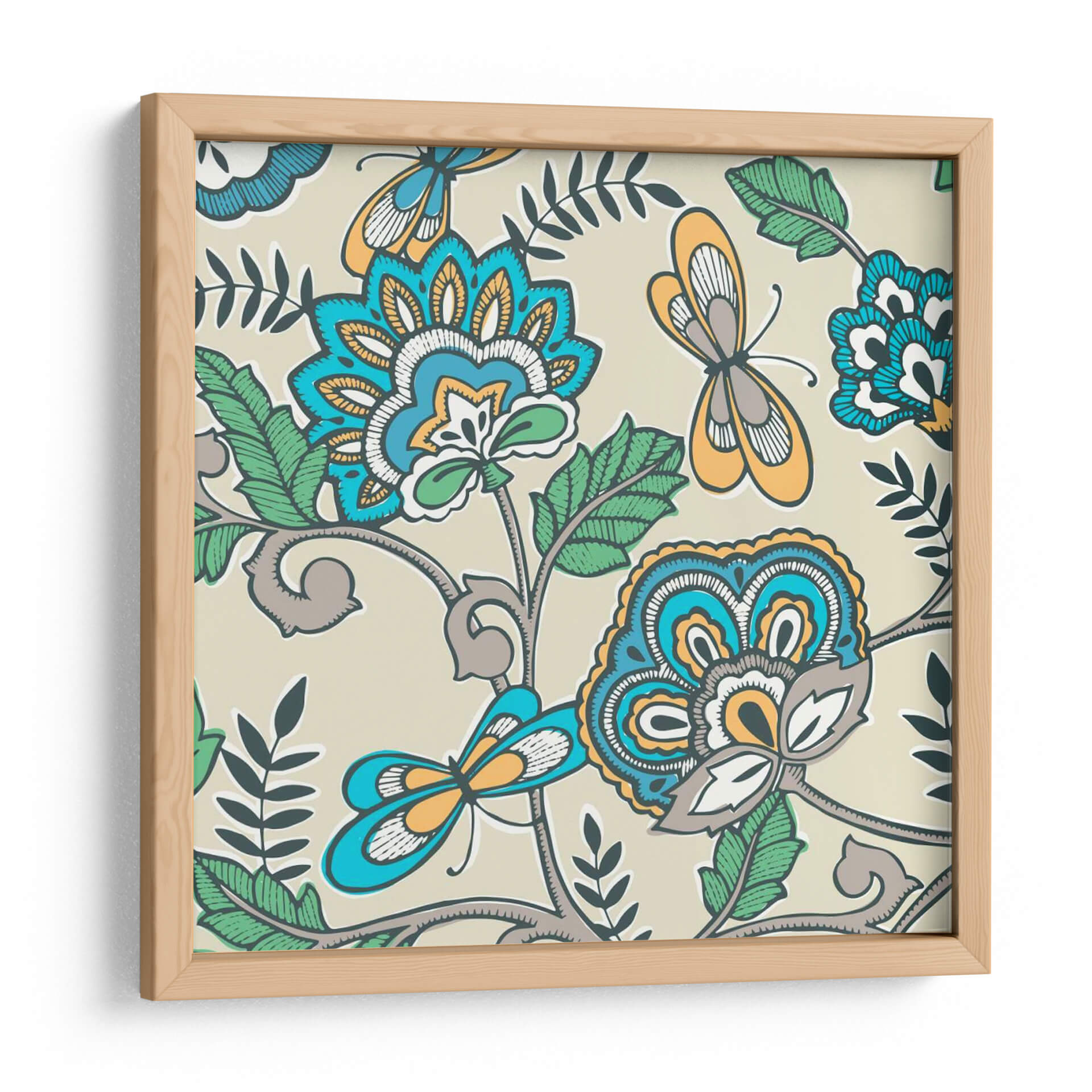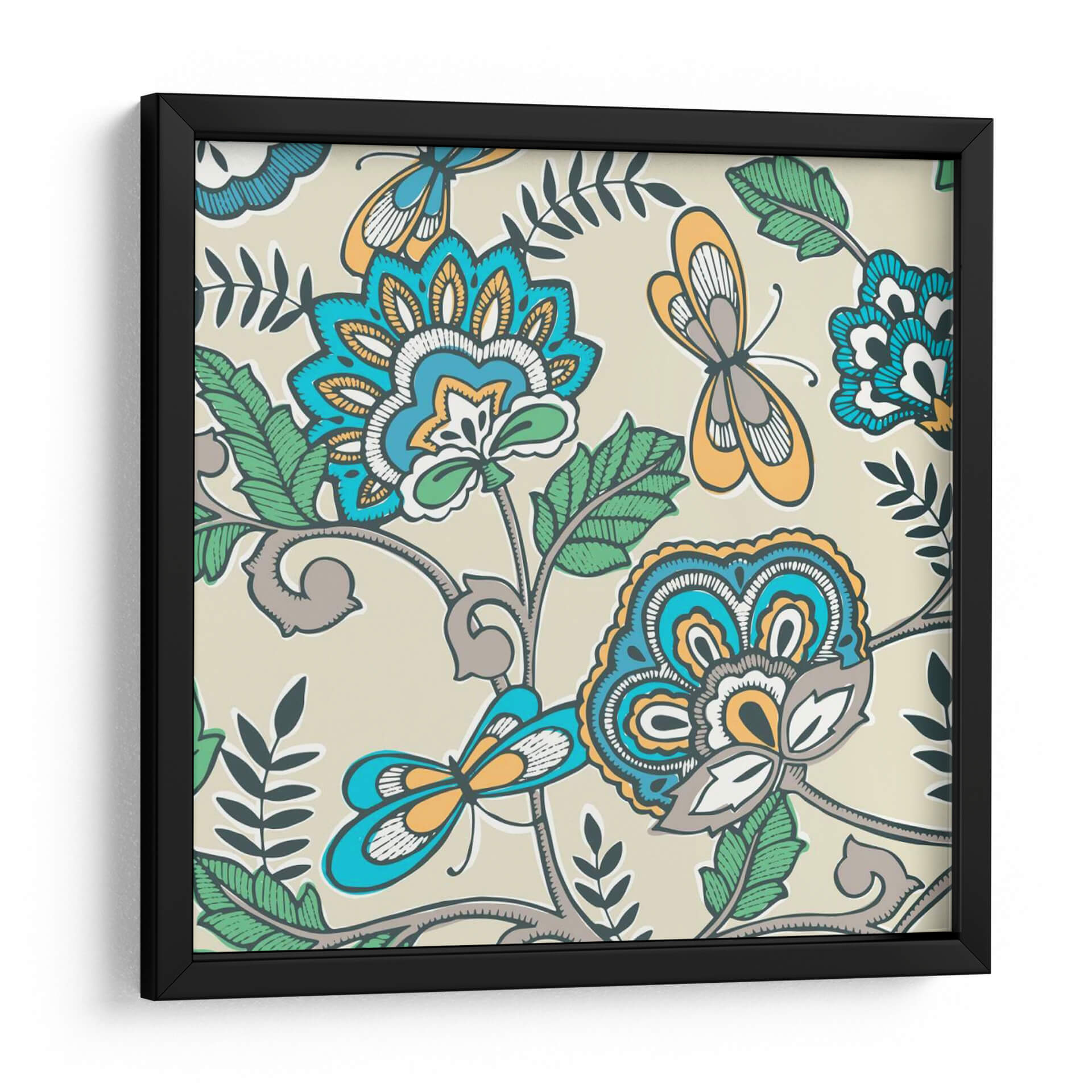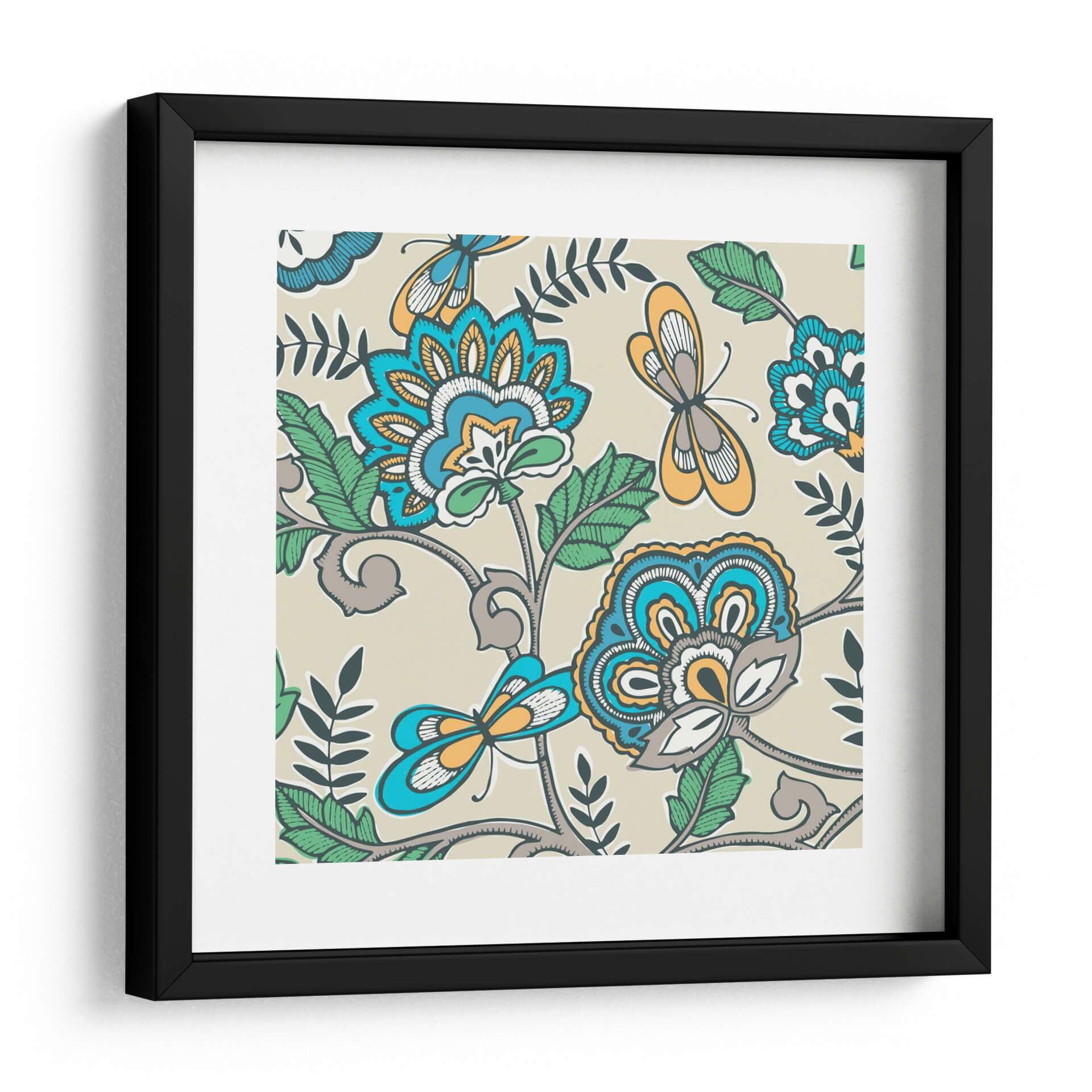 Transforma tu espacio con el vibrante y evocador cuadro decorativo "Namaste Floral II" de Diane Kappa. Esta obra de arte cautiva con su intrincado diseño floral y la delicada presencia de mariposas, todo ello presentado sobre un fondo neutro y sereno. La paleta de colores, que combina azules intensos, naranjas cálidos, verdes frescos y toques de gris y blanco, crea una armonía visual que atrae la mirada y estimula los sentidos. El estilo, que evoca patrones tradicionales con un toque contemporáneo, aporta una sensación de vitalidad y un aire exótico, pero a la vez familiar. Las formas estilizadas de las flores y los insectos, junto con las líneas fluidas y orgánicas de la vegetación, invitan a la contemplación y la calma. "Namaste Floral II" es la pieza perfecta para añadir un punto focal de interés a cualquier habitación, ya sea en una sala de estar moderna, un dormitorio acogedor o una oficina que busque inspiración. Su diseño versátil se integra fácilmente en diversas decoraciones, aportando personalidad y un toque de naturaleza estilizada que evoca tranquilidad y belleza.