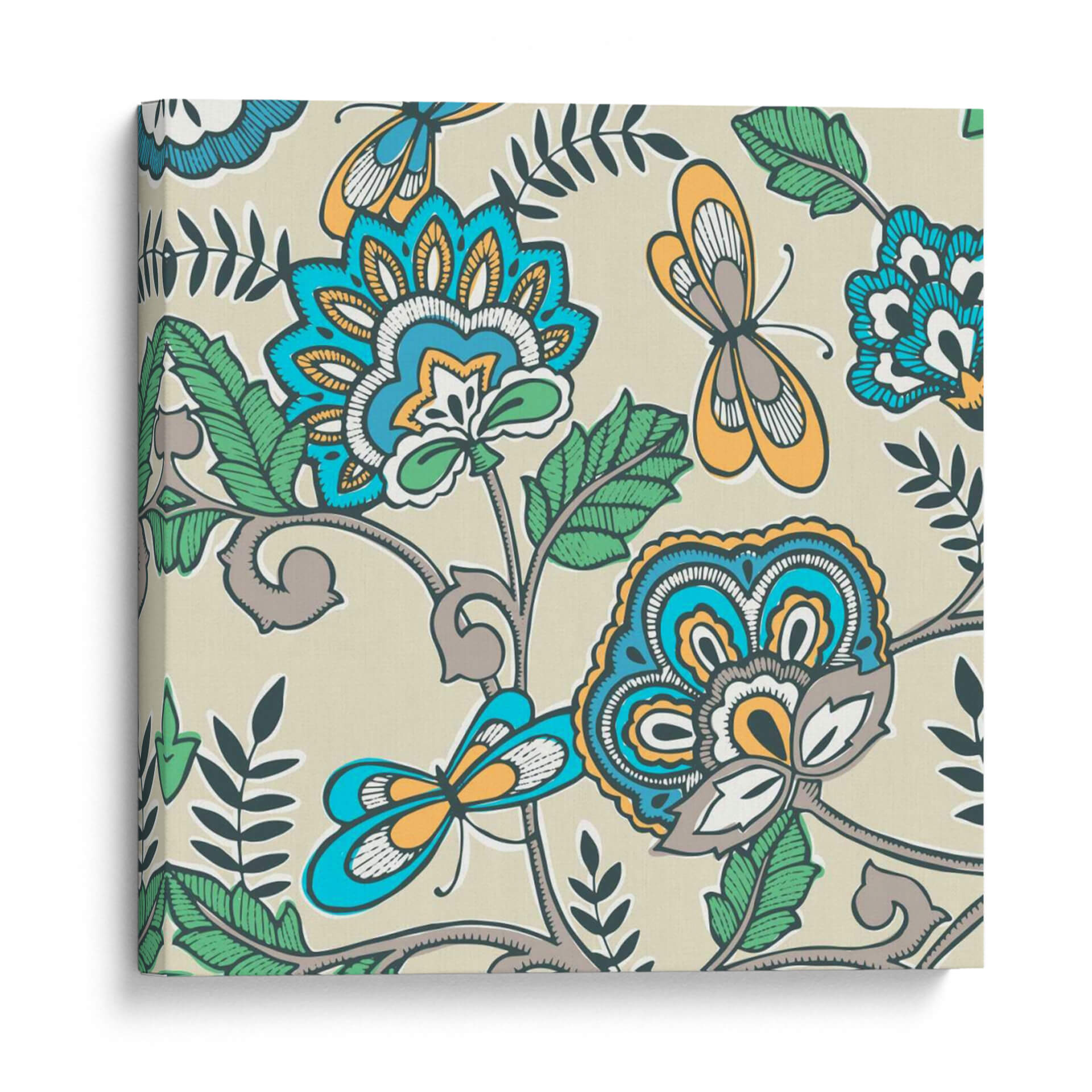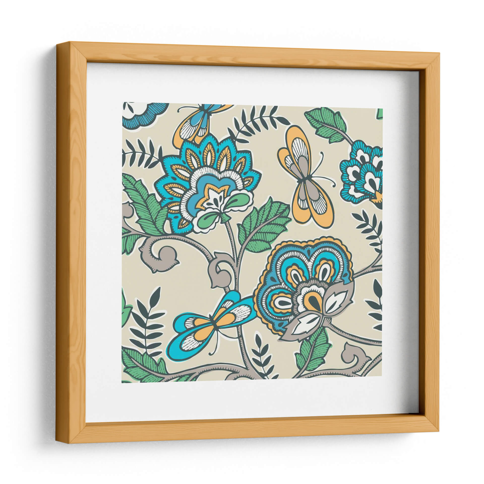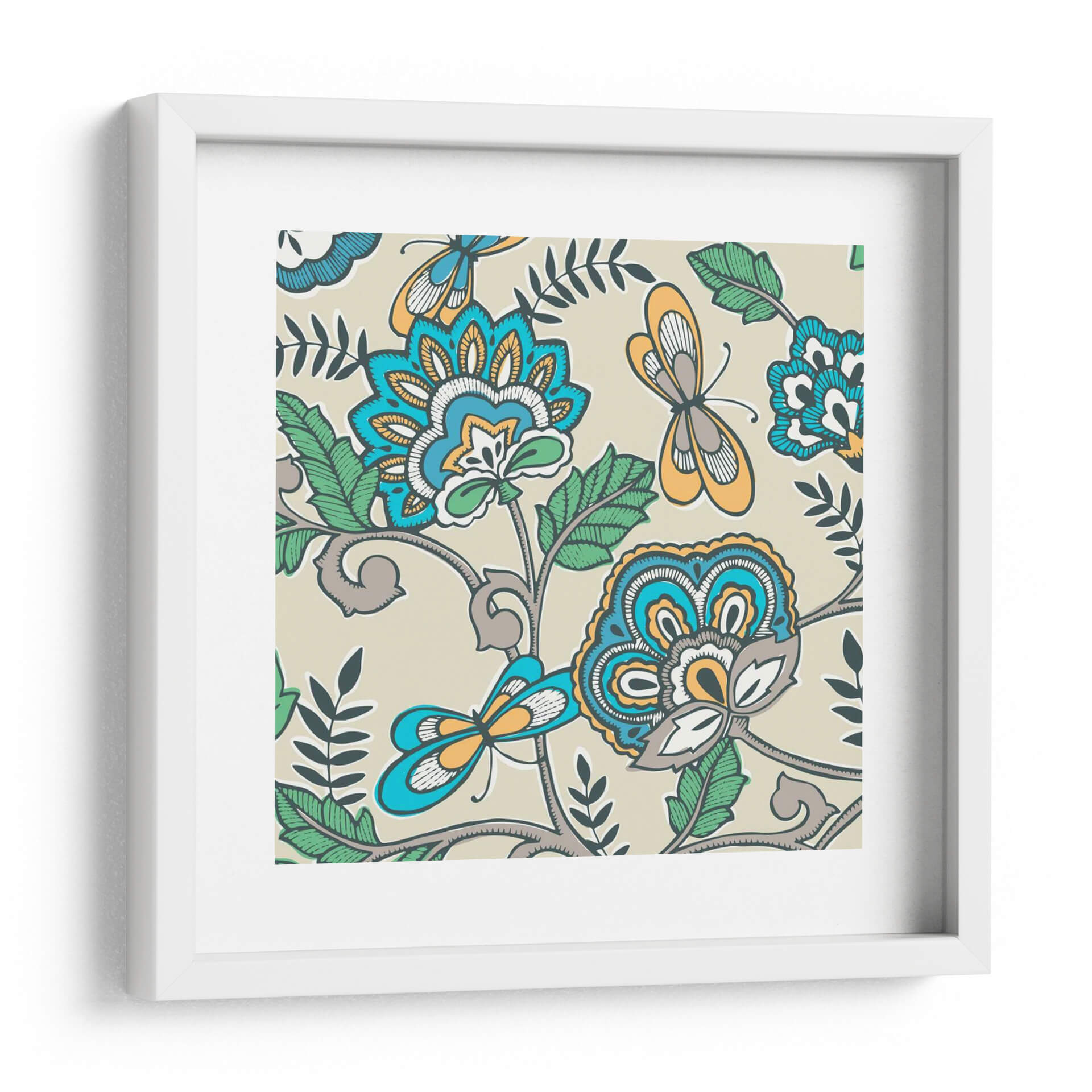 Transforma tu espacio con el vibrante y evocador cuadro decorativo "Namaste Floral II" de Diane Kappa. Esta obra de arte cautiva con su intrincado diseño floral y la delicada presencia de mariposas, todo ello presentado sobre un fondo neutro y sereno. La paleta de colores, que combina azules intensos, naranjas cálidos, verdes frescos y toques de gris y blanco, crea una armonía visual que atrae la mirada y estimula los sentidos. El estilo, que evoca patrones tradicionales con un toque contemporáneo, aporta una sensación de vitalidad y un aire exótico, pero a la vez familiar. Las formas estilizadas de las flores y los insectos, junto con las líneas fluidas y orgánicas de la vegetación, invitan a la contemplación y la calma. "Namaste Floral II" es la pieza perfecta para añadir un punto focal de interés a cualquier habitación, ya sea en una sala de estar moderna, un dormitorio acogedor o una oficina que busque inspiración. Su diseño versátil se integra fácilmente en diversas decoraciones, aportando personalidad y un toque de naturaleza estilizada que evoca tranquilidad y belleza.