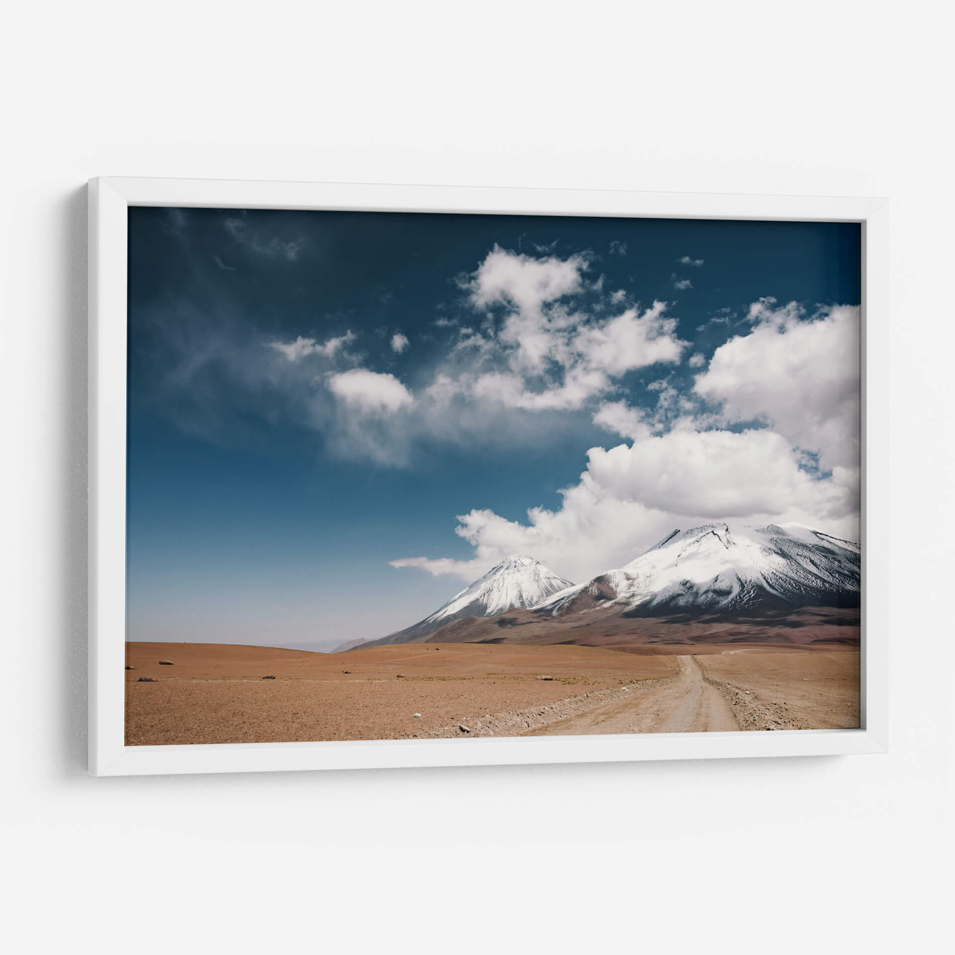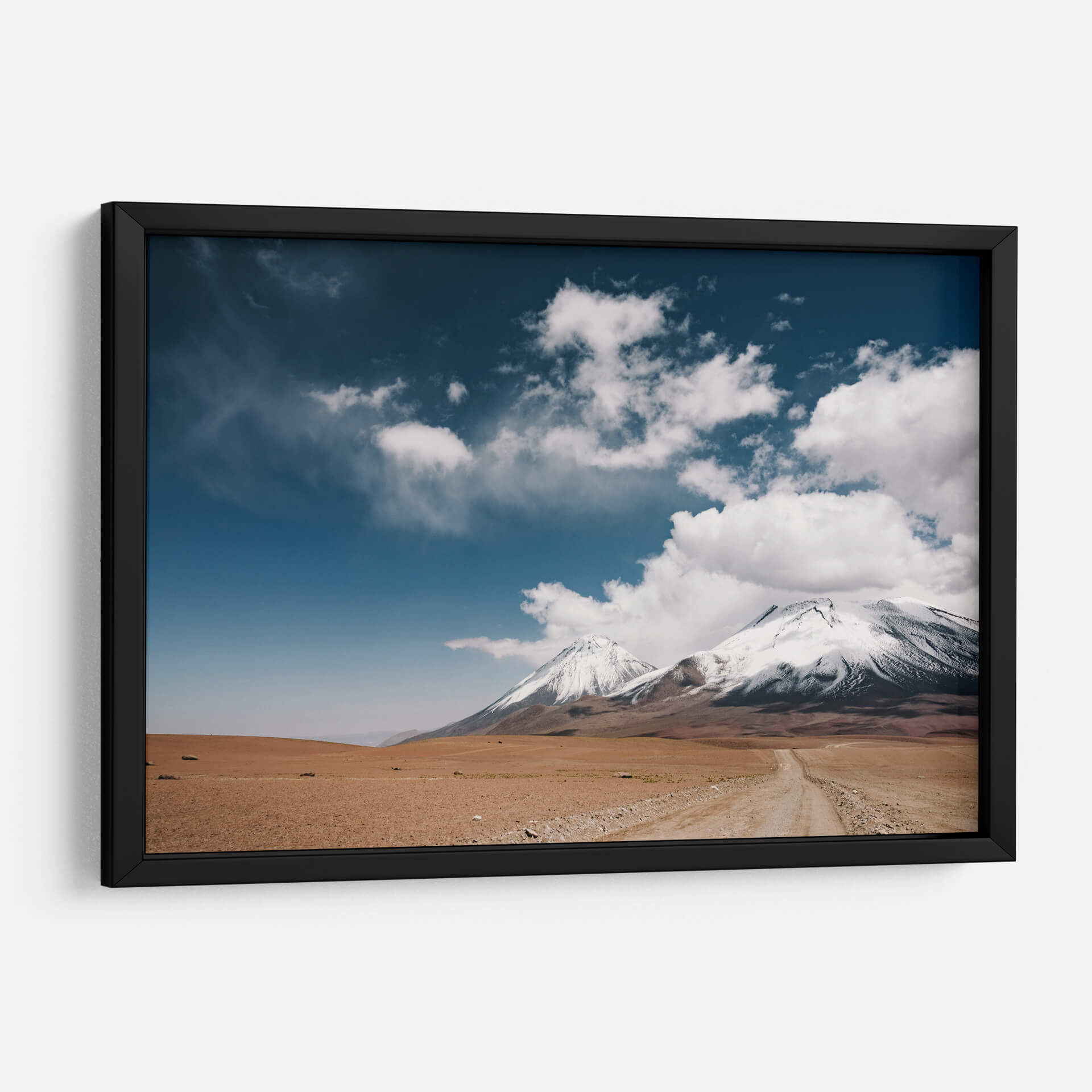 Sumérgete en la majestuosidad de la naturaleza con "Nubes y Montañas", una obra de arte que captura la serena grandeza de un paisaje montañoso. El cielo, de un azul profundo y vibrante, se adorna con etéreas nubes blancas que añaden profundidad y movimiento a la escena. En primer plano, unas vastas llanuras áridas de tonos tierra se extienden, evocando una sensación de espacio y tranquilidad. Al fondo, imponentes montañas cubiertas de nieve se alzan hacia el firmamento, ofreciendo un contraste espectacular entre la aspereza de la roca y la pureza del blanco invernal. La composición, con un camino de tierra que se adentra en la distancia, invita a la contemplación y a la reflexión sobre el viaje y la exploración. Este cuadro decorativo es perfecto para infundir calma y un sentido de aventura en tu hogar u oficina. Su paleta de colores, dominada por el azul del cielo, los ocres de la tierra y el blanco de la nieve, crea una atmósfera de paz y admiración. Ideal para espacios que buscan un toque de inspiración natural y sofisticación.