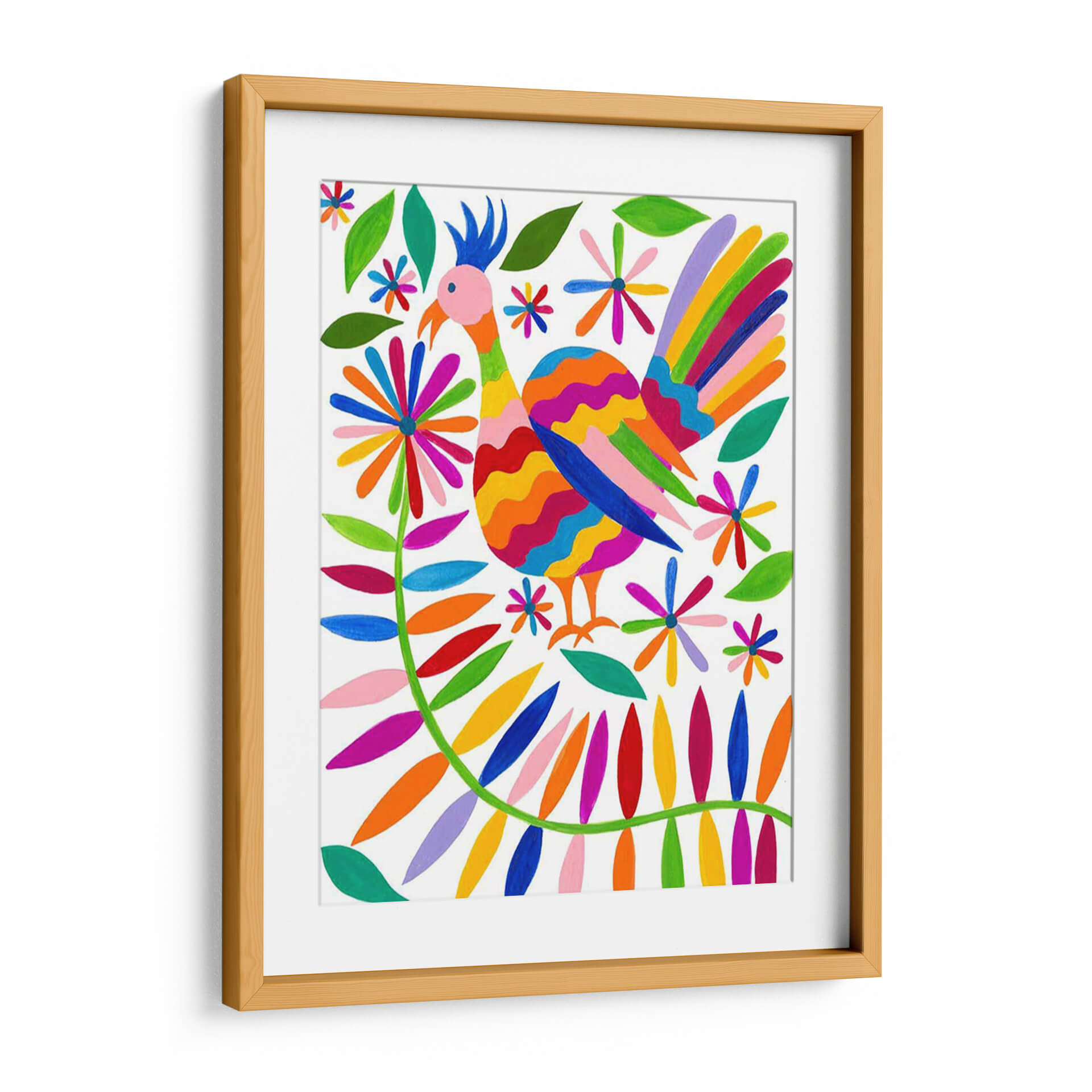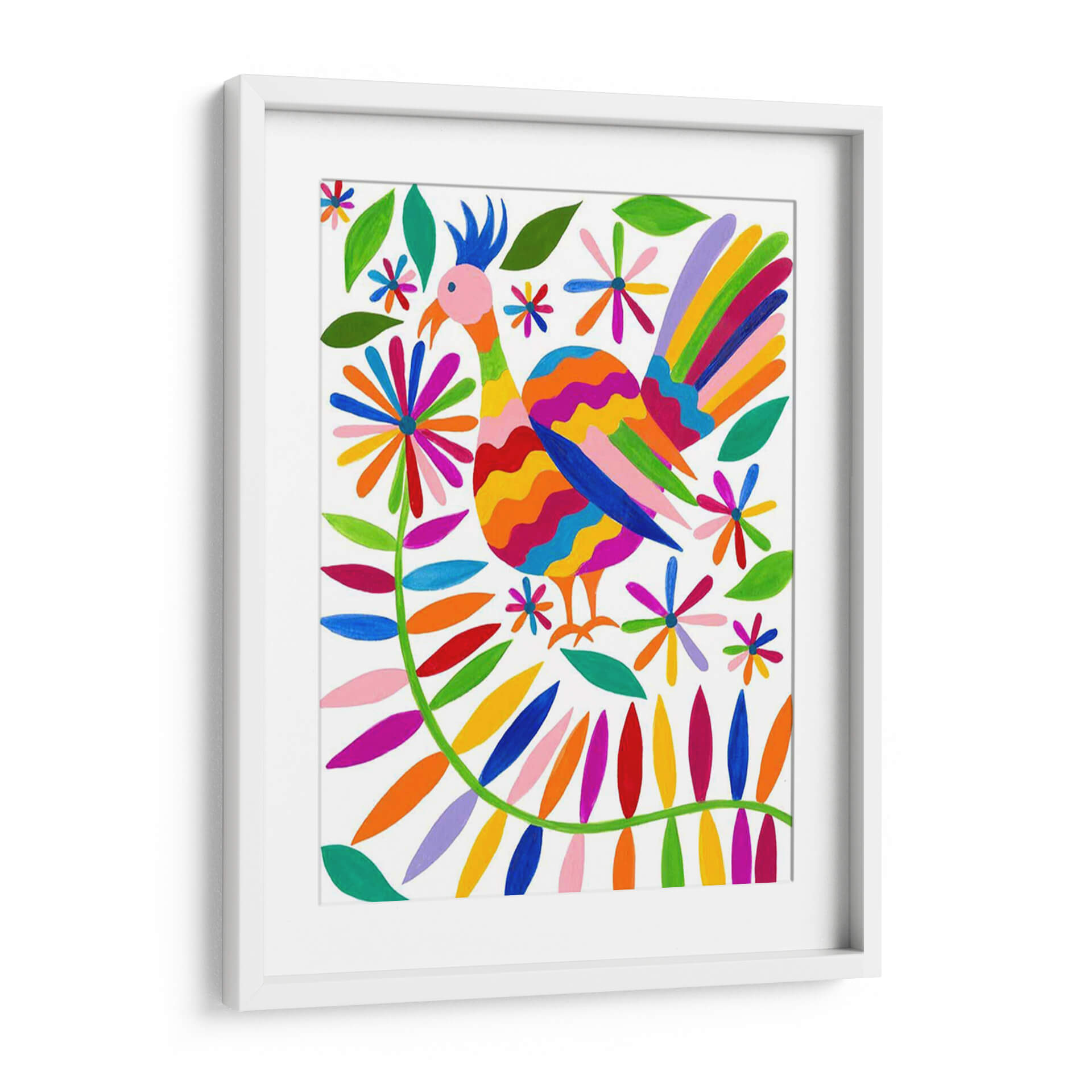 Embárcate en un viaje visual a través de la exuberante y vibrante obra "Otomi Bird Iii" de Regina Moore. Este cautivador cuadro decorativo es una explosión de color y alegría, presentando un pájaro estilizado rodeado de un follaje y flores que evocan la riqueza de la flora y fauna. La composición se basa en patrones ondulados y formas orgánicas, creando una sensación de movimiento y vitalidad. La paleta de colores, una celebración de tonos primarios y secundarios brillantes, como el rojo, naranja, amarillo, verde, azul y violeta, irradia optimismo y energía. El contraste con el fondo blanco puro permite que cada elemento destaque, aportando un aire fresco y moderno. La obra transmite una atmósfera de celebración de la naturaleza y de la cultura popular, ideal para espacios que buscan un toque de carácter y calidez. "Otomi Bird Iii" es perfecto para animar una sala de estar, añadir un acento lúdico a una oficina o infundir alegría en un dormitorio. Su estilo distintivo, inspirado en el arte textil otomí, lo convierte en una pieza única que no solo decora, sino que cuenta una historia y evoca emociones positivas, invitando a la contemplación y al disfrute de la belleza en su máxima expresión. Añade esta joya artística a tu colección y transforma cualquier ambiente.
