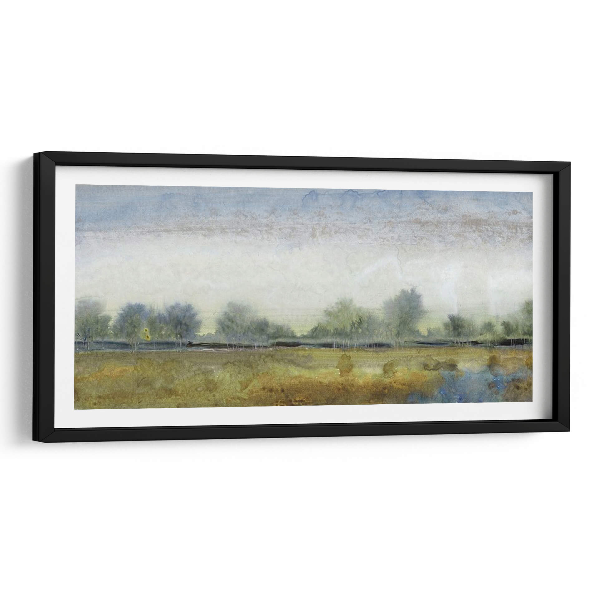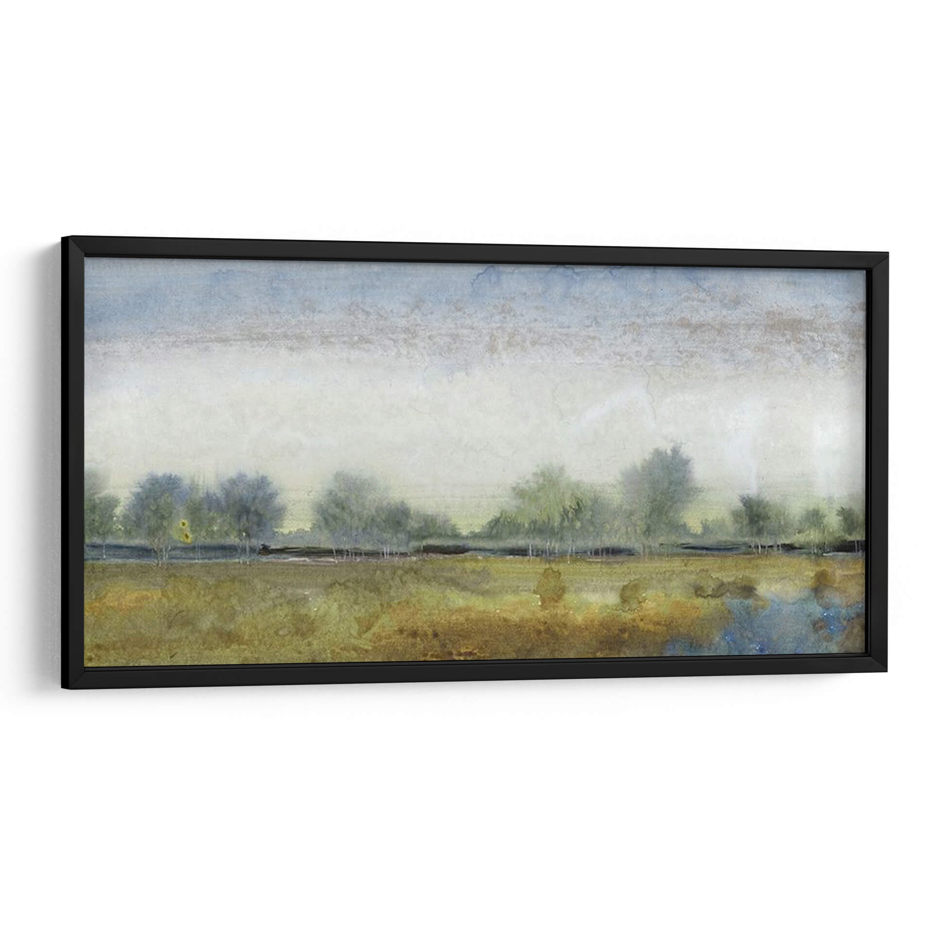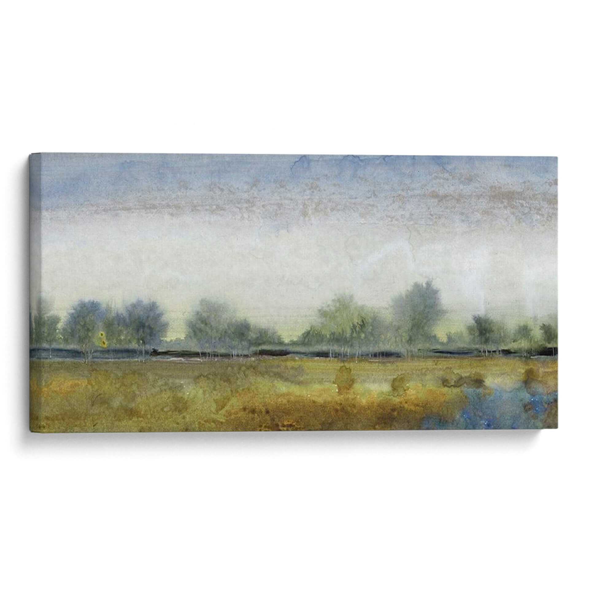 Sumérgete en la serenidad de "Paisaje Etéreo I", una obra de arte contemporáneo que captura la esencia de la naturaleza con una delicadeza excepcional. Este cuadro decorativo te transporta a un campo sereno bajo un cielo de acuarela, donde siluetas de árboles se perfilan contra un horizonte brumoso. La paleta de colores, dominada por tonos tierra, ocres y azules celestes, evoca una atmósfera de calma y contemplación, ideal para transformar cualquier espacio en un oasis de paz. El estilo pictórico, reminiscente de una acuarela etérea, juega con texturas sutiles y pinceladas suaves, creando una profundidad visual cautivadora. "Paisaje Etéreo I" es más que una simple decoración de pared; es una invitación a la reflexión y al disfrute de la belleza efímera de un paisaje atemporal. Su composición horizontal y su temática evocadora lo convierten en una adición perfecta para salones, dormitorios o estudios que busquen un toque de elegancia natural y serenidad. Permite que la tranquilidad de este cuadro decorativo enriquezca tu hogar y te conecte con la paz interior que solo la naturaleza puede inspirar.