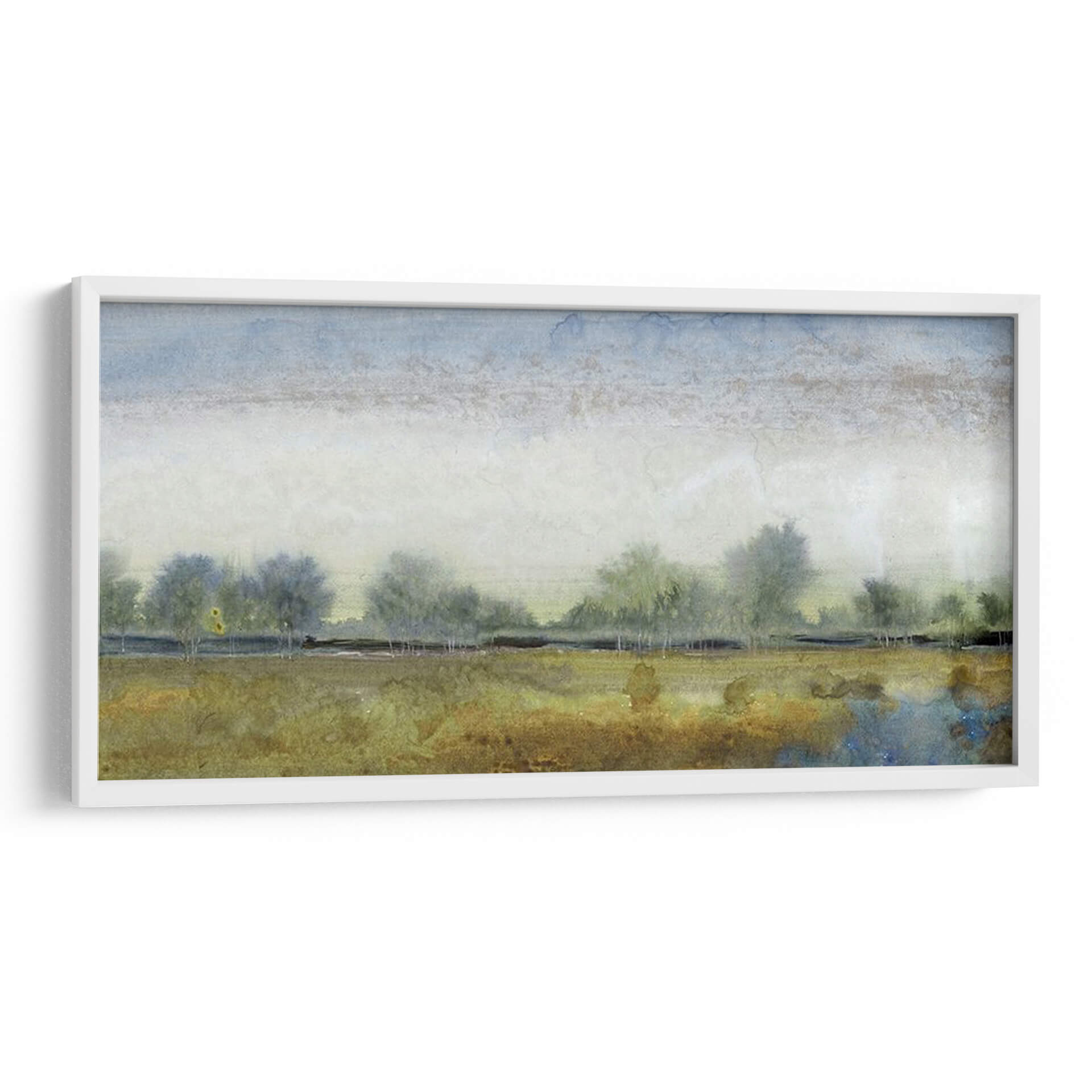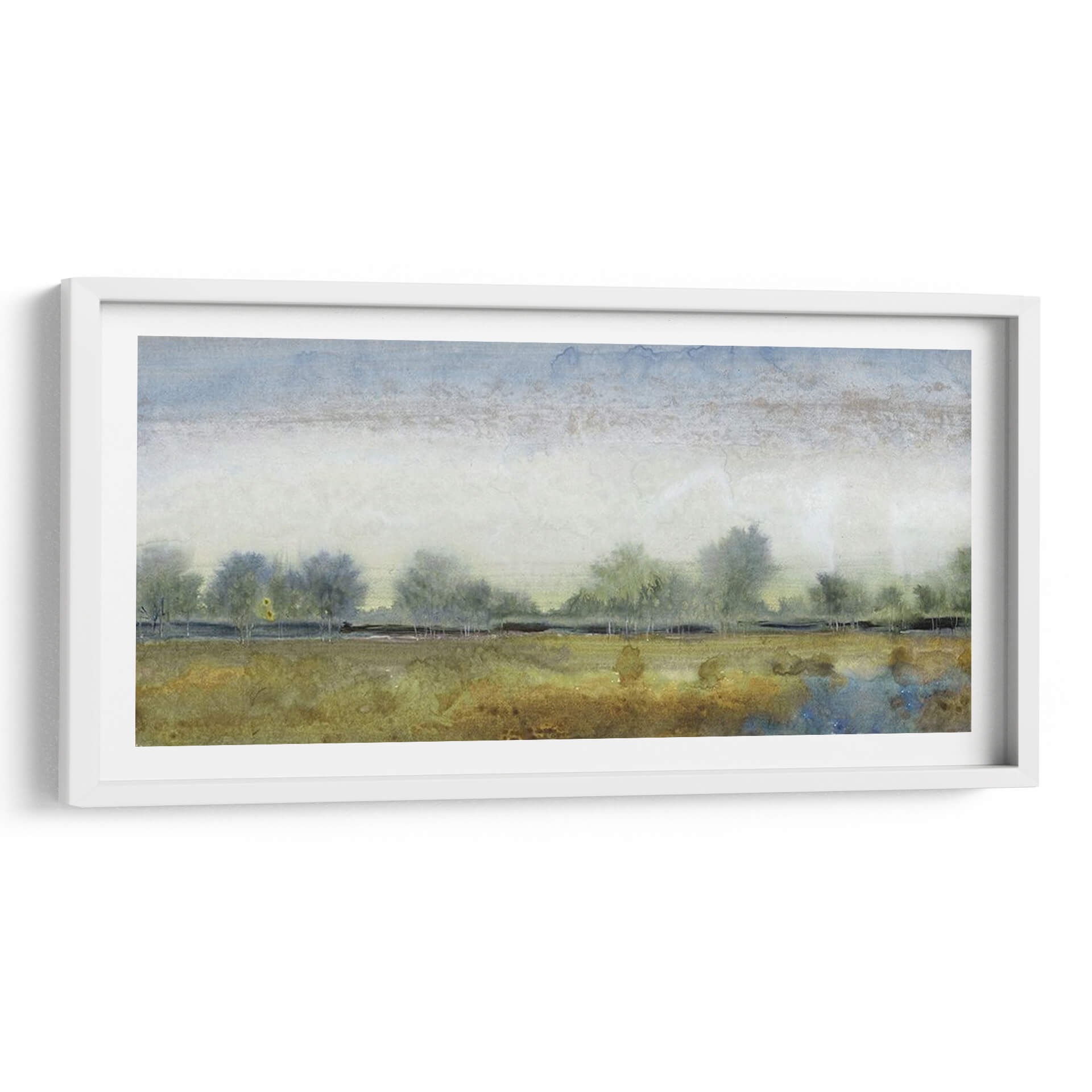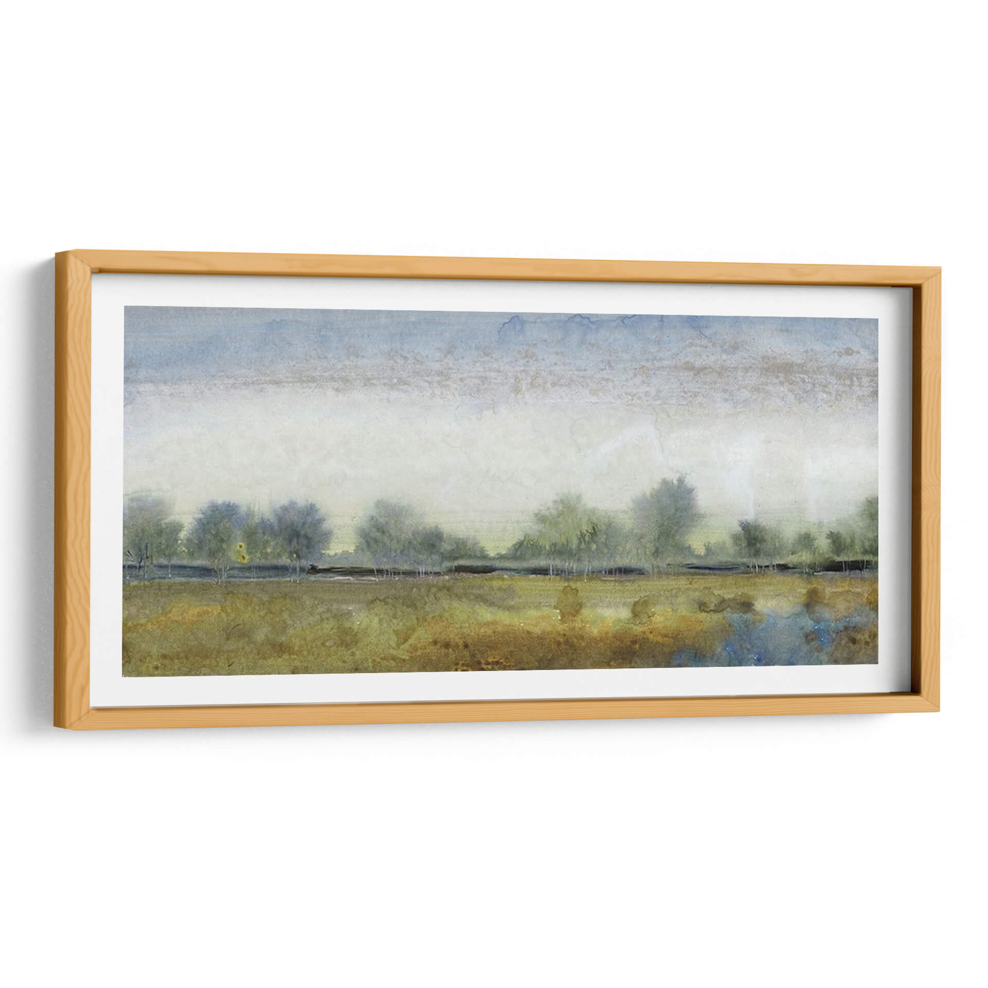 Sumérgete en la serenidad de "Paisaje Etéreo I", una obra de arte contemporáneo que captura la esencia de la naturaleza con una delicadeza excepcional. Este cuadro decorativo te transporta a un campo sereno bajo un cielo de acuarela, donde siluetas de árboles se perfilan contra un horizonte brumoso. La paleta de colores, dominada por tonos tierra, ocres y azules celestes, evoca una atmósfera de calma y contemplación, ideal para transformar cualquier espacio en un oasis de paz. El estilo pictórico, reminiscente de una acuarela etérea, juega con texturas sutiles y pinceladas suaves, creando una profundidad visual cautivadora. "Paisaje Etéreo I" es más que una simple decoración de pared; es una invitación a la reflexión y al disfrute de la belleza efímera de un paisaje atemporal. Su composición horizontal y su temática evocadora lo convierten en una adición perfecta para salones, dormitorios o estudios que busquen un toque de elegancia natural y serenidad. Permite que la tranquilidad de este cuadro decorativo enriquezca tu hogar y te conecte con la paz interior que solo la naturaleza puede inspirar.