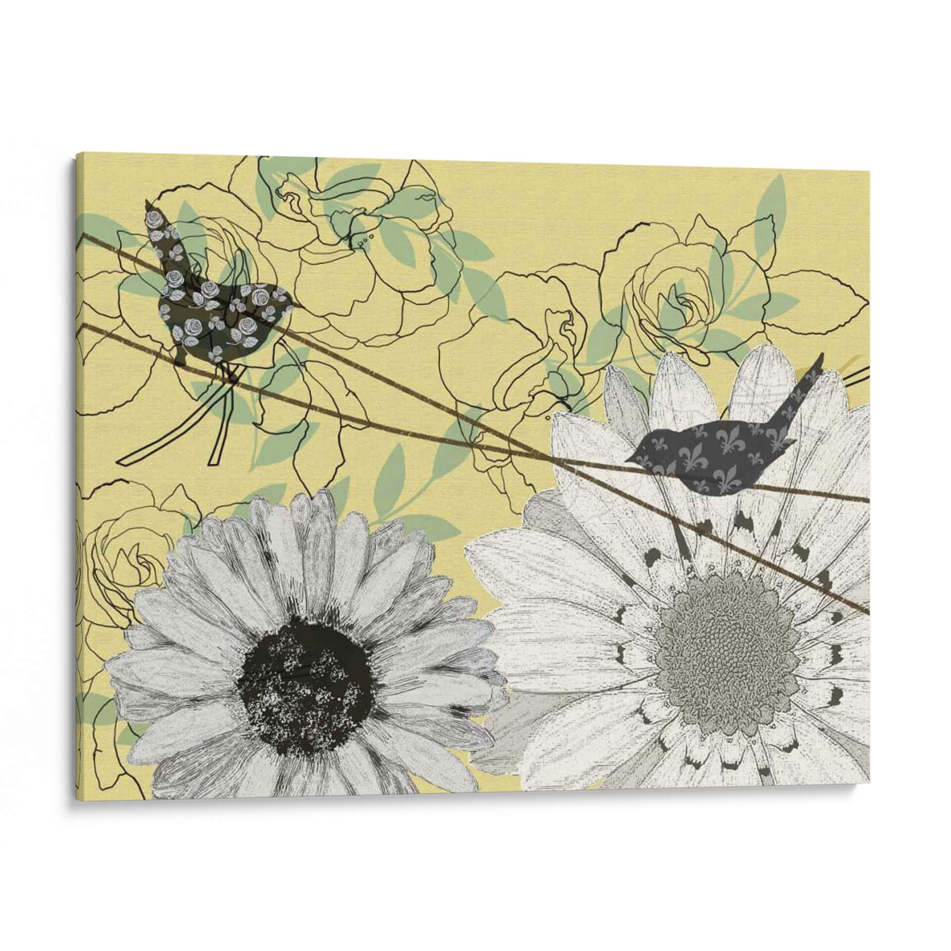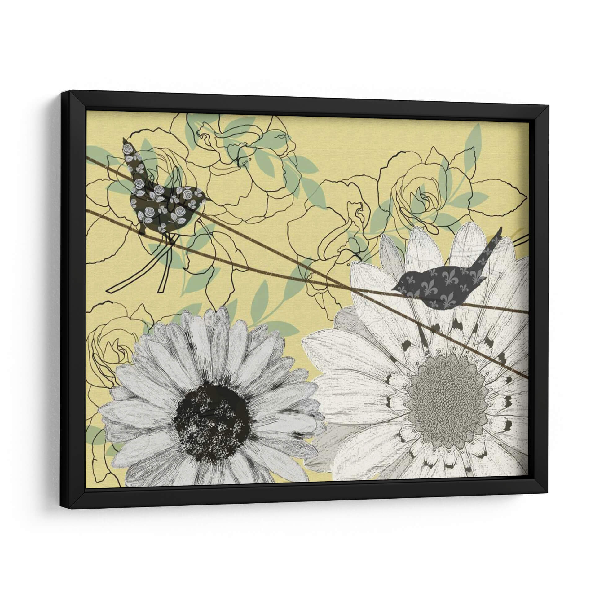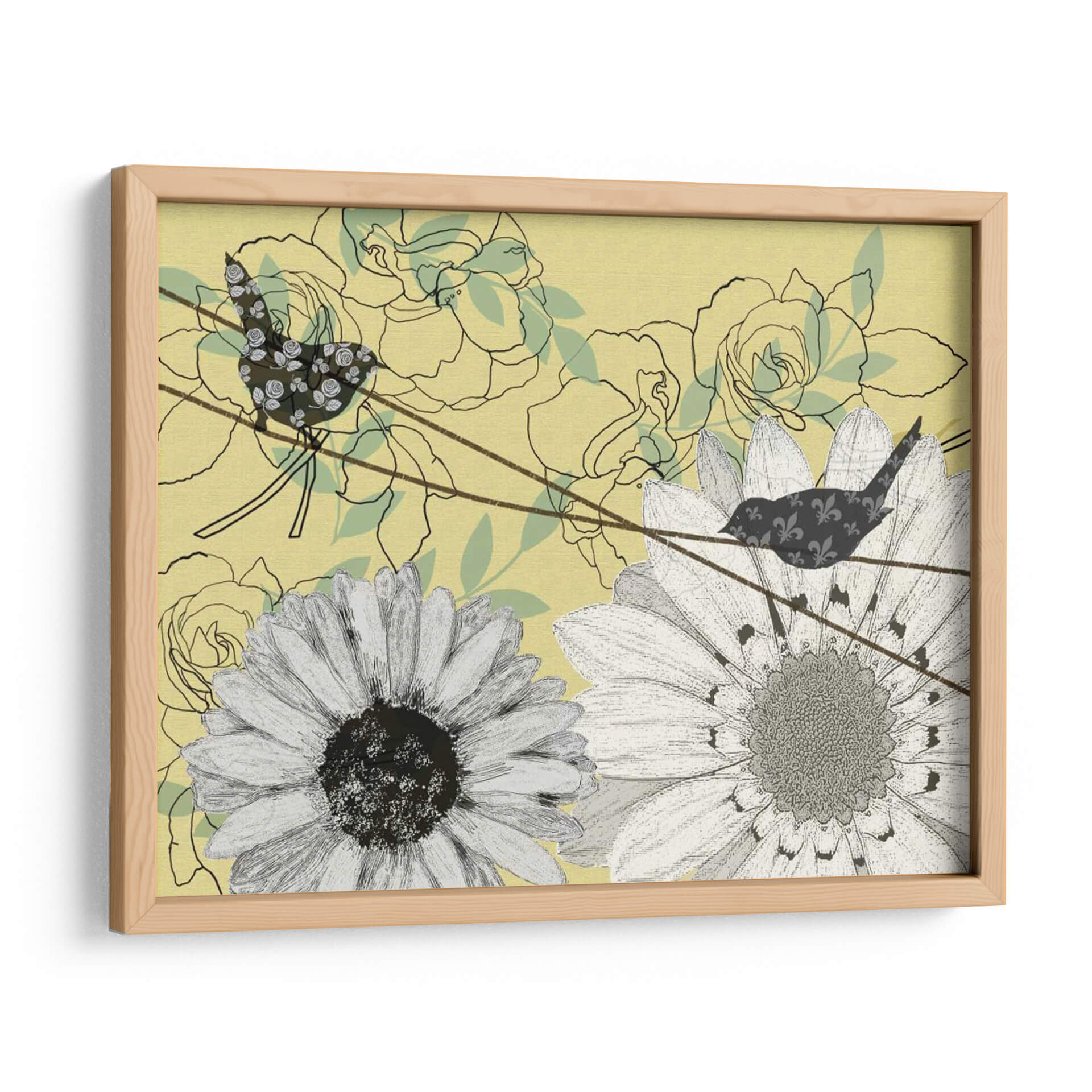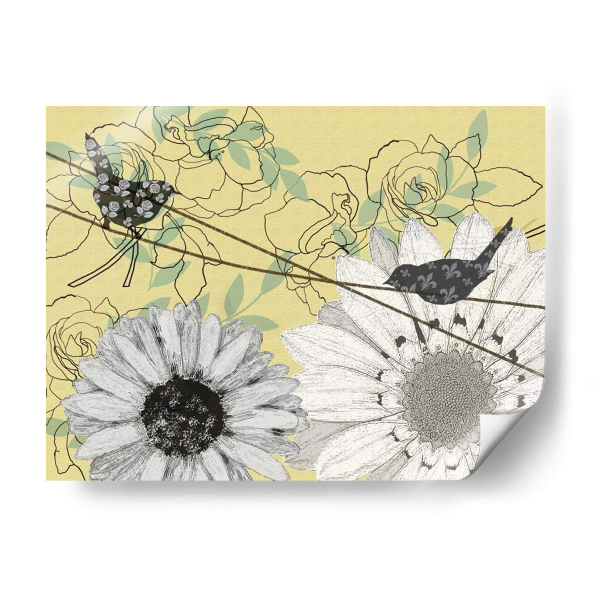 Aporta un toque de encanto natural y serenidad a tu espacio con "Pájaros En Un Alambre II", una obra de arte contemporáneo que captura la delicadeza de la naturaleza. Esta pieza presenta un diseño estilizado con flores de gran tamaño en tonos blancos y grises, delineadas con trazos finos y oscuros que contrastan con un fondo amarillo suave y texturizado. Dos siluetas de pájaros, una de ellas adornada con un sutil patrón de flor de lis, se posan sobre alambres finos que atraviesan la composición, añadiendo un elemento dinámico y poético. La paleta de colores, dominada por el amarillo pálido, el verde menta, el negro y el blanco, crea una atmósfera tranquila y aireada, perfecta para cualquier habitación que busque un acento de calma y elegancia. Ideal para salas de estar, dormitorios o incluso oficinas, este cuadro decorativo infunde una sensación de paz y conexión con el mundo natural. Su estilo gráfico y moderno lo convierte en una adición versátil que complementa una variedad de decoraciones interiores, desde las más minimalistas hasta las más bohemias. "Pájaros En Un Alambre II" es más que una simple imagen; es una ventana a un jardín sereno, invitando a la contemplación y al disfrute estético.
