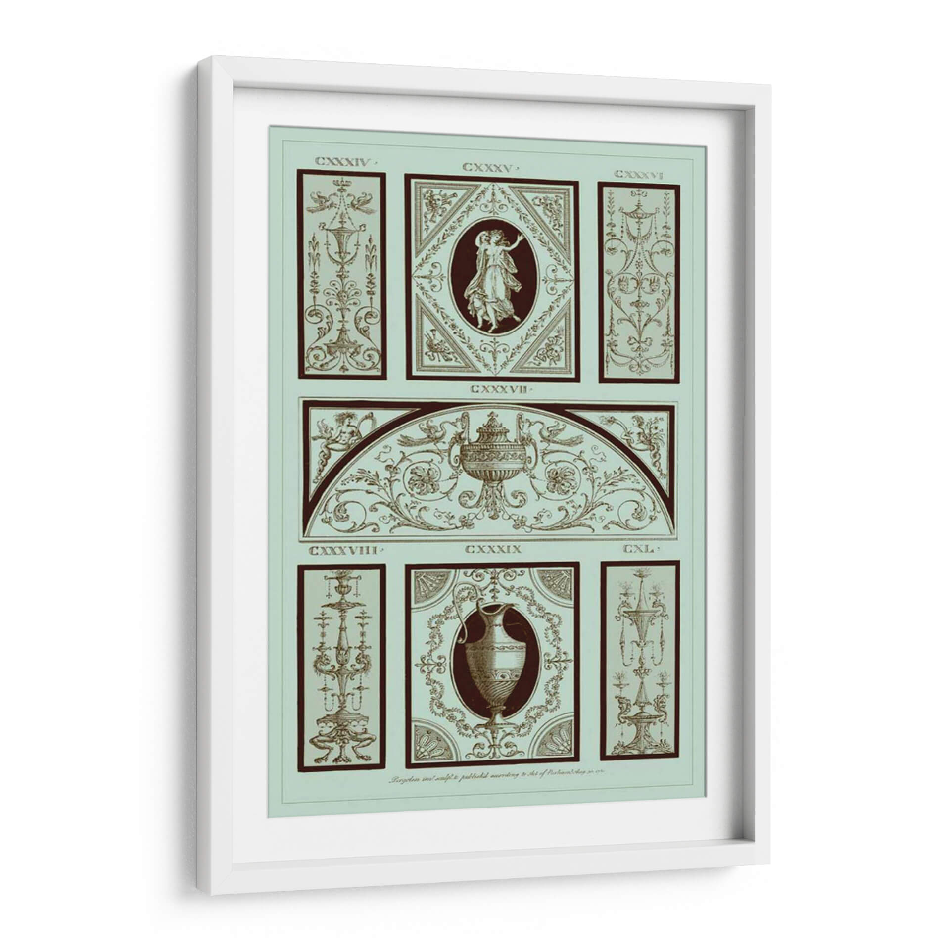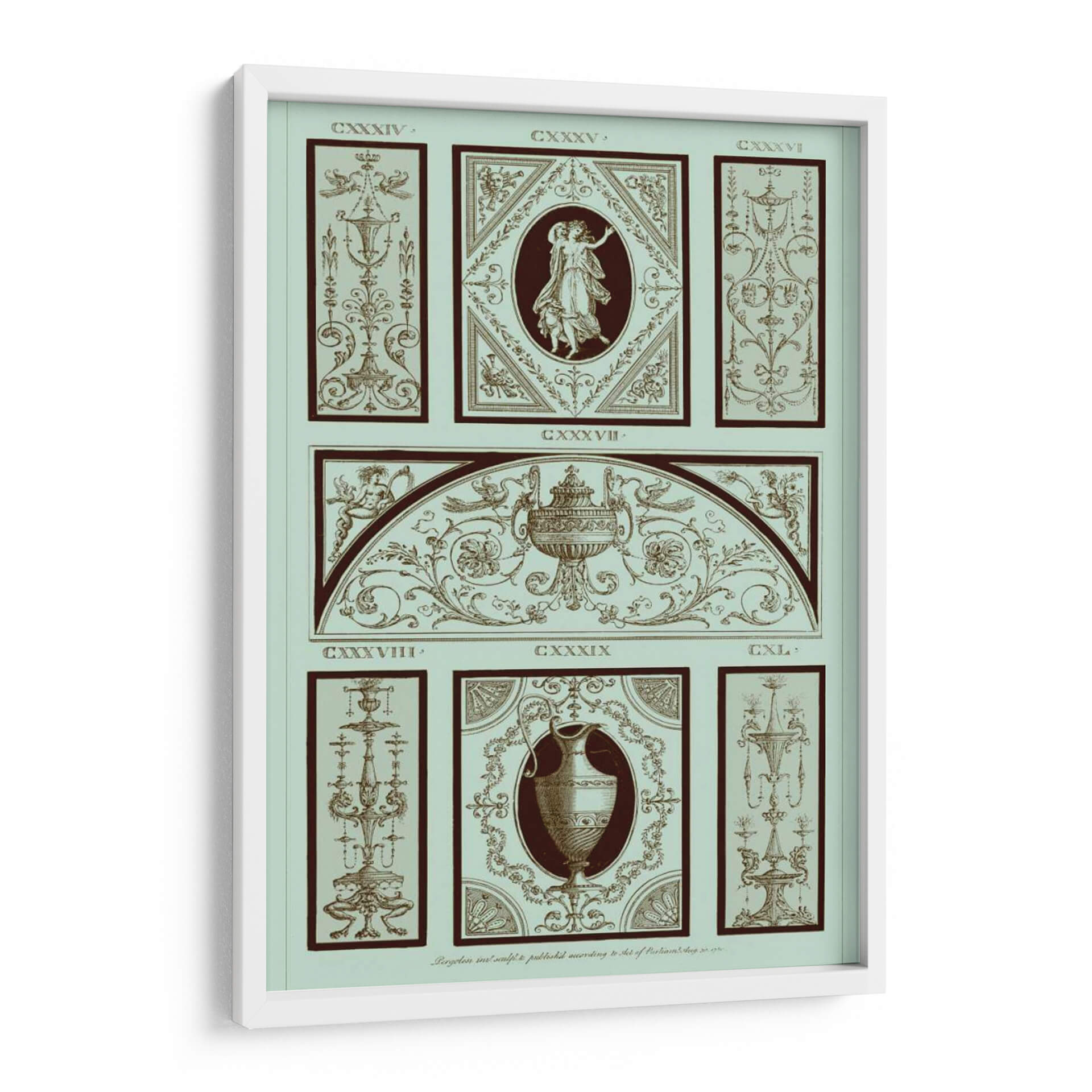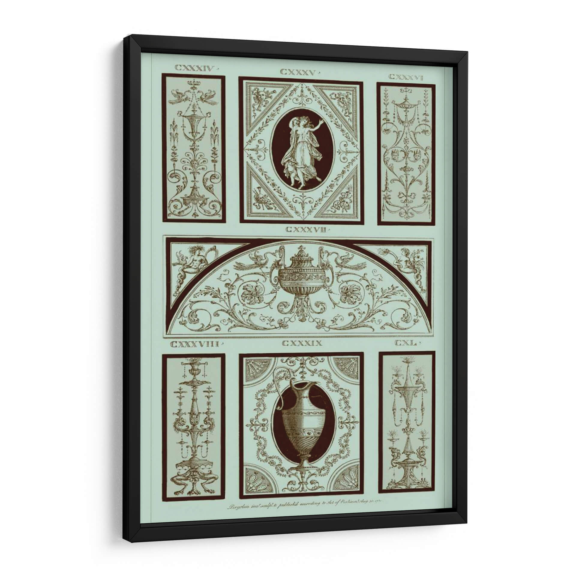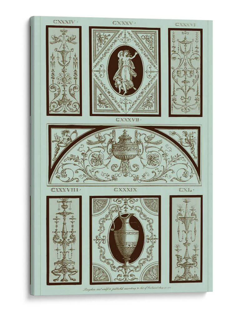 Sumérgete en la elegancia atemporal del 'Panel Pergolesi En Celadon I', una obra maestra que evoca la opulencia del diseño neoclásico y la delicadeza del arte decorativo. Este cuadro presenta una composición meticulosamente elaborada, dividida en secciones que muestran intrincados detalles ornamentales, motivos florales estilizados y representaciones clásicas. La paleta de colores, dominada por tonos celadón y sepia, crea una atmósfera de sofisticación serena y refinamiento. En el panel central, una figura femenina danzante capta la mirada, rodeada de un marco romboidal adornado con elementos que remiten a la naturaleza y la mitología. Otras secciones exhiben urnas clásicas y candelabros, todos ejecutados con una precisión exquisita que recuerda a grabados antiguos y frescos de villas italianas. Ideal para quienes buscan añadir un toque de distinción y un aire de historia a su hogar u oficina, este cuadro decorativo es perfecto para salones, estudios o comedores donde se desee proyectar una imagen de buen gusto y cultura. Transforma tu espacio con esta pieza de arte que combina la grandiosidad del pasado con la estética contemporánea, asegurando un punto focal de conversación y admiración.