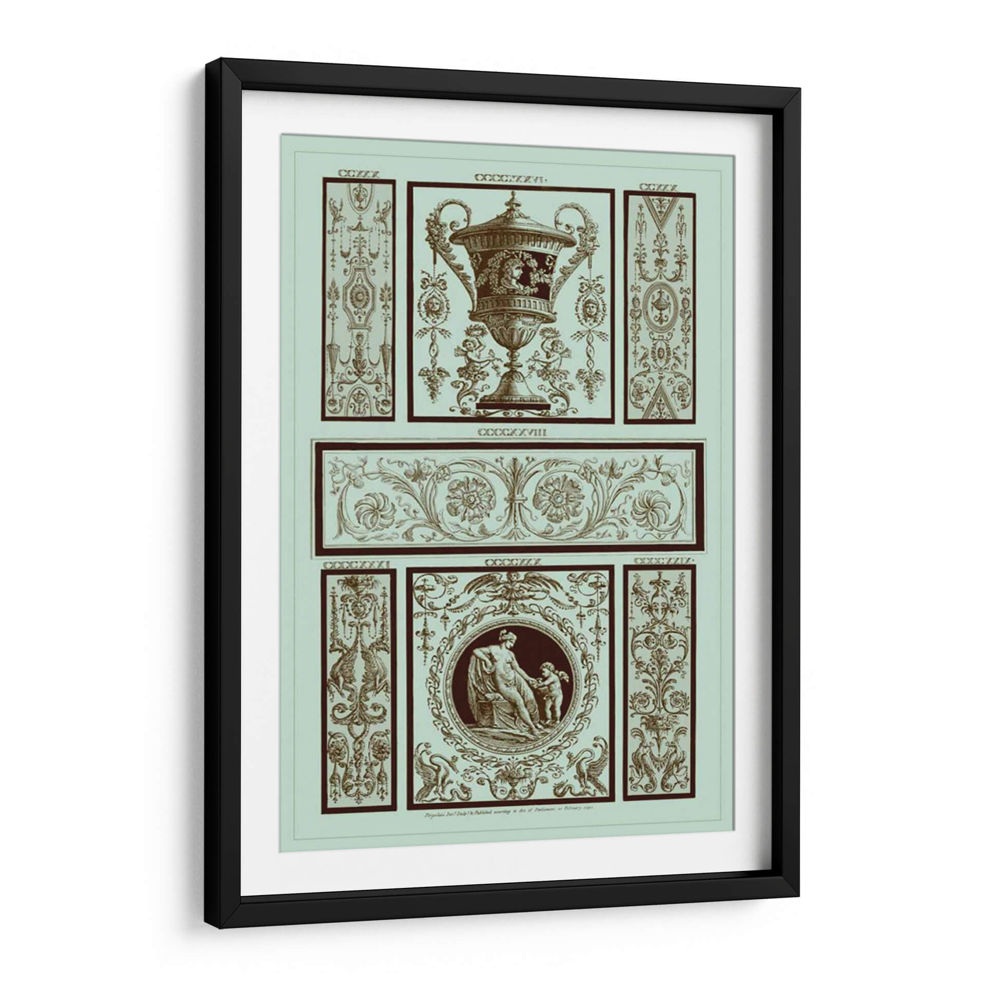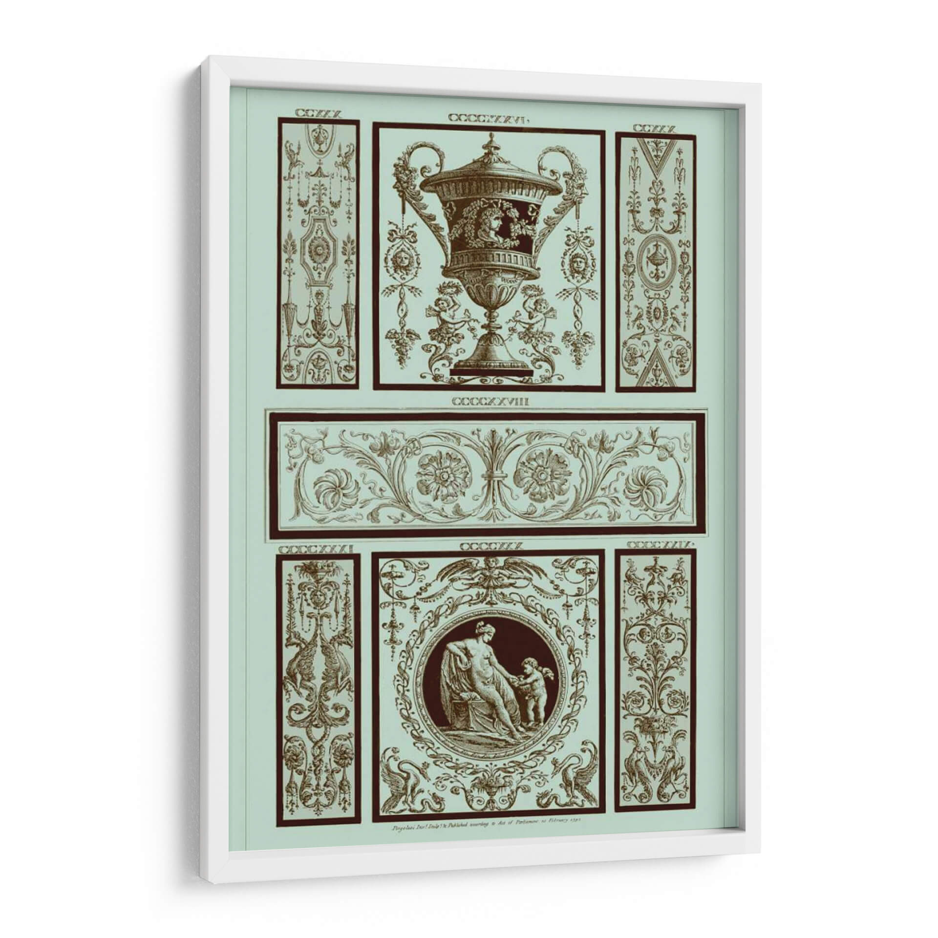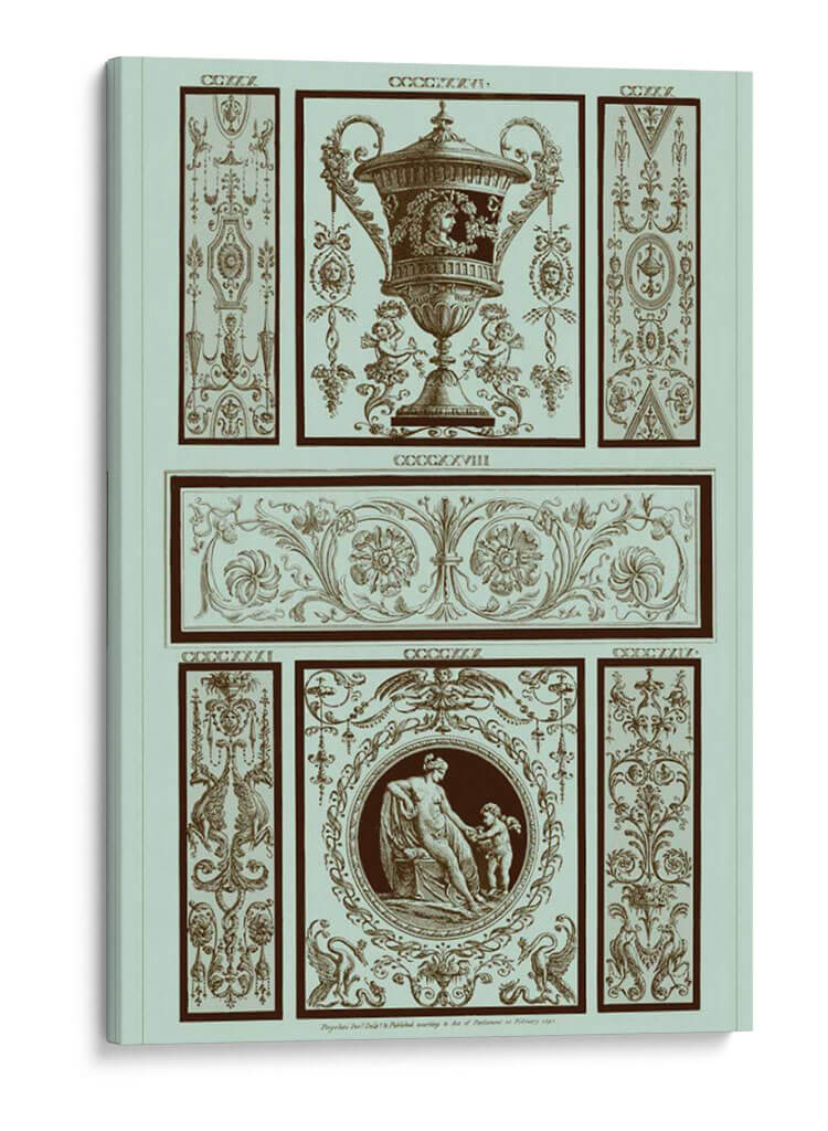 Inmerge tu espacio en la elegancia atemporal con el 'Panel Pergolesi En Celadon II', una obra de arte que evoca el refinamiento del diseño clásico. Esta pieza presenta un intrincado tapiz visual, dominado por un gran jarrón ornamentado en su sección superior, adornado con detalles sutiles que sugieren figuras y motivos florales. Acompañando esta figura central, se despliega una banda horizontal de exquisitos motivos florales y ornamentación simétrica, complementada por paneles verticales llenos de detalles decorativos, incluyendo figuras alegóricas y elementos arquitectónicos que recuerdan al arte renacentista y barroco. La paleta de colores, centrada en tonos celadón y sepia, confiere una atmósfera de serenidad y sofisticación, perfecta para añadir un toque de distinción a cualquier habitación. Los detalles finos y la composición equilibrada hacen de este cuadro decorativo una elección ideal para salones, estudios o comedores que buscan expresar un gusto por la historia del arte y la decoración clásica. Añade un aire de erudición y belleza clásica a tu hogar con esta cautivadora obra.