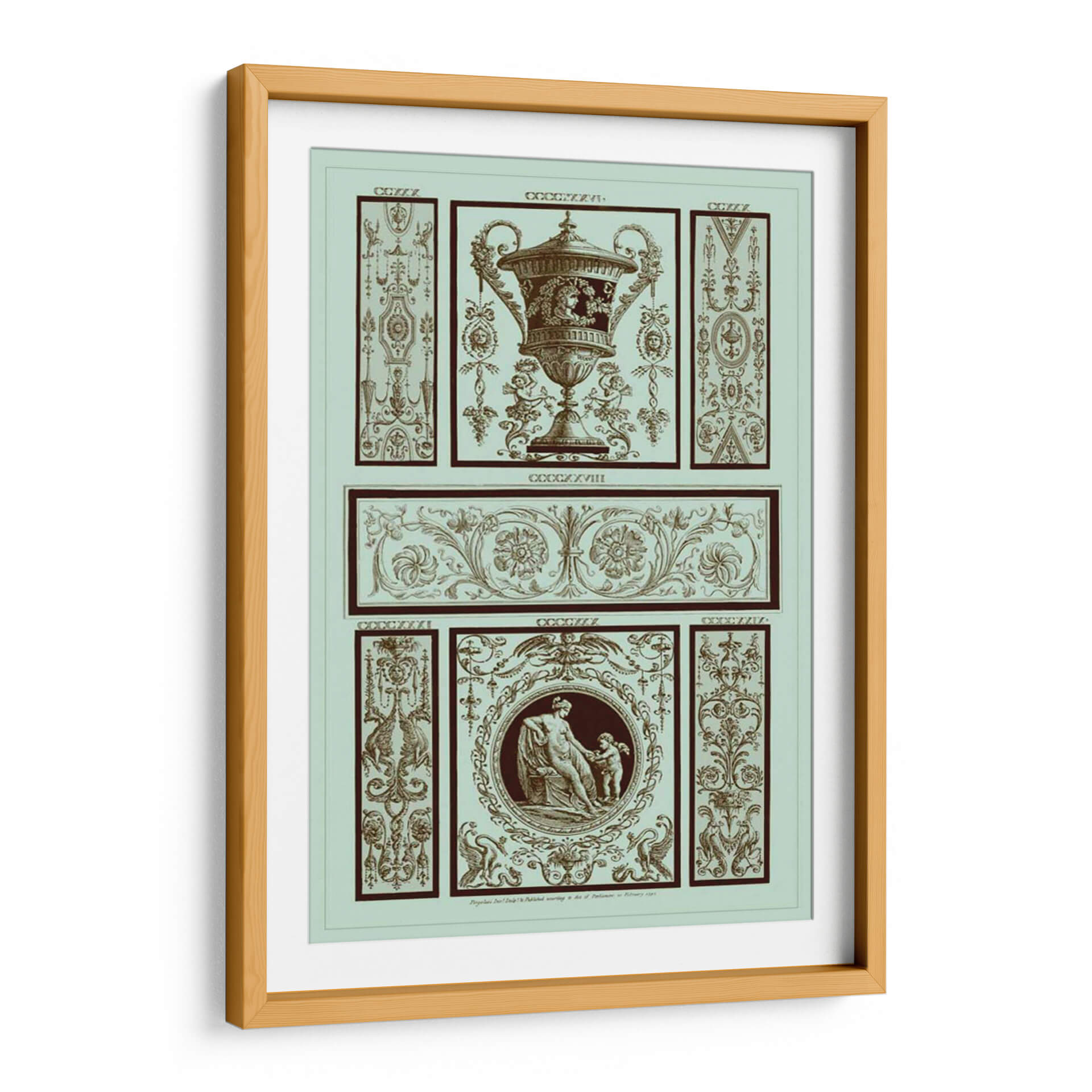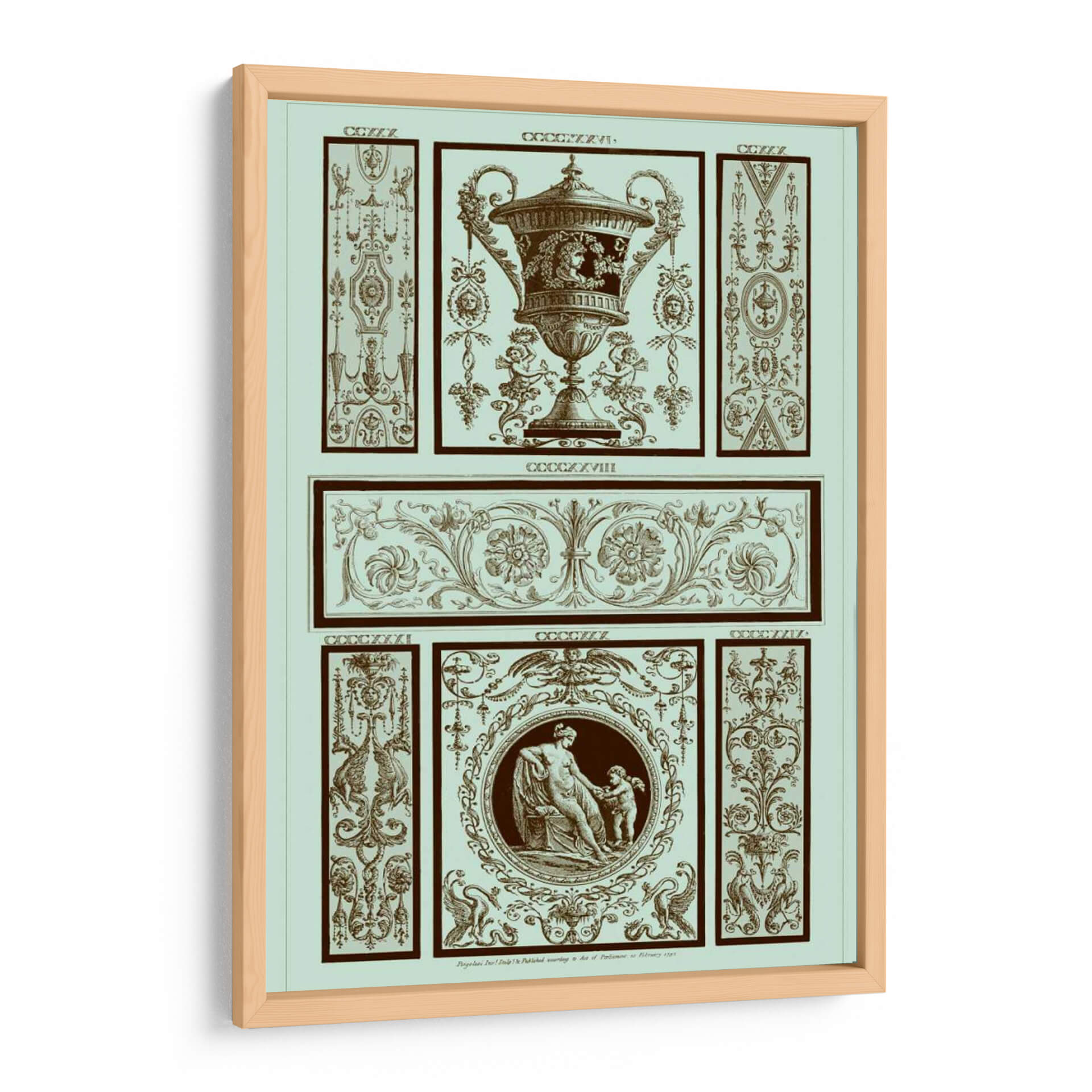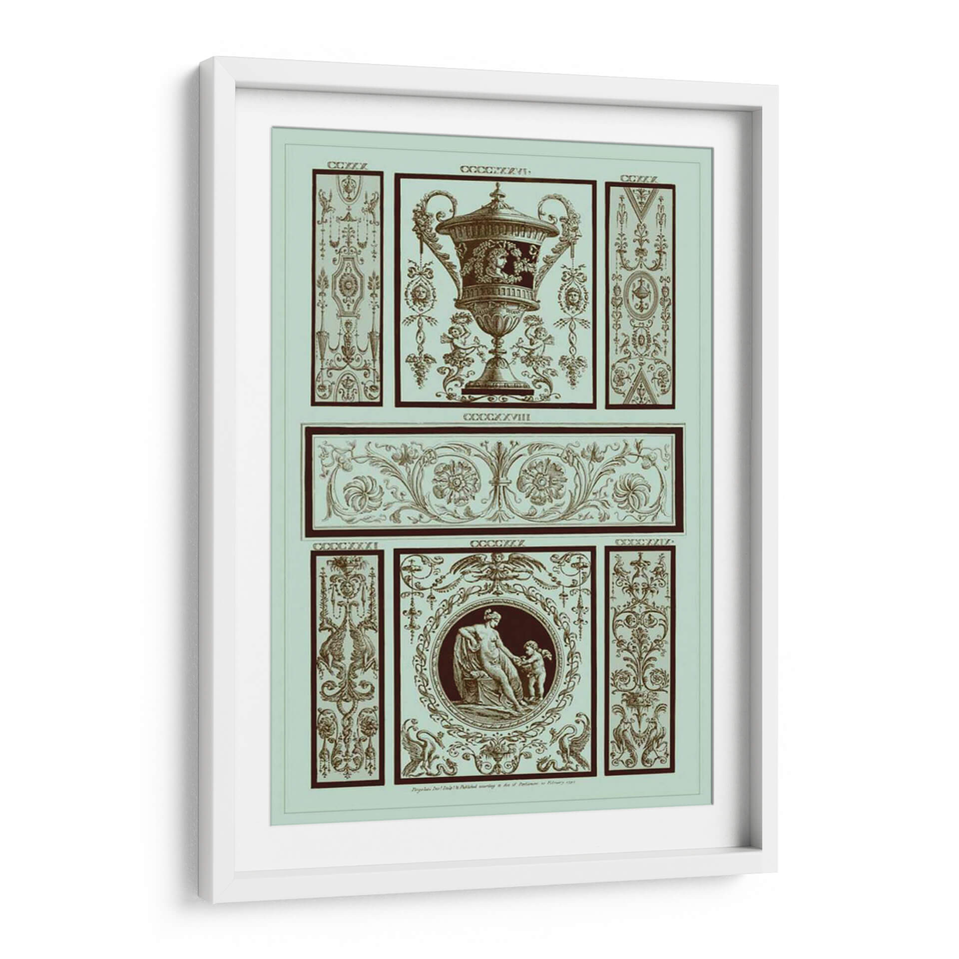 Inmerge tu espacio en la elegancia atemporal con el 'Panel Pergolesi En Celadon II', una obra de arte que evoca el refinamiento del diseño clásico. Esta pieza presenta un intrincado tapiz visual, dominado por un gran jarrón ornamentado en su sección superior, adornado con detalles sutiles que sugieren figuras y motivos florales. Acompañando esta figura central, se despliega una banda horizontal de exquisitos motivos florales y ornamentación simétrica, complementada por paneles verticales llenos de detalles decorativos, incluyendo figuras alegóricas y elementos arquitectónicos que recuerdan al arte renacentista y barroco. La paleta de colores, centrada en tonos celadón y sepia, confiere una atmósfera de serenidad y sofisticación, perfecta para añadir un toque de distinción a cualquier habitación. Los detalles finos y la composición equilibrada hacen de este cuadro decorativo una elección ideal para salones, estudios o comedores que buscan expresar un gusto por la historia del arte y la decoración clásica. Añade un aire de erudición y belleza clásica a tu hogar con esta cautivadora obra.
