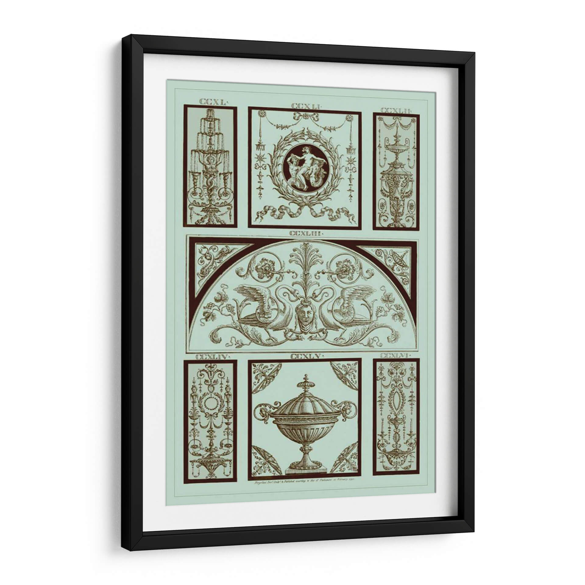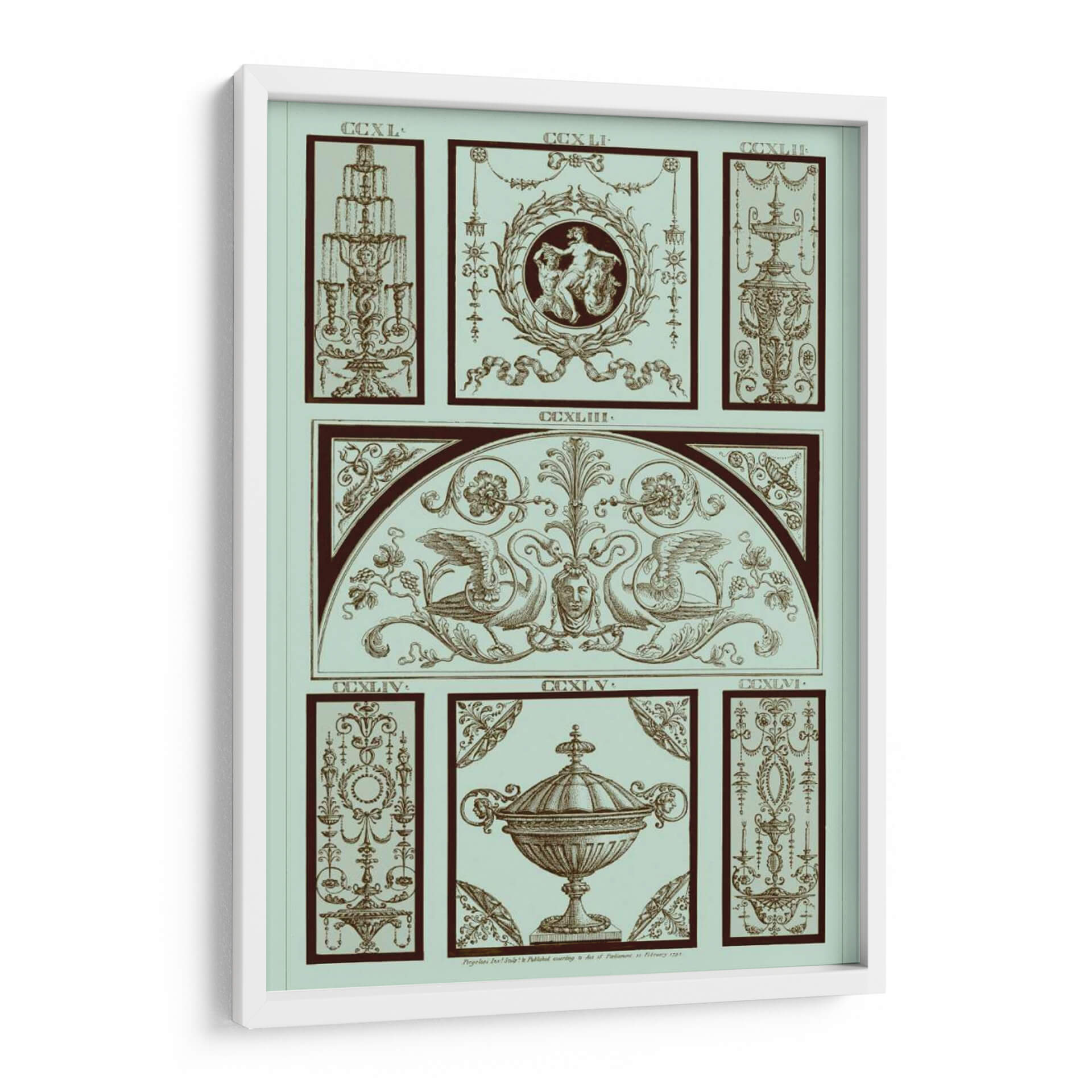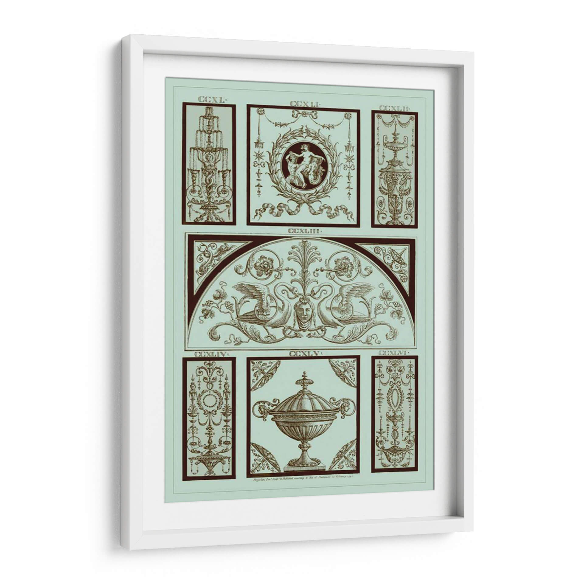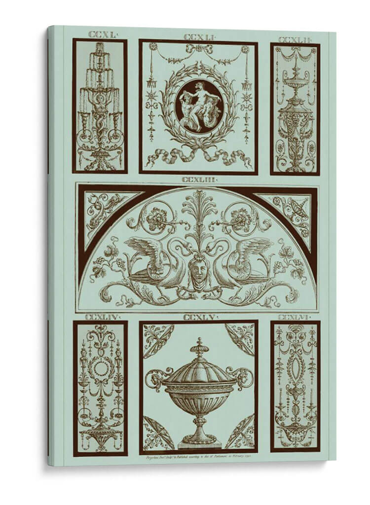 Adéntrese en la elegancia clásica con el cuadro decorativo "Panel Pergolesi En Celadon III" del artista Pergolesi. Esta obra maestra evoca un aire de sofisticación atemporal, presentando una composición intrincada que fusiona elementos arquitectónicos y mitológicos en una paleta de celadón suave y tonos tierra profundos. El diseño, inspirado en la ornamentación renacentista, despliega un friso central adornado con grifos majestuosos flanqueando un rostro sereno, todo enmarcado por un arco sutil. Paneles secundarios detallan motivos florales, urnas ornamentadas y figuras alegóricas, cada uno presentando un nivel de detalle exquisito que invita a la contemplación. La armonía de los colores y la precisión del trazo crean una atmósfera de calma y refinamiento, perfecta para añadir un toque de distinción a cualquier espacio. Este cuadro decorativo es ideal para salas de estar, estudios o comedores donde se busca una pieza que hable de historia, arte y buen gusto. Su estilo detallado y su temática evocadora lo convierten en un punto focal que complementa tanto decoraciones clásicas como contemporáneas, aportando profundidad y carácter a su hogar u oficina.