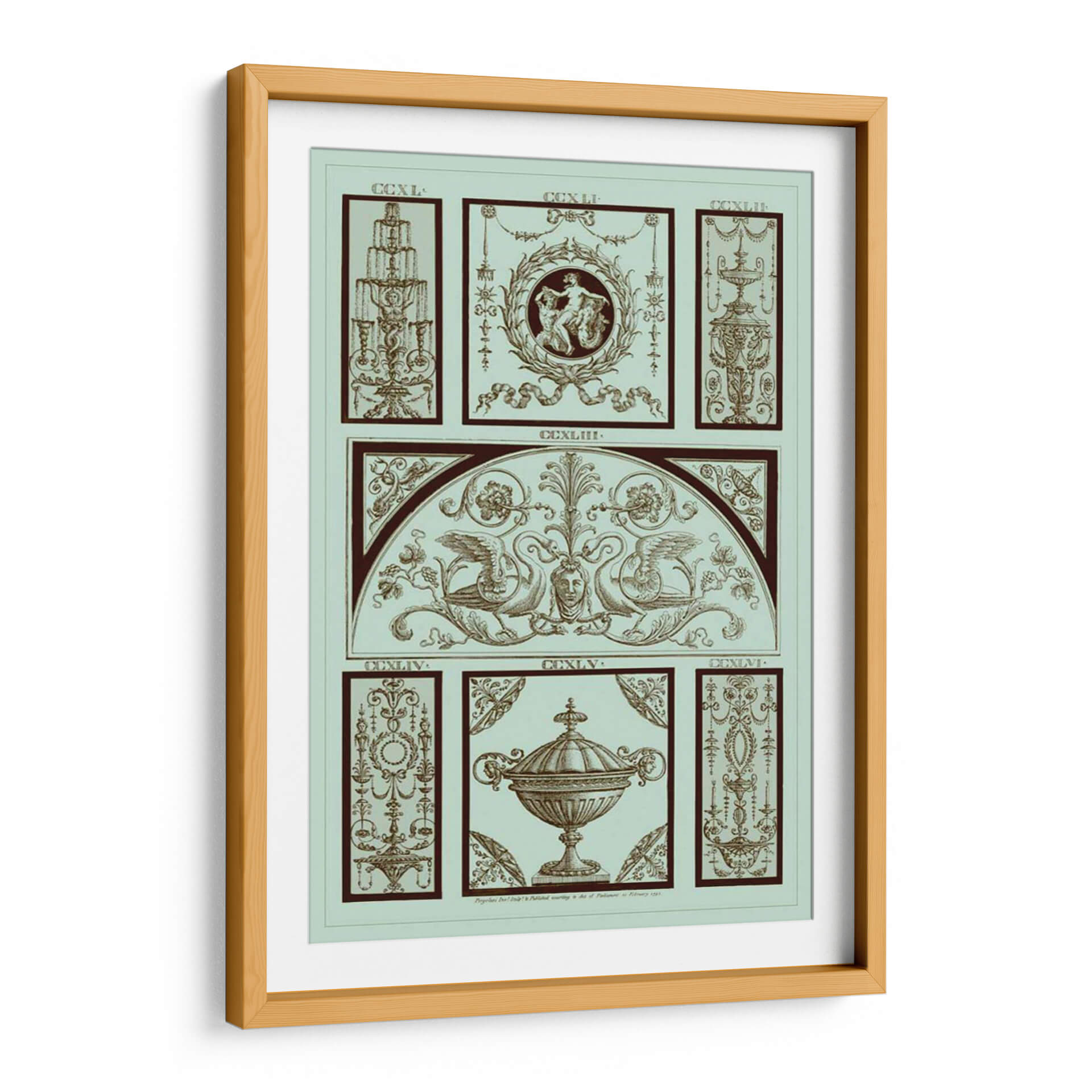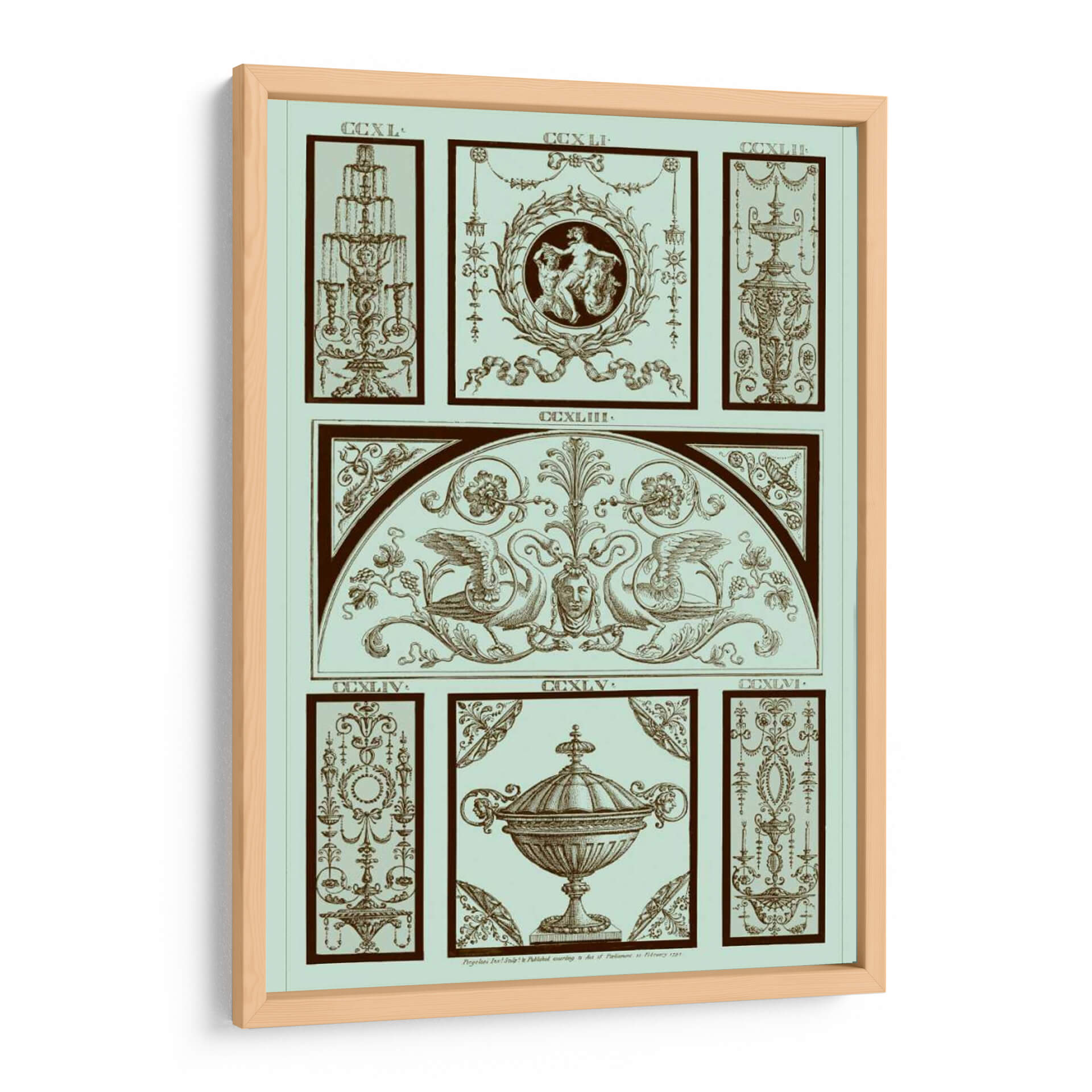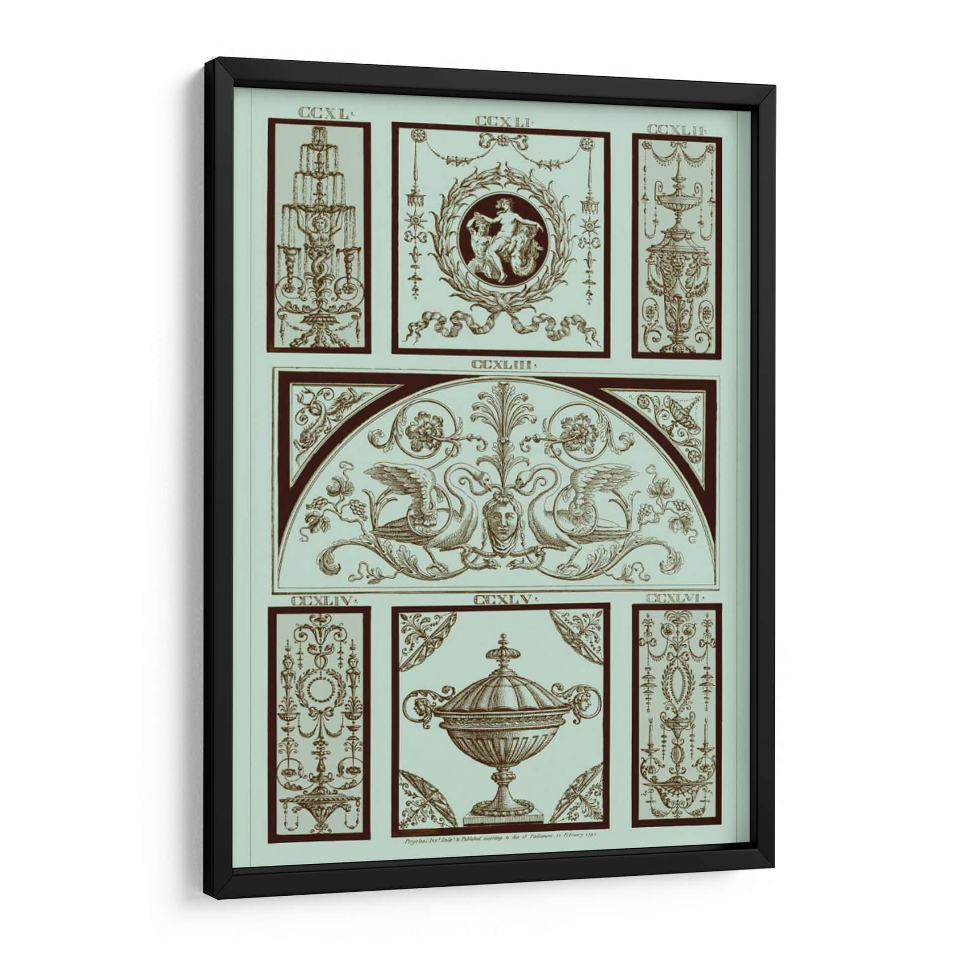Adéntrese en la elegancia clásica con el cuadro decorativo "Panel Pergolesi En Celadon III" del artista Pergolesi. Esta obra maestra evoca un aire de sofisticación atemporal, presentando una composición intrincada que fusiona elementos arquitectónicos y mitológicos en una paleta de celadón suave y tonos tierra profundos. El diseño, inspirado en la ornamentación renacentista, despliega un friso central adornado con grifos majestuosos flanqueando un rostro sereno, todo enmarcado por un arco sutil. Paneles secundarios detallan motivos florales, urnas ornamentadas y figuras alegóricas, cada uno presentando un nivel de detalle exquisito que invita a la contemplación. La armonía de los colores y la precisión del trazo crean una atmósfera de calma y refinamiento, perfecta para añadir un toque de distinción a cualquier espacio. Este cuadro decorativo es ideal para salas de estar, estudios o comedores donde se busca una pieza que hable de historia, arte y buen gusto. Su estilo detallado y su temática evocadora lo convierten en un punto focal que complementa tanto decoraciones clásicas como contemporáneas, aportando profundidad y carácter a su hogar u oficina.