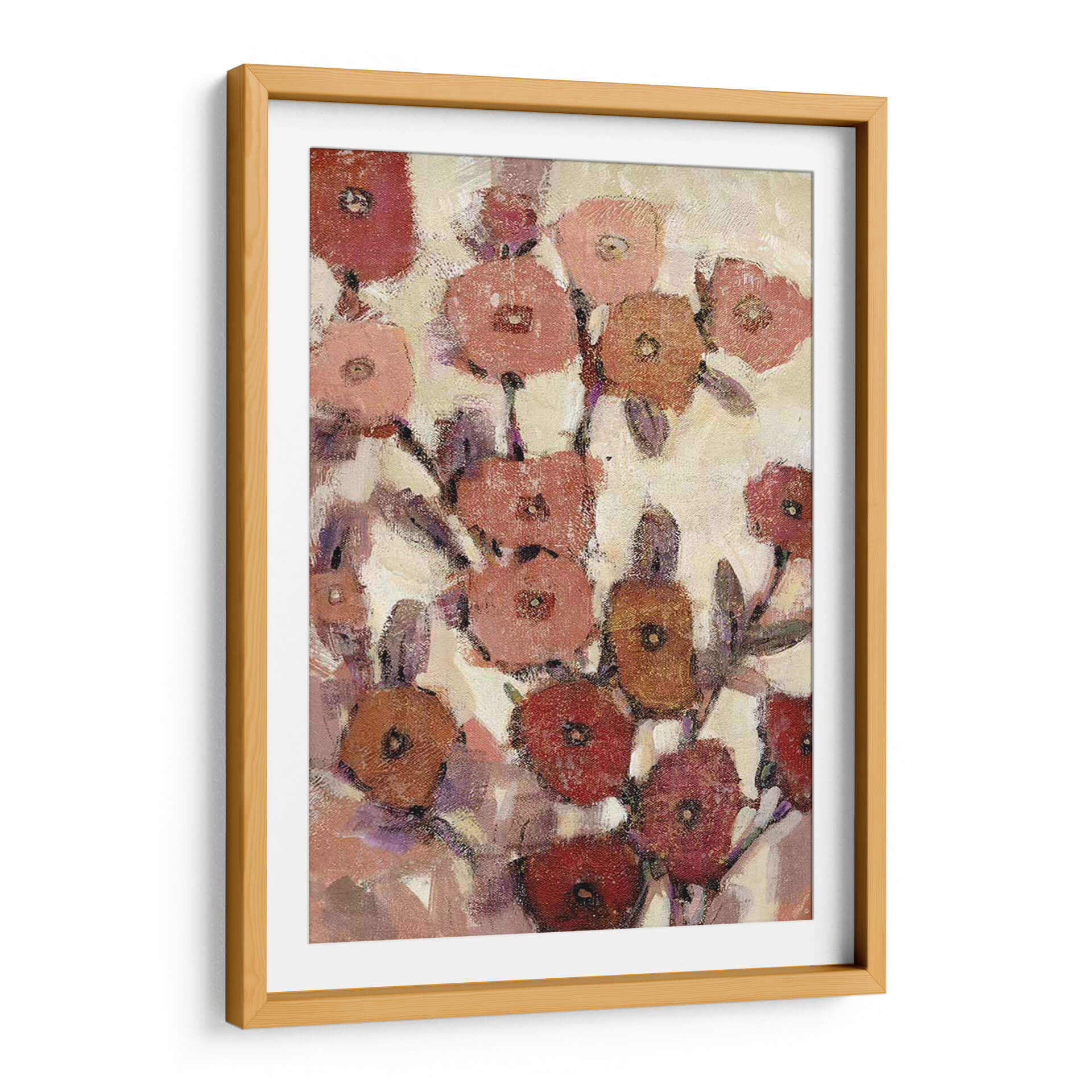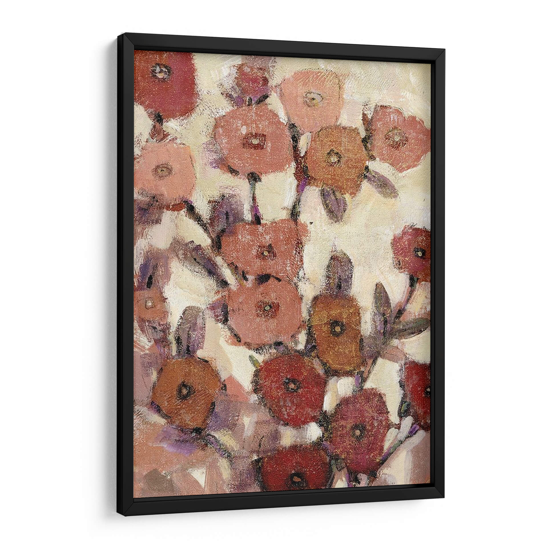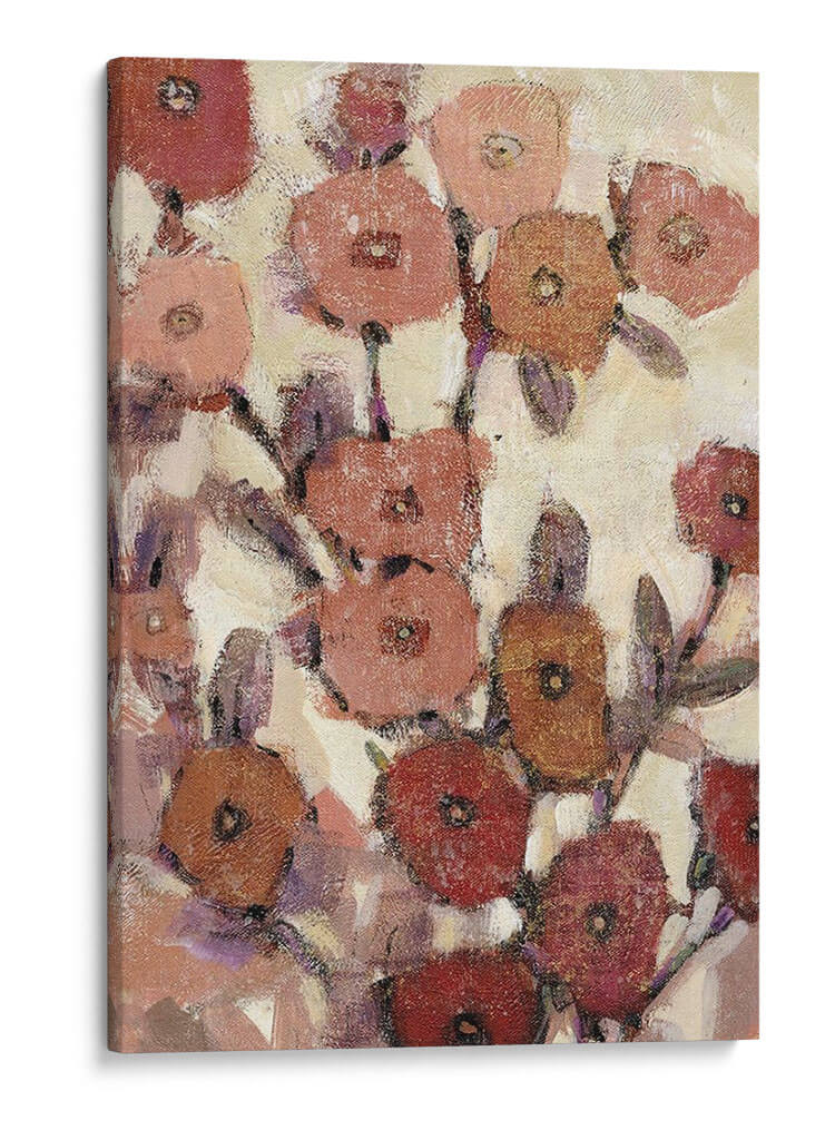 Sumérgete en la delicadeza de "Patrones Florales II", una obra de arte contemporáneo de Tim O'Toole que captura la esencia de un jardín en plena floración con un estilo expresionista y una paleta de colores cálidos y terrosos. Cada pétalo, pintado con pinceladas audaces pero sutiles, evoca una sensación de movimiento y vida, creando un tapiz visual que invita a la contemplación. Los tonos rojizos, rosados, anaranjados y púrpuras se entrelazan sobre un fondo cremoso, aportando calidez y serenidad a cualquier espacio. Esta pieza es ideal para añadir un toque de naturaleza estilizada y elegancia a salones modernos, dormitorios acogedores u oficinas que buscan un ambiente inspirador y relajante. "Patrones Florales II" no es solo una decoración, es una invitación a la belleza efímera de las flores, reinterpretada a través de la visión artística de O'Toole, transformando tu pared en un lienzo de emociones y texturas.