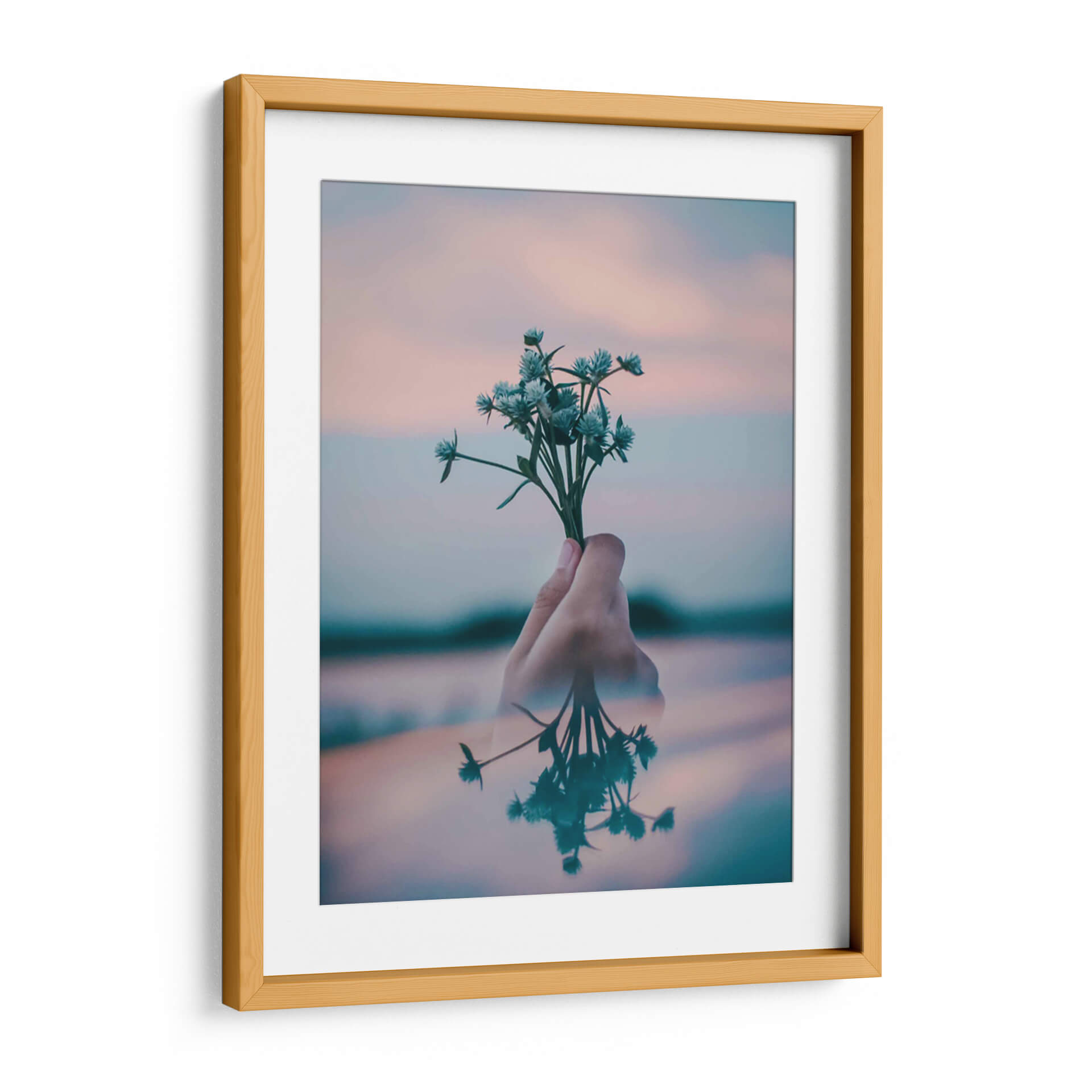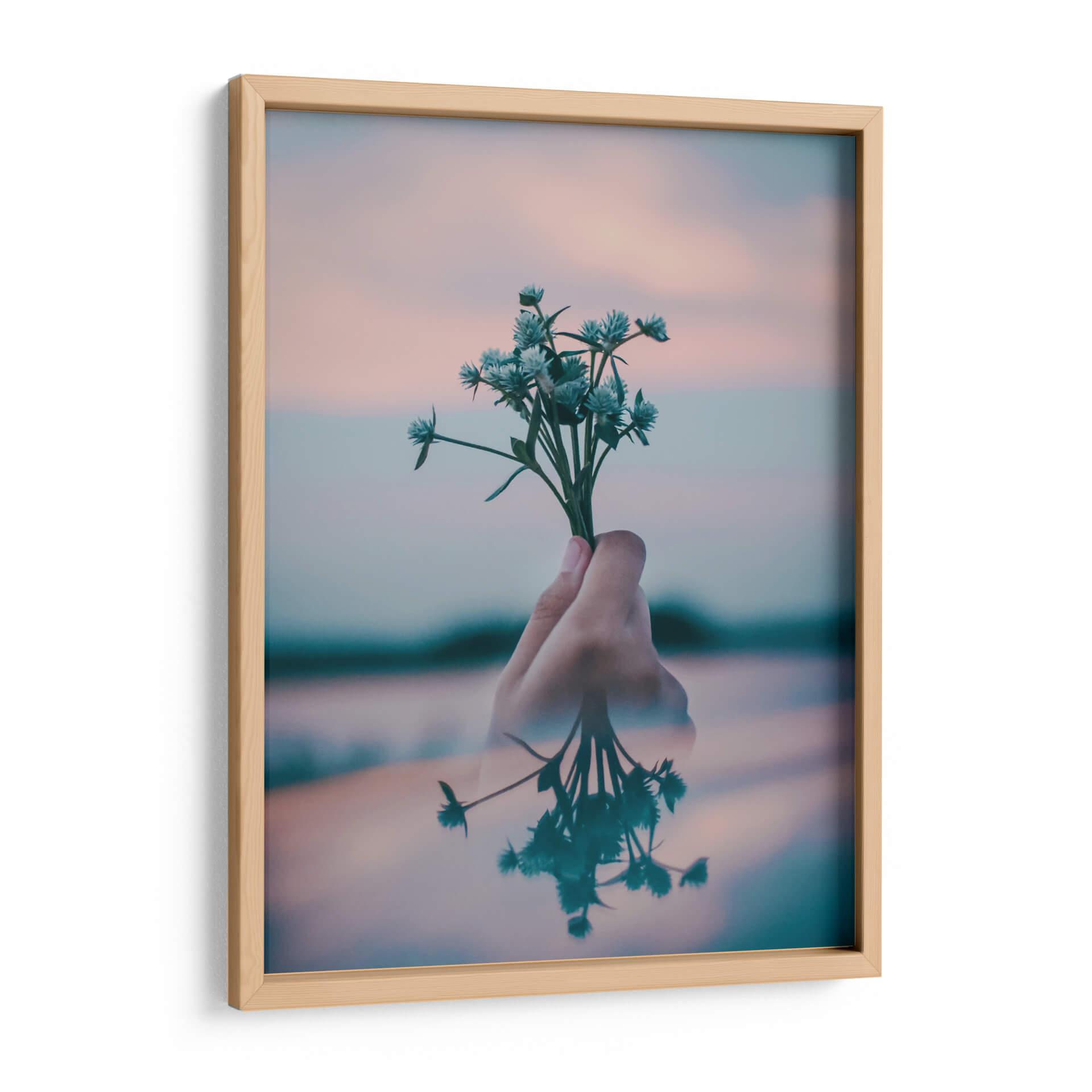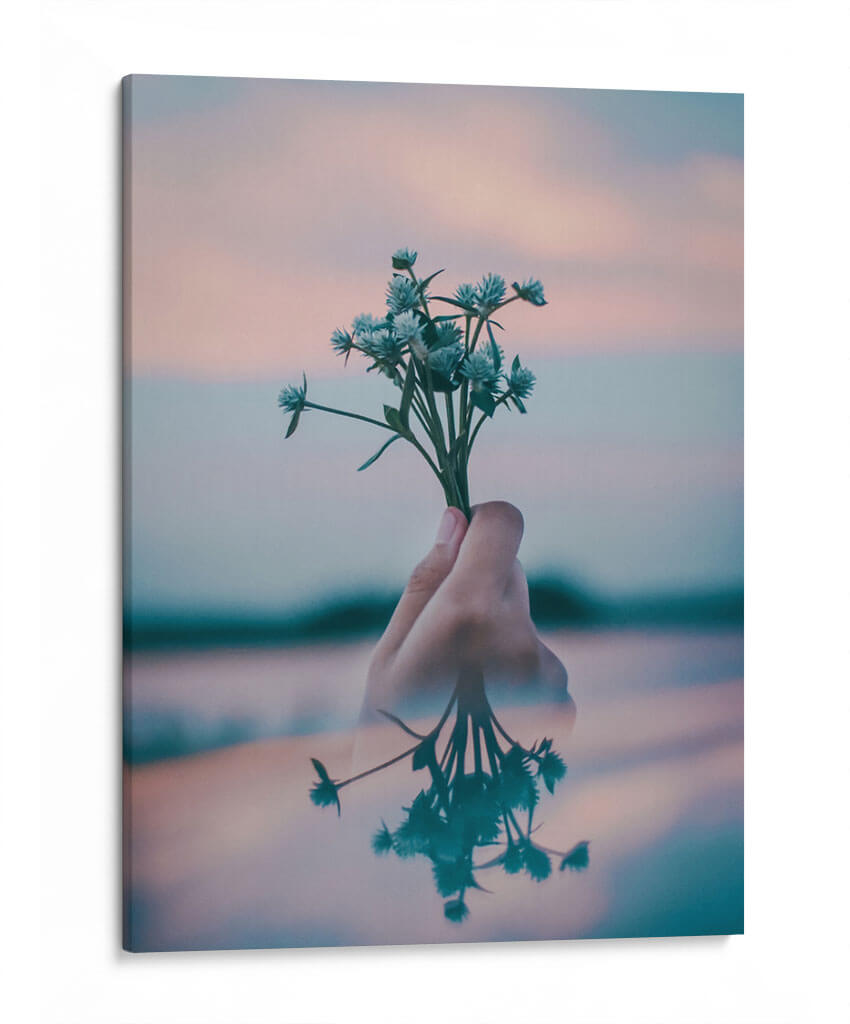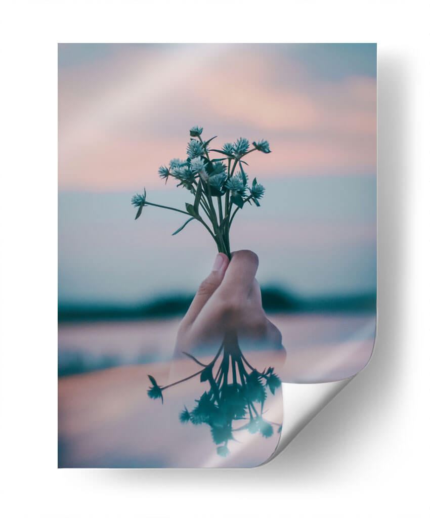 Este delicado cuadro decorativo captura un momento etéreo de serenidad y conexión con la naturaleza. La imagen presenta una mano sosteniendo un pequeño ramillete de flores silvestres de tonos azulados, que contrastan sutilmente con un cielo al atardecer de suaves matices rosados y anaranjados. La composición se enriquece con un reflejo acuático que duplica la imagen de las flores y la mano, añadiendo una capa de profundidad y misterio a la escena. Los colores pastel y la luz suave crean una atmósfera de calma y tranquilidad, ideal para espacios que buscan transmitir paz y armonía. Este arte de pared es perfecto para añadir un toque de delicadeza y contemplación a tu dormitorio, sala de estar o incluso a un rincón de lectura. Su estilo, que evoca una sensación de intimidad y minimalismo natural, lo convierte en una pieza versátil que complementa una amplia gama de estilos decorativos contemporáneos. Permite que "Pequeño ramillete" transforme tu hogar en un santuario de serenidad, invitando a la reflexión y al aprecio por la belleza simple de la naturaleza.