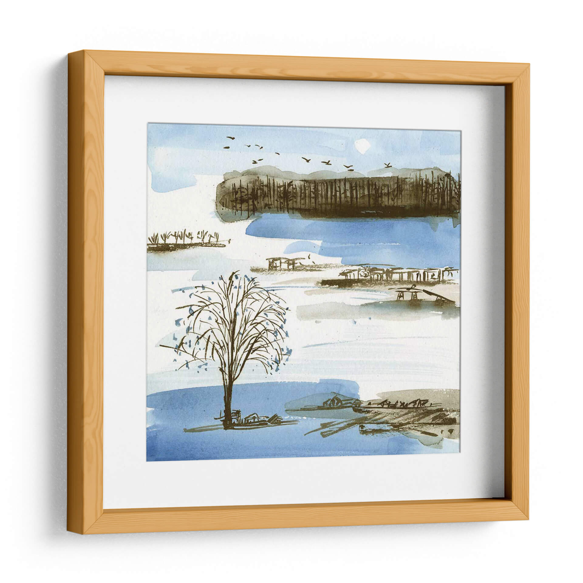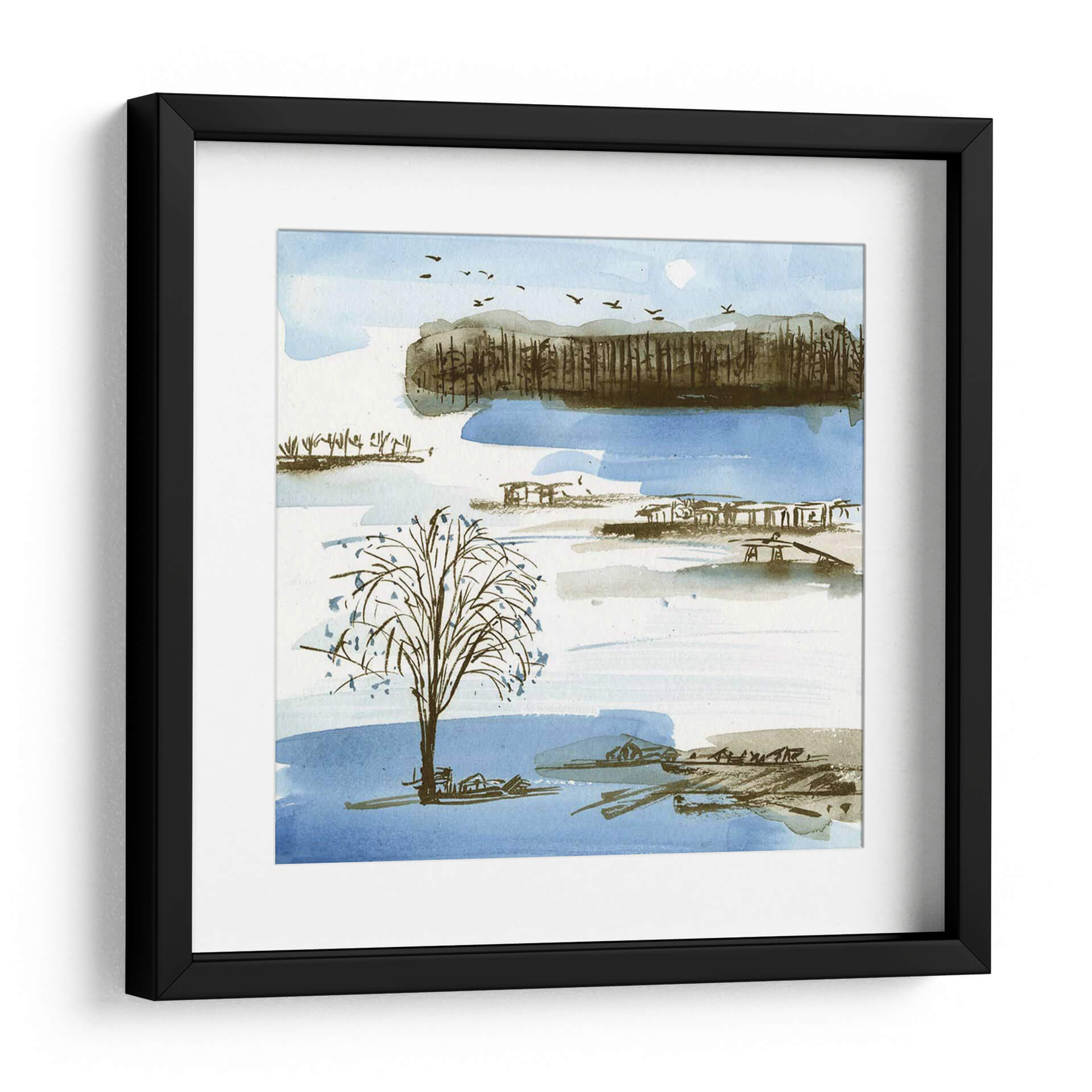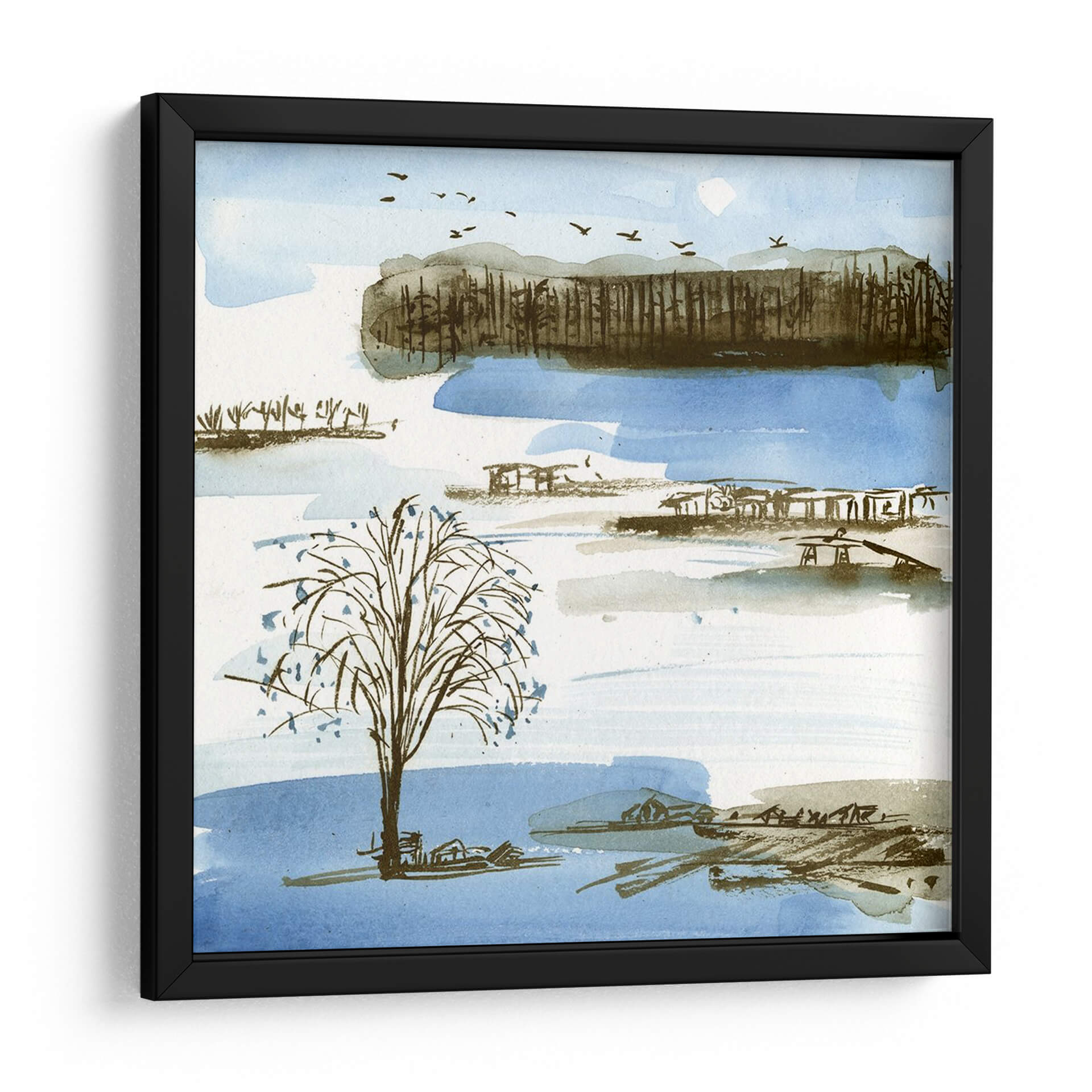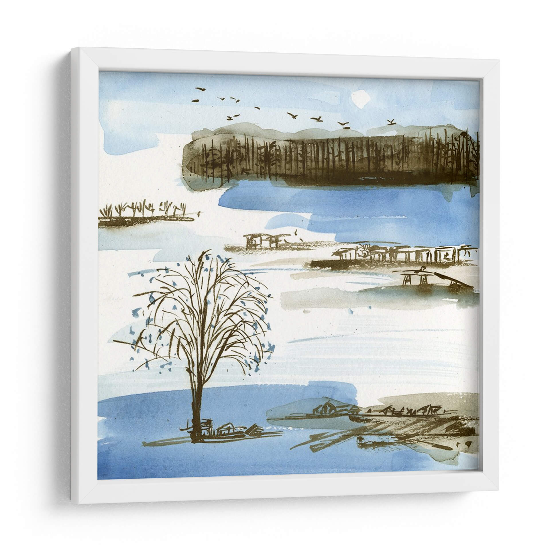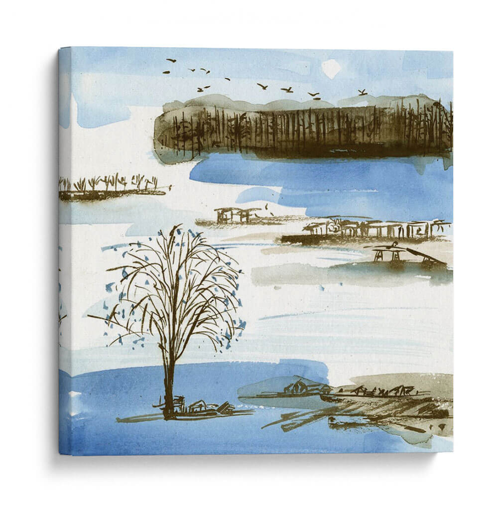 Sumérgete en la serenidad de "Pueblo Pico I", una cautivadora obra de arte de Melissa Wang que evoca la tranquilidad de un paisaje sereno. Con una paleta de colores suaves que combina azules celestes, tonos tierra y toques de gris, esta pieza captura la esencia de un día apacible junto al agua. Las delicadas pinceladas de acuarela dan vida a un árbol solitario en primer plano, rodeado por estructuras sugerentes y una línea de árboles en la distancia, todo ello bajo un cielo salpicado de pájaros en vuelo. El estilo, que roza lo impresionista con una sensibilidad contemporánea, crea una atmósfera de calma y contemplación, perfecta para transformar cualquier espacio en un refugio de paz. Este cuadro decorativo es ideal para añadir un toque de naturaleza y serenidad a tu salón, dormitorio o estudio, invitando a la reflexión y al descanso. Su composición equilibrada y su evocadora belleza lo convierten en una elección exquisita para quienes buscan arte que hable al alma y embellezca su hogar con una elegancia sutil y atemporal. "Pueblo Pico I" es más que una imagen; es una invitación a desconectar y encontrar la calma en medio del día a día.