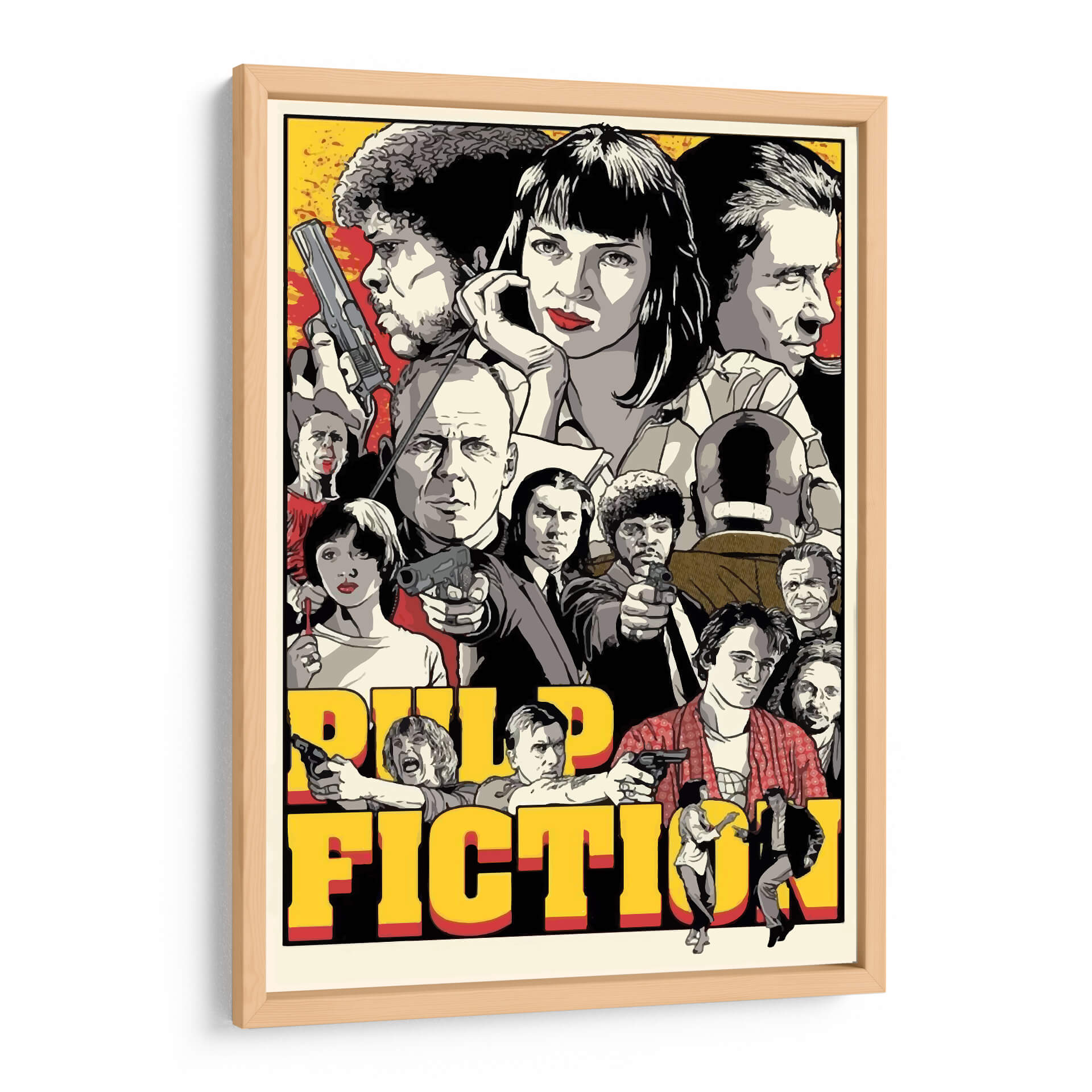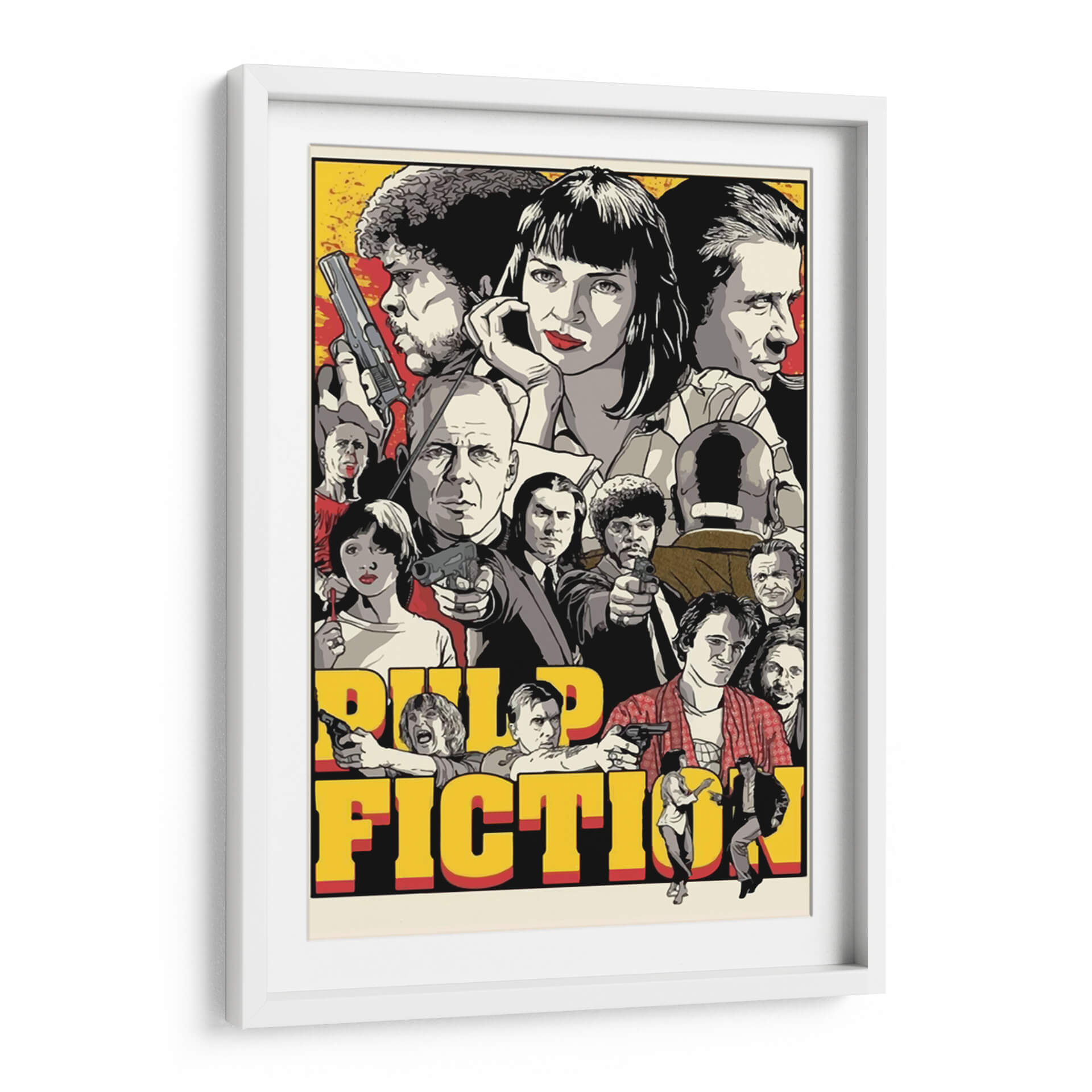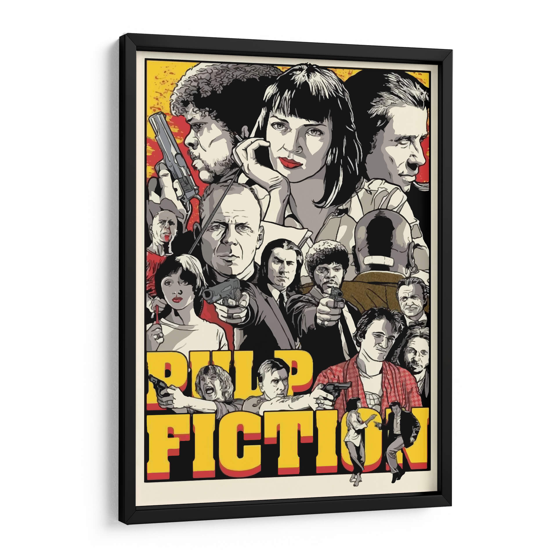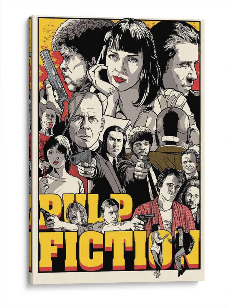 Sumérgete en el icónico mundo del cine con este cautivador cuadro decorativo inspirado en 'Pulp Fiction'. Esta obra captura la esencia audaz y estilizada de la película, presentando un collage dinámico de sus personajes más memorables. La paleta de colores, dominada por tonos vibrantes de amarillo, rojo y blanco y negro, crea un contraste impactante que evoca la energía y el misterio del film. La composición, que agrupa a los personajes de manera intrincada, invita a la contemplación, revelando detalles sutiles con cada mirada. Este cuadro es una pieza de arte pop perfecta para cualquier aficionado al cine o para aquellos que buscan añadir un toque de nostalgia y carácter a su sala de estar, estudio u oficina. Su diseño gráfico audaz y su temática reconocible lo convierten en un punto focal instantáneo, capaz de iniciar conversaciones y añadir personalidad a cualquier espacio moderno. Dale vida a tus paredes con este homenaje visual al cine de culto.