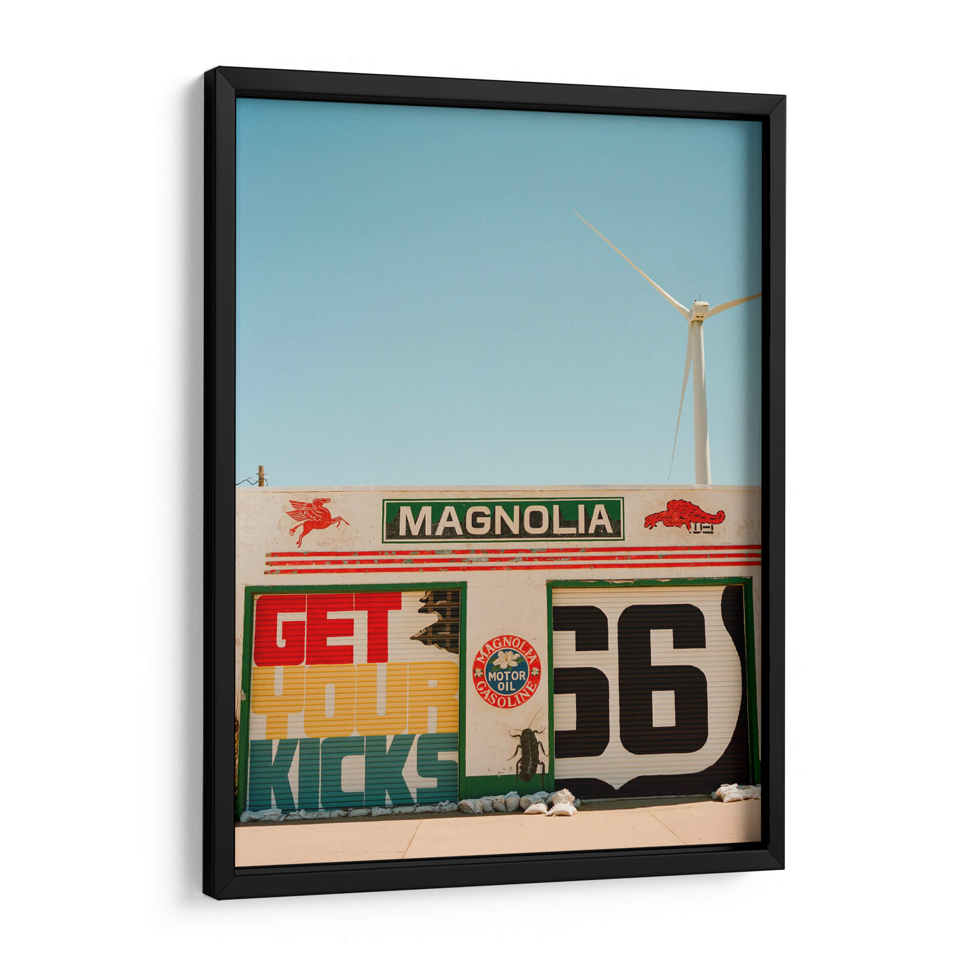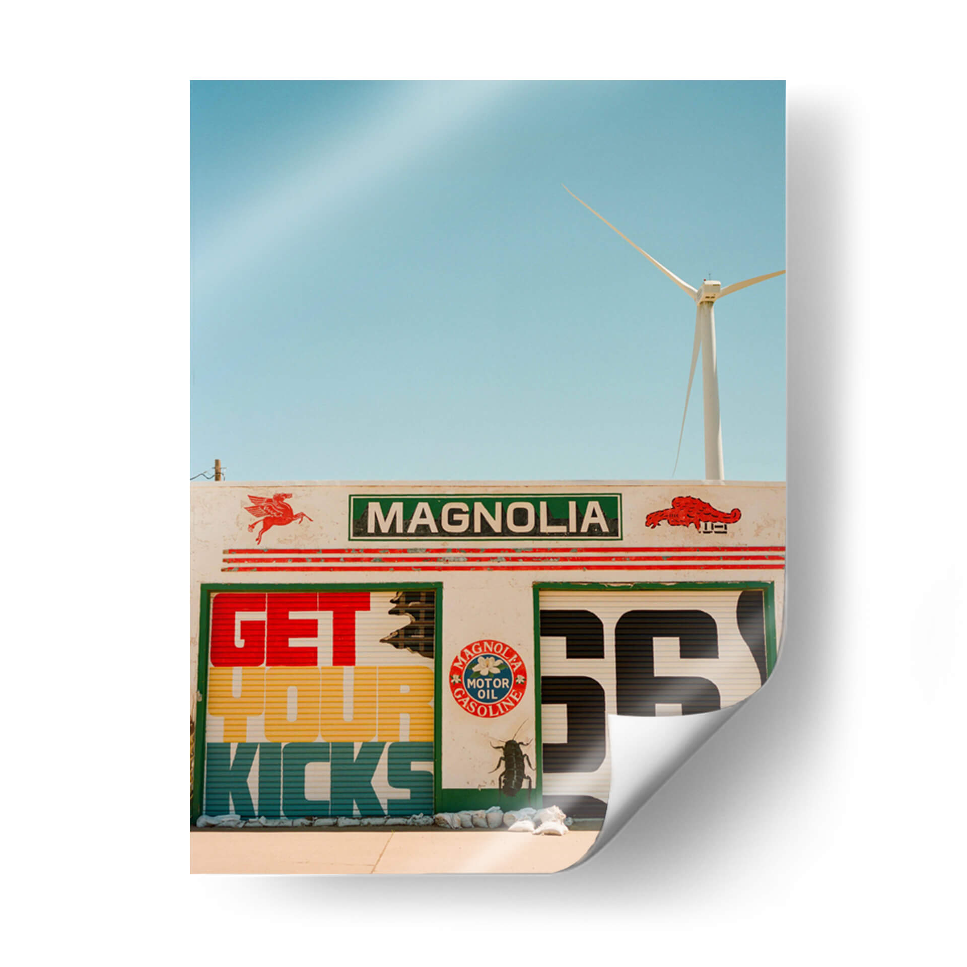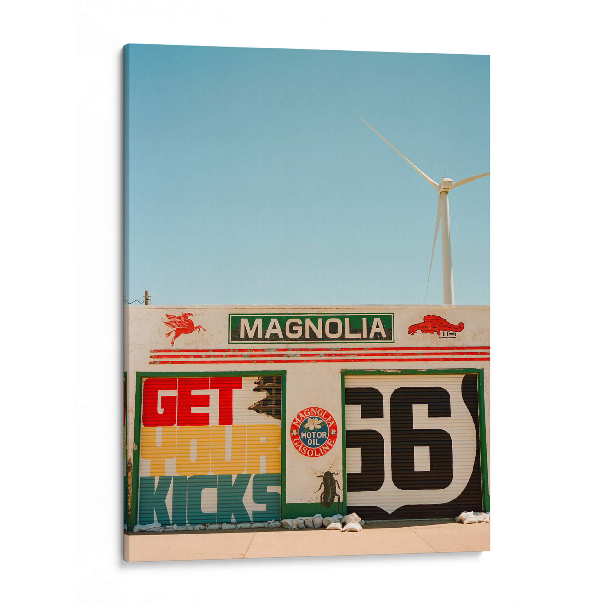 Revive la nostalgia y la aventura de la carretera con "Ruta 66 VI", una obra de Bethany Young que captura la esencia icónica de una parada de servicio clásica. Este cuadro decorativo te transporta a una época de viajes por carretera y libertad, con su vibrante paleta de colores y su audaz composición gráfica. Los detalles de la señalización retro, con el emblemático número '66' y el lema "Get Your Kicks", evocan instantáneamente un sentido de aventura y la promesa de nuevos horizontes. La presencia de un aerogenerador en el horizonte añade un toque moderno y un guiño a la sostenibilidad, creando un contraste fascinante entre lo clásico y lo contemporáneo. Los tonos azules del cielo despejado y los colores cálidos y terrosos de la estructura transmiten una atmósfera de día soleado y energía. "Ruta 66 VI" es más que una simple decoración; es una invitación a la exploración y un homenaje a la cultura americana del automovilismo. Ideal para dar un toque retro y lleno de carácter a tu sala de estar, estudio o cualquier espacio que desees revitalizar con una pieza de arte única y llena de historia. Transforma tu hogar en un destino con este evocador cuadro decorativo.
