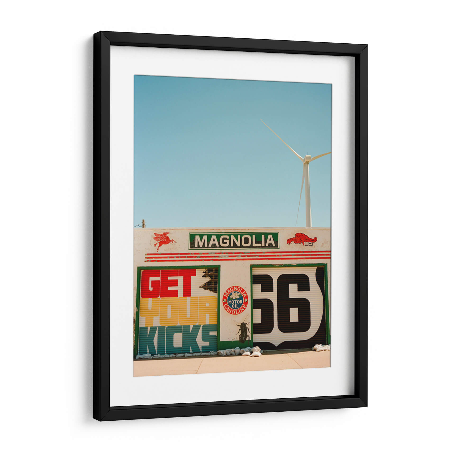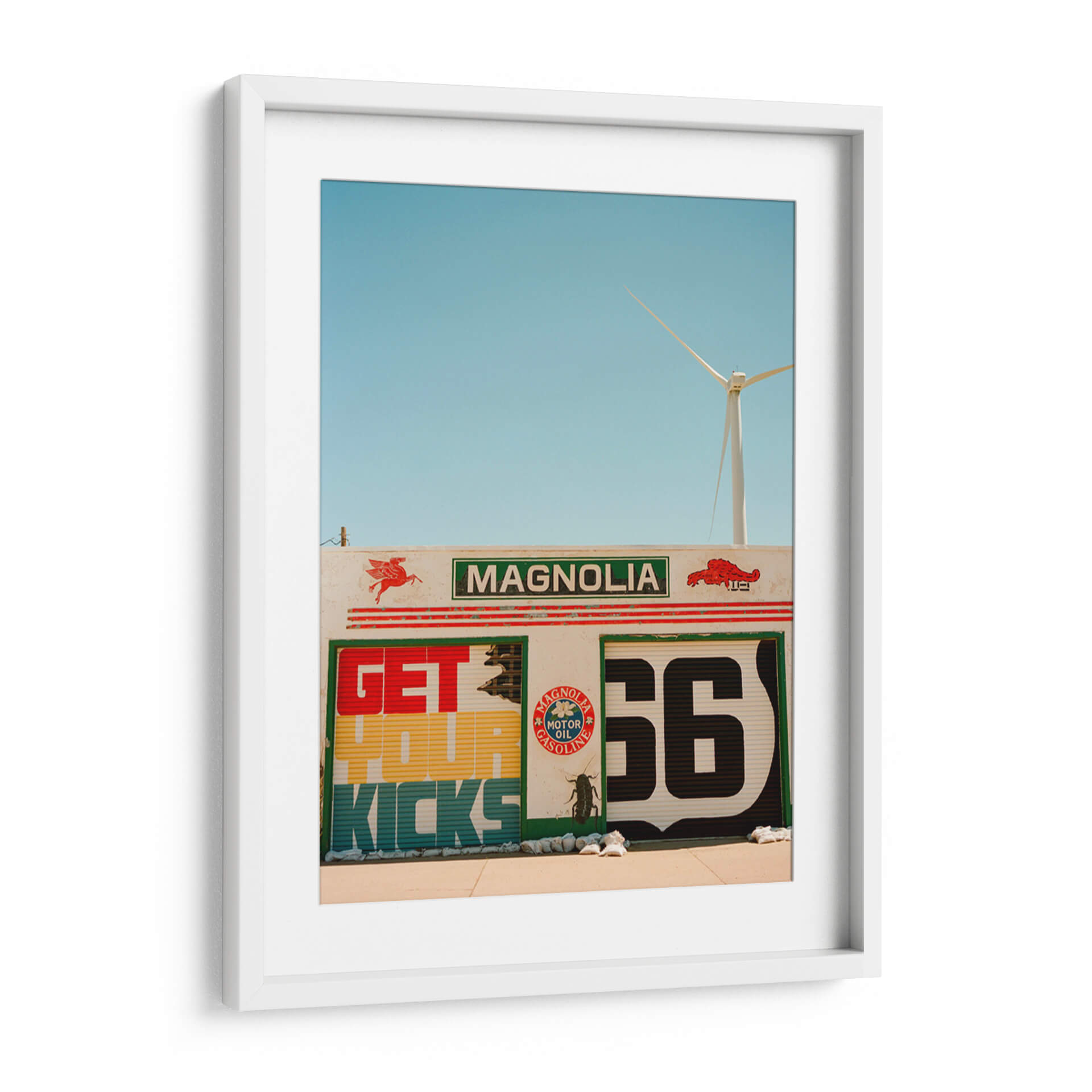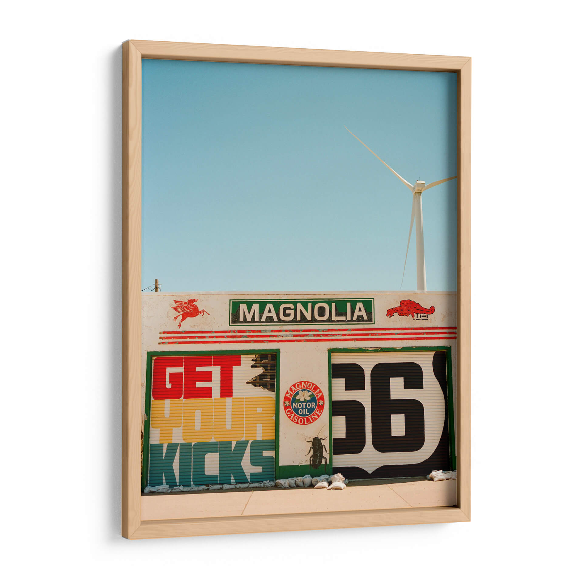 Revive la nostalgia y la aventura de la carretera con "Ruta 66 VI", una obra de Bethany Young que captura la esencia icónica de una parada de servicio clásica. Este cuadro decorativo te transporta a una época de viajes por carretera y libertad, con su vibrante paleta de colores y su audaz composición gráfica. Los detalles de la señalización retro, con el emblemático número '66' y el lema "Get Your Kicks", evocan instantáneamente un sentido de aventura y la promesa de nuevos horizontes. La presencia de un aerogenerador en el horizonte añade un toque moderno y un guiño a la sostenibilidad, creando un contraste fascinante entre lo clásico y lo contemporáneo. Los tonos azules del cielo despejado y los colores cálidos y terrosos de la estructura transmiten una atmósfera de día soleado y energía. "Ruta 66 VI" es más que una simple decoración; es una invitación a la exploración y un homenaje a la cultura americana del automovilismo. Ideal para dar un toque retro y lleno de carácter a tu sala de estar, estudio o cualquier espacio que desees revitalizar con una pieza de arte única y llena de historia. Transforma tu hogar en un destino con este evocador cuadro decorativo.