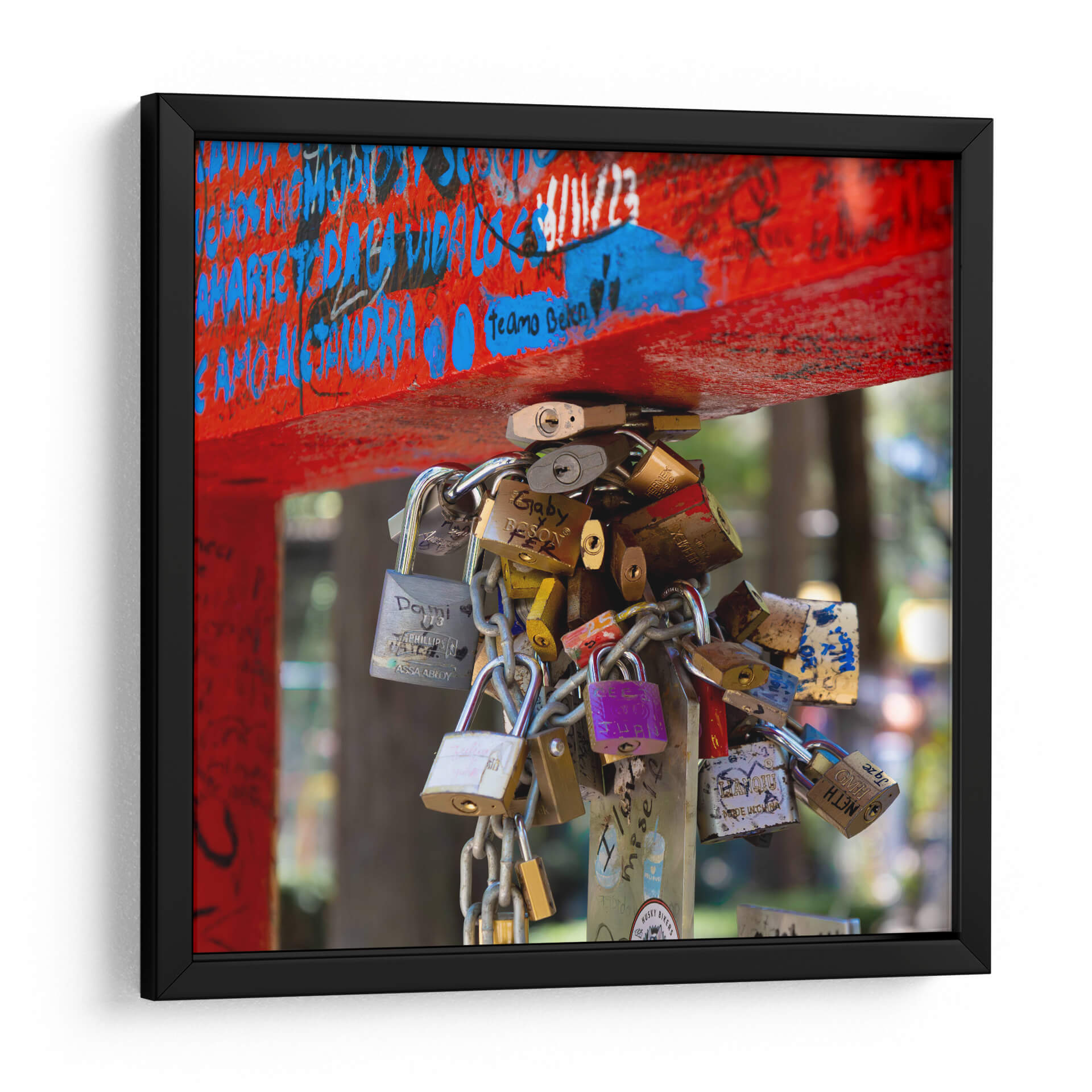 Este cautivador cuadro decorativo, titulado 'Secretos de amor', es una obra de arte contemporáneo que captura la esencia de las promesas y los vínculos eternos. La pieza se centra en un cúmulo de candados entrelazados, símbolos universales de unión y compromiso, que cuelgan de una estructura de metal vibrante, adornada con grafitis y mensajes. Los colores predominantes, un rojo intenso y vivos toques de azul y amarillo en los candados, crean un contraste dinámico que atrae la mirada y añade energía al espacio. La fotografía, con su enfoque nítido en los candados y un fondo desenfocado que sugiere un entorno urbano o un parque, evoca una sensación de intimidad y a la vez de espacio compartido. Ideal para quienes buscan añadir un toque de romanticismo moderno, significado personal o un punto de conversación a sus hogares u oficinas. Este cuadro decorativo es perfecto para salones, dormitorios o cualquier lugar donde se desee celebrar el amor y las conexiones humanas con estilo.