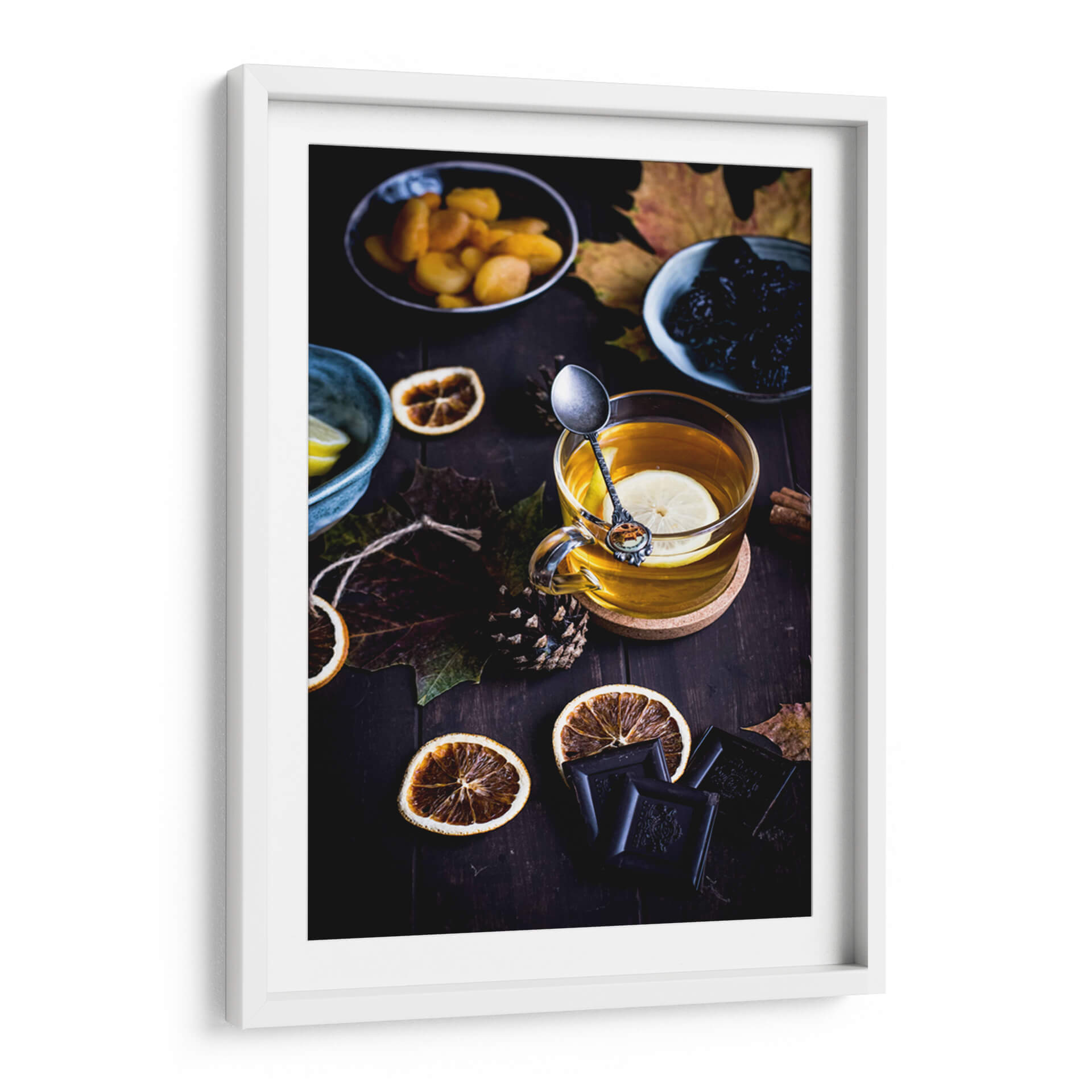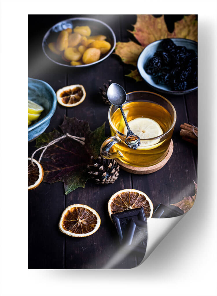 Sumérgete en la calidez reconfortante de nuestro cuadro "Té Bohemio", una obra que captura la esencia de una pausa acogedora. Esta pieza visual evoca sensaciones de tranquilidad y placer sencillo, perfecta para añadir un toque de serenidad a tu hogar u oficina. La composición se centra en una taza de té humeante, adornada con una rodaja de limón y una cucharilla elegante, rodeada de elementos que evocan el otoño y la abundancia: hojas secas, rodajas de naranja deshidratada, piñas y trozos de chocolate negro. La paleta de colores profundos, dominada por tonos tierra, ocres, marrones oscuros y el ámbar dorado del té, crea una atmósfera rica y envolvente. El estilo fotográfico, con una iluminación cuidada y un enfoque selectivo, resalta la textura y la calidez de cada elemento, invitando a la contemplación. Este cuadro decorativo es ideal para espacios que buscan transmitir confort y un aire de sofisticación rústica, como salones, cocinas o estudios. Transforma tu ambiente con esta representación artística de un momento de disfrute, una invitación visual a relajarte y saborear la vida.