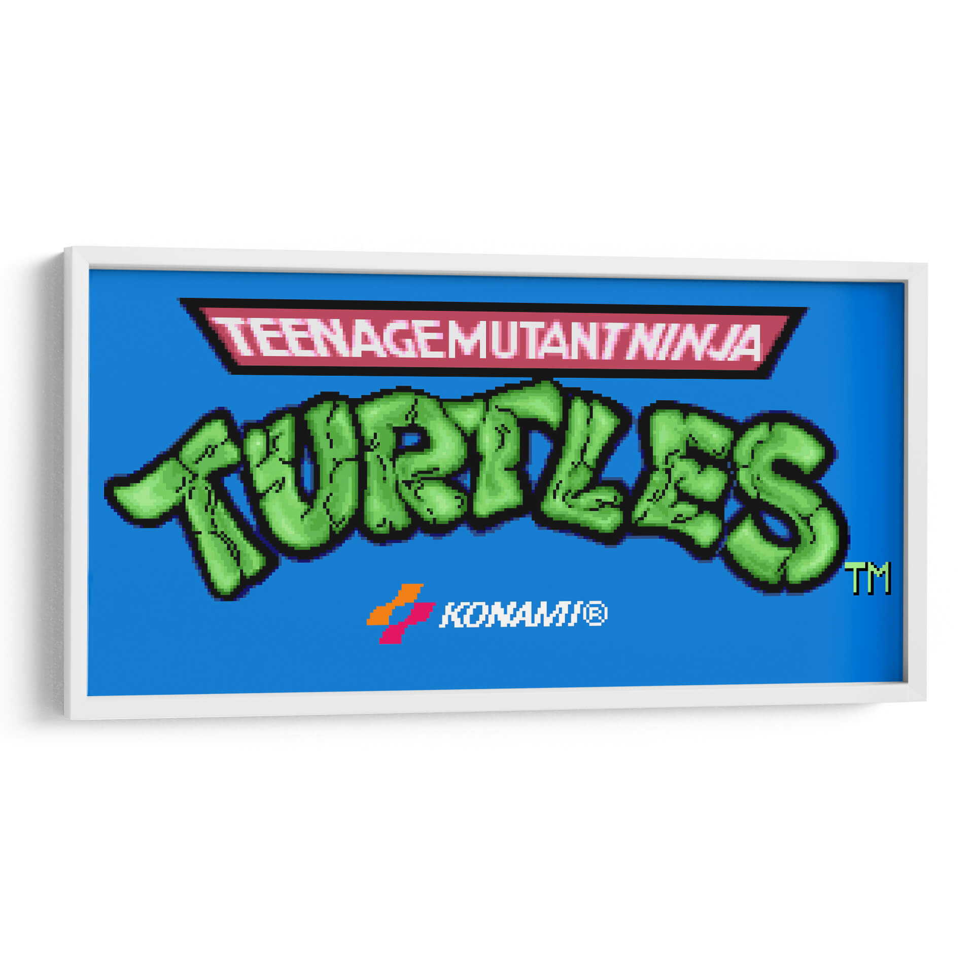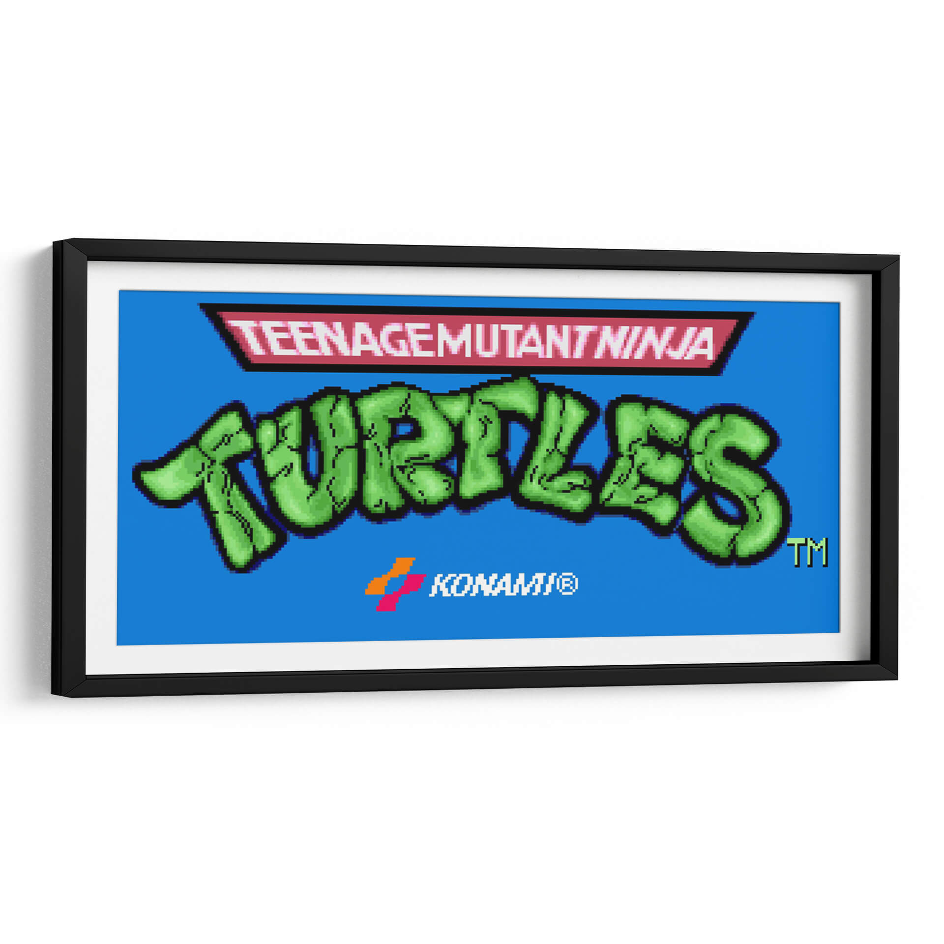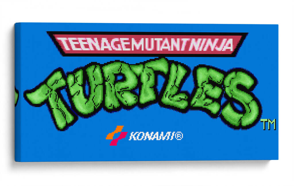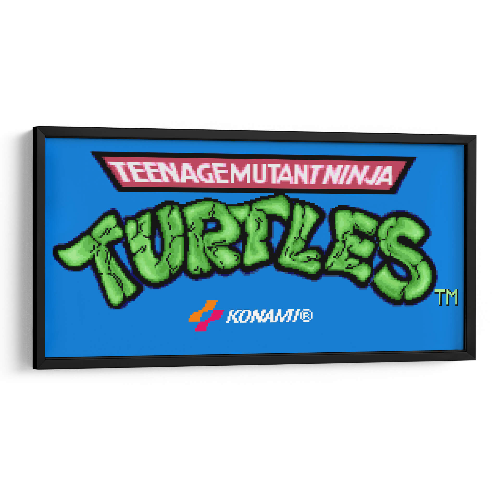Revive la nostalgia de los 90 con este vibrante cuadro decorativo inspirado en la icónica pantalla de título del videojuego "Teenage Mutant Ninja Turtles" para Super Nintendo. El diseño presenta el audaz logo de "TURTLES" en un llamativo verde brillante, contrastando con un fondo azul eléctrico que evoca la energía de la consola de videojuegos. Encima, el distintivo logo de "TEENAGEMUTANTNINJA" se presenta en un recuadro rojo con detalles en negro, un guiño directo a la estética retro del juego. La inclusión sutil del logo de Konami refuerza su autenticidad y conexión con la era dorada de los videojuegos. Este cuadro es perfecto para añadir un toque de diversión y cultura pop a cualquier espacio, desde una sala de juegos o dormitorio hasta una oficina moderna. Su composición gráfica y colores primarios lo convierten en una pieza de conversación ideal para los amantes de los videojuegos clásicos y la cultura retro. Ideal para crear un ambiente dinámico y lleno de carácter, este cuadro decorativo es una forma fantástica de celebrar tus personajes favoritos y la era que definió a una generación de jugadores.