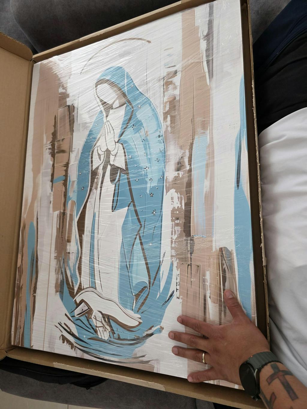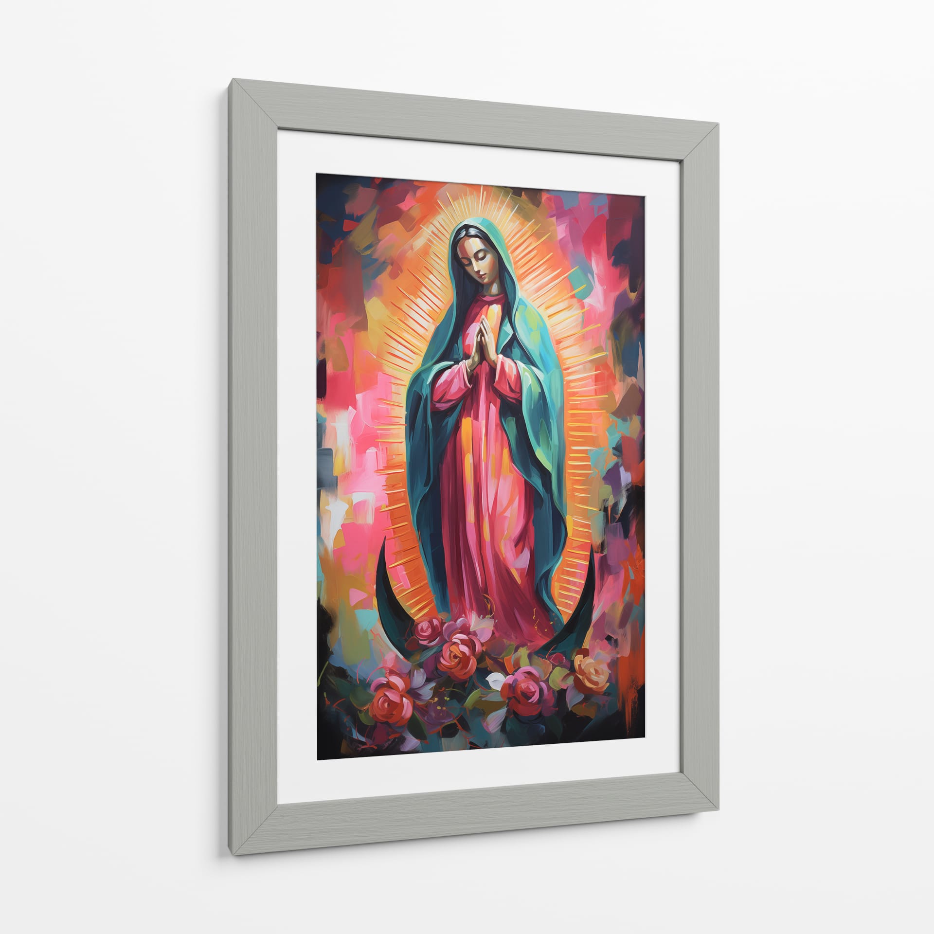 Sumérgete en la devoción y el arte moderno con este cautivador cuadro decorativo de la Virgen de Guadalupe, una obra que fusiona lo sagrado con una explosión de color contemporáneo. El artista Dav Madrid reinterpreta un ícono espiritual con pinceladas audaces y una paleta vibrante que redefine la tradición. La figura central de la Virgen, representada con profunda serenidad y las manos unidas en oración, se encuentra rodeada por un halo de luz radiante y un fondo abstracto de tonos cálidos como naranjas, rosas y amarillos, contrastando con toques de azul profundo y morado que añaden intensidad. Las sutiles formas sugerentes y la pincelada expresiva crean una atmósfera de fe renovada y esperanza. Los delicados detalles de rosas a los pies de la figura añaden un toque de ternura y belleza terrenal, equilibrando la divinidad con la naturaleza. Este cuadro decorativo es ideal para infundir espiritualidad y un toque de arte contemporáneo a cualquier sala de estar, dormitorio, o espacio de meditación. Su energía visual y su profundo simbolismo lo convierten en una pieza central inspiradora, perfecta para aquellos que buscan conectar con su fe a través del arte o simplemente apreciar una interpretación única y poderosa de un símbolo universalmente reconocido. Añade esta obra maestra a tu colección y deja que su luz y color llenen tu hogar de paz y significado.