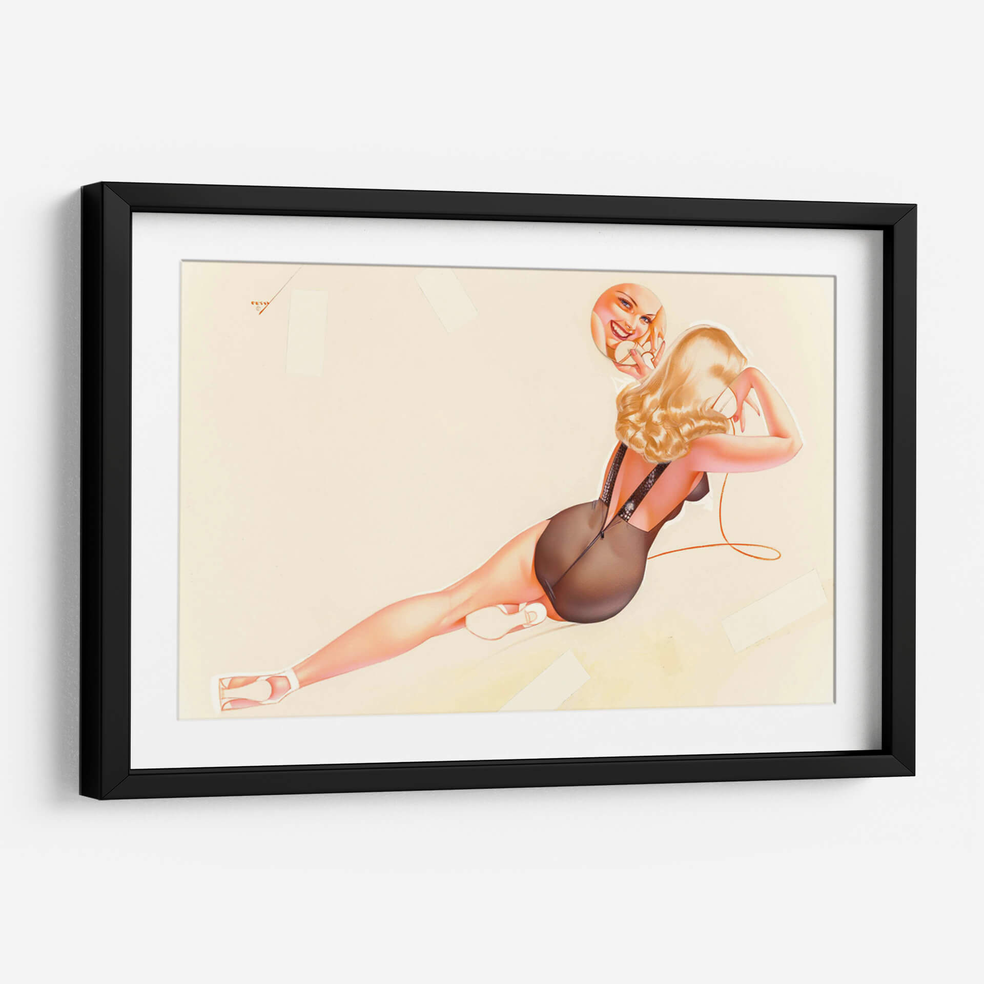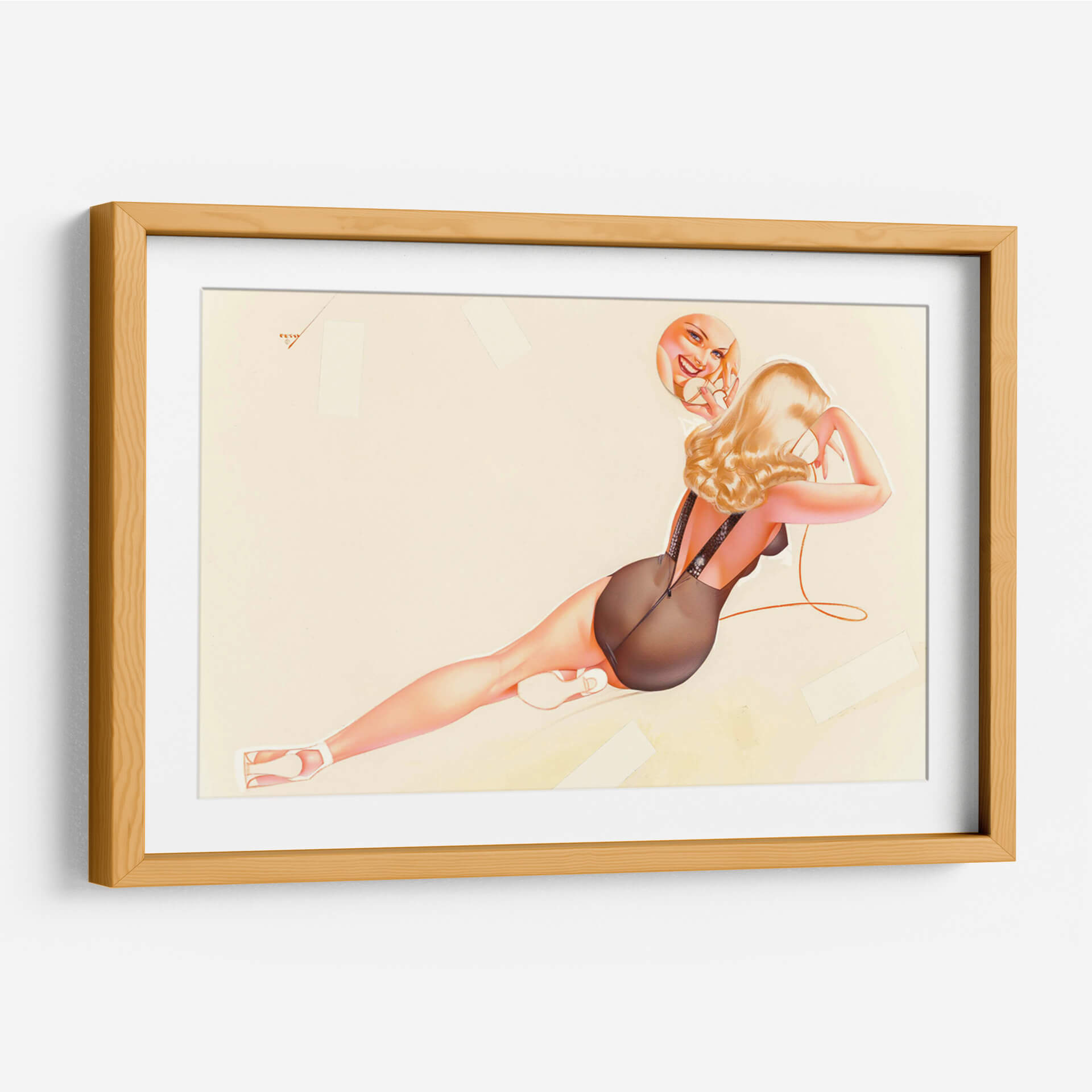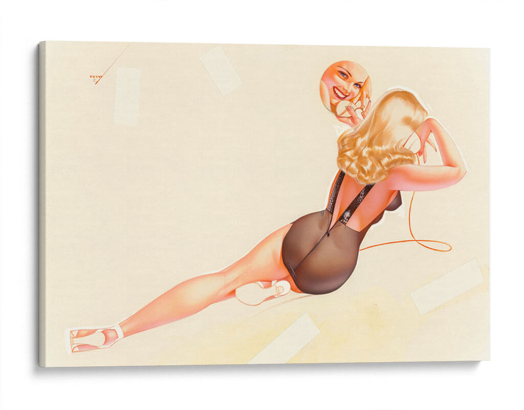 Sumérgete en el encanto vintage y el misterio con "Vistazo de Rubia", una obra de arte que evoca la nostalgia de las ilustraciones clásicas. Esta pieza presenta a una figura femenina rubia, capturada en una pose sugerente y elegante, que sostiene una máscara sonriente. La paleta de colores suaves, dominada por tonos crema y pasteles cálidos, junto con sutiles acentos en negro y piel, crea una atmósfera íntima y cautivadora. El estilo, reminiscente del pin-up art y la ilustración retro, juega con la dualidad de la expresión, invitando a la reflexión sobre las apariencias y las emociones ocultas. La composición dinámica y la atención al detalle en la figura y su vestimenta la convierten en un punto focal intrigante. Ideal para añadir un toque de sofisticación retro a tu salón, tocador o cualquier espacio que busque una declaración de estilo única. Este cuadro decorativo es perfecto para quienes aprecian el arte con narrativa y un aire de misterio coqueto, transformando cualquier pared en una galería personal con un toque de glamour atemporal.
