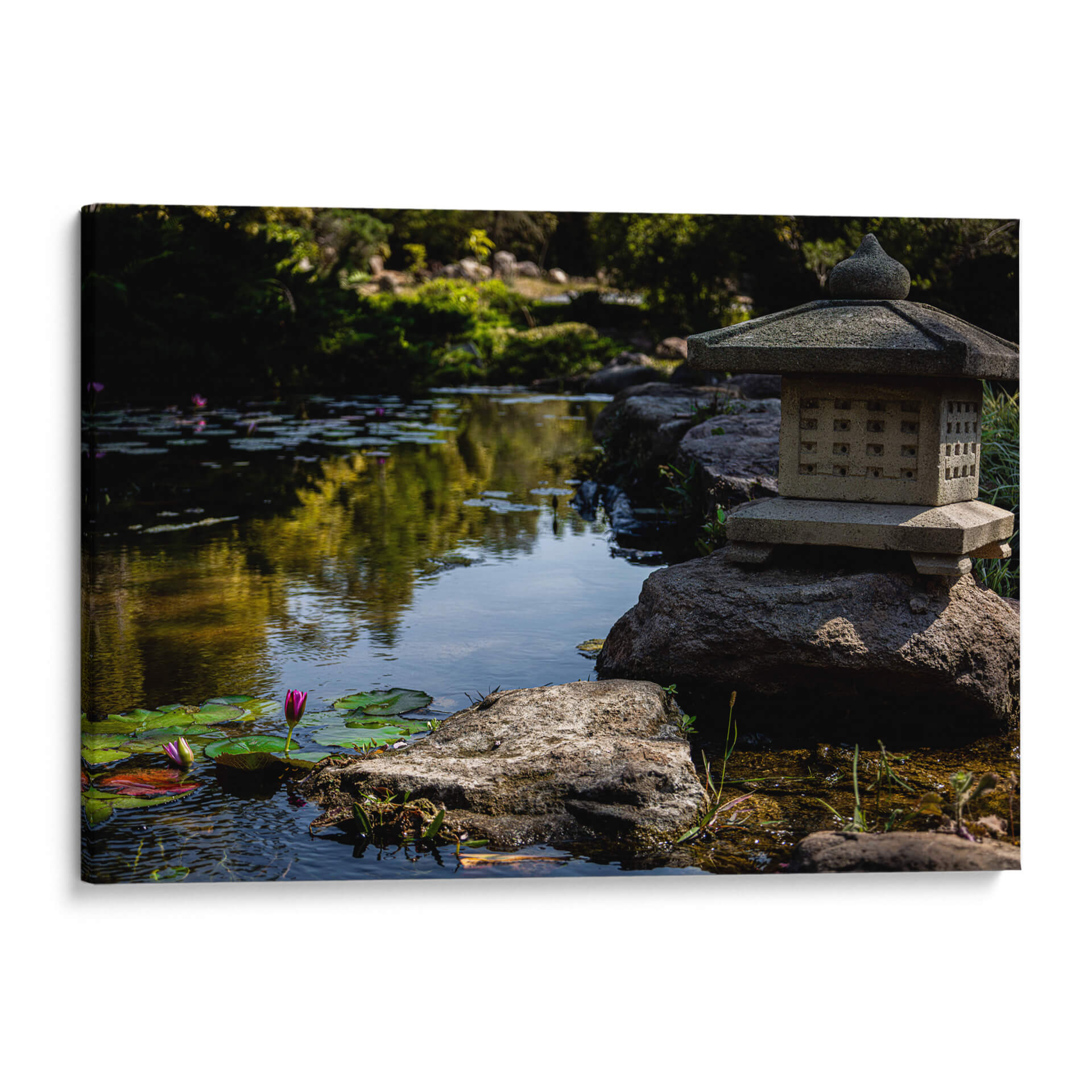 Sumérgete en la serenidad de "Zen Pond", una obra de arte digital que captura la esencia pacífica de un jardín japonés. Este cuadro decorativo te transportará a un oasis de calma con su representación de un estanque sereno, salpicado de delicados lirios acuáticos en tonos rosados y vibrantes verdes. La composición se centra en una linterna de piedra tradicional, estratégicamente colocada sobre rocas, que añade un toque de autenticidad y misterio a la escena. Los colores predominantes, una mezcla de azules profundos del agua, verdes exuberantes del follaje y los tonos terrosos de la piedra, crean una atmósfera de tranquilidad y equilibrio. Ideal para quienes buscan infundir un sentido de paz y armonía en su hogar u oficina, este cuadro decorativo es perfecto para espacios que necesitan un respiro del ajetreo diario. Su estilo contemplativo lo convierte en un punto focal relajante para salas de estar, dormitorios o estudios, invitando a la meditación y al descanso visual. Añade un toque de naturaleza serena y sofisticación oriental a tu decoración con esta pieza inspiradora que evoca la belleza del minimalismo y la conexión con la naturaleza.