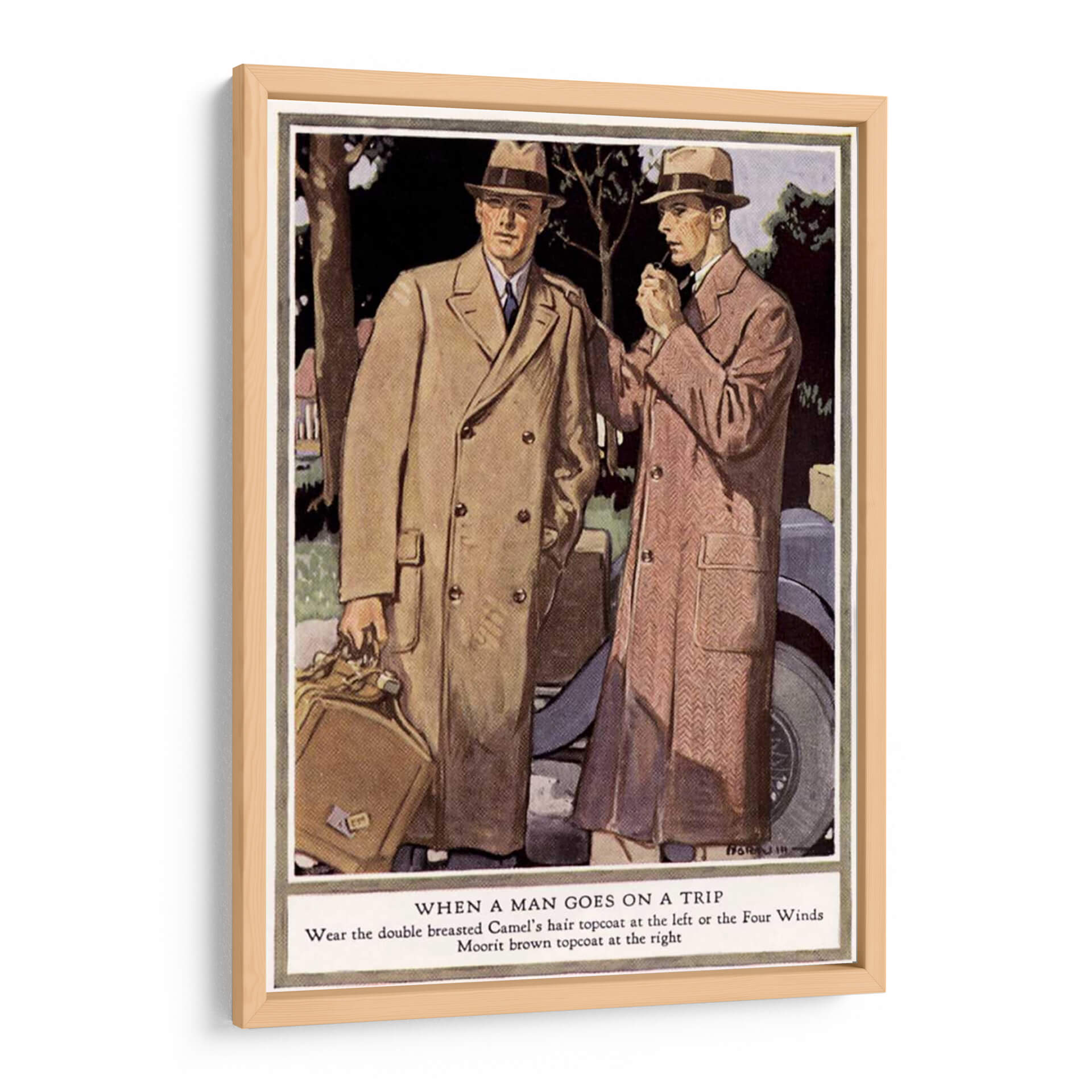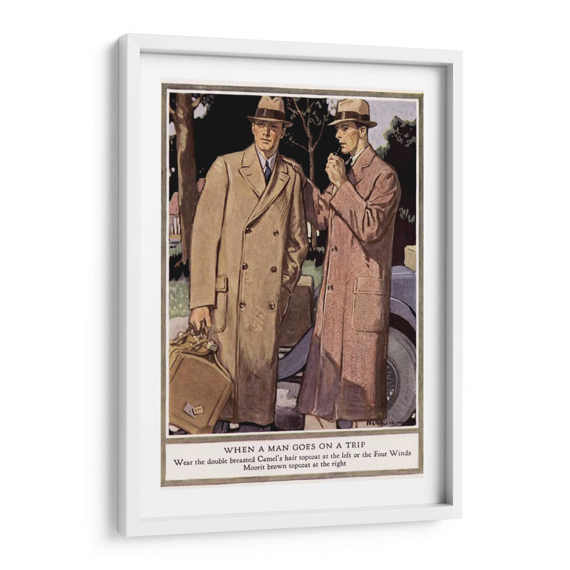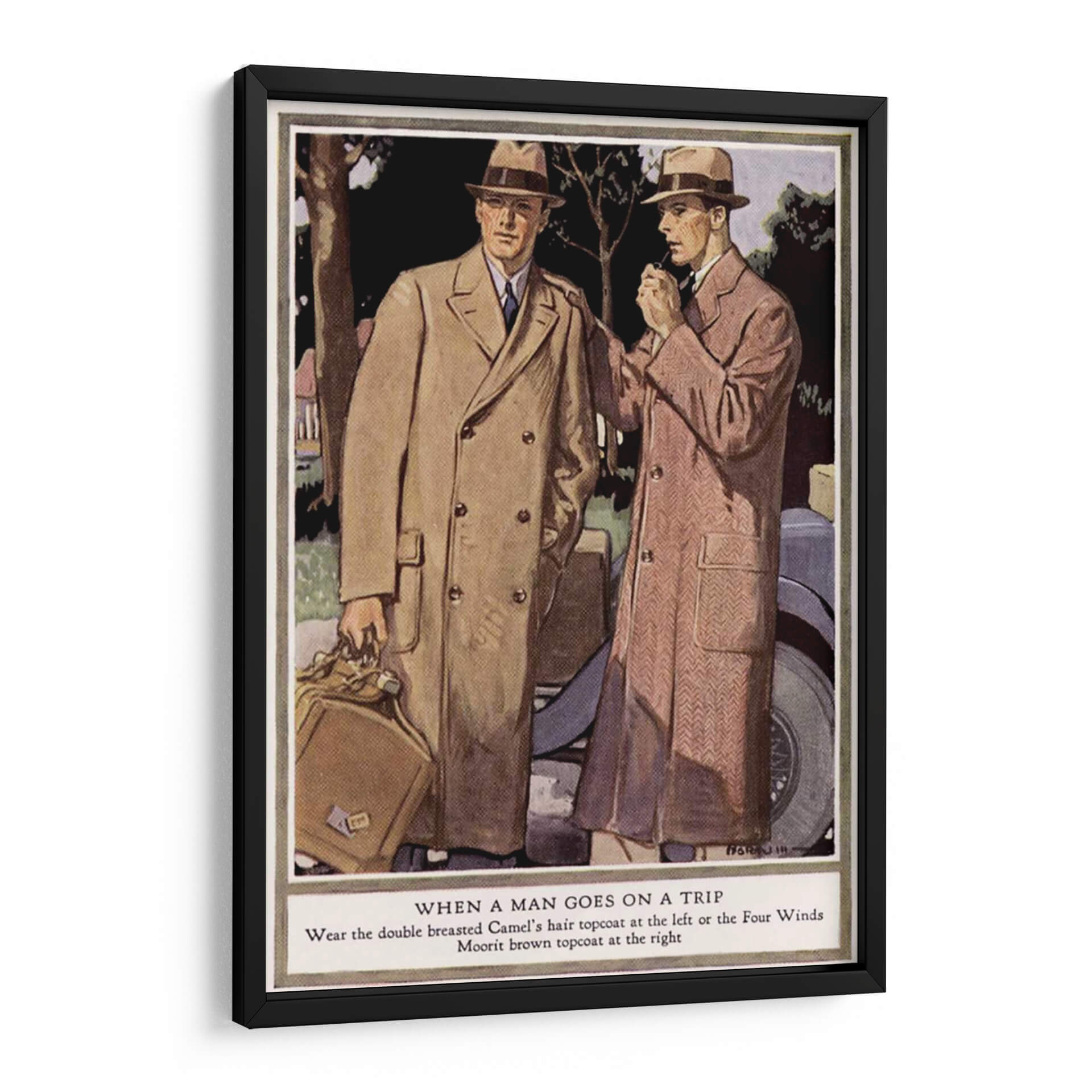 Sumérgete en la elegancia atemporal con este cuadro decorativo que captura la esencia de la moda masculina de antaño. La obra presenta a dos caballeros, vestidos con impecables abrigos y sombreros, en lo que parece ser el inicio de un viaje. La paleta de colores, dominada por tonos tierra, beige y rosas suaves, evoca una sensación de sofisticación y nostalgia. La composición detallada de las prendas, especialmente las texturas de los abrigos y la forma en que interactúan los personajes, transporta al espectador a una época de refinamiento. Este cuadro es ideal para quienes buscan añadir un toque de clase y carácter a su hogar u oficina. Perfecto para salas de estar, estudios o cualquier espacio que requiera una pieza con historia y estilo. Su atmósfera tranquila y reflexiva invita a la contemplación, convirtiéndolo en un punto focal cautivador que genera conversación y admiración. Una pieza que trasciende las tendencias, ofreciendo una ventana a la elegancia del pasado.