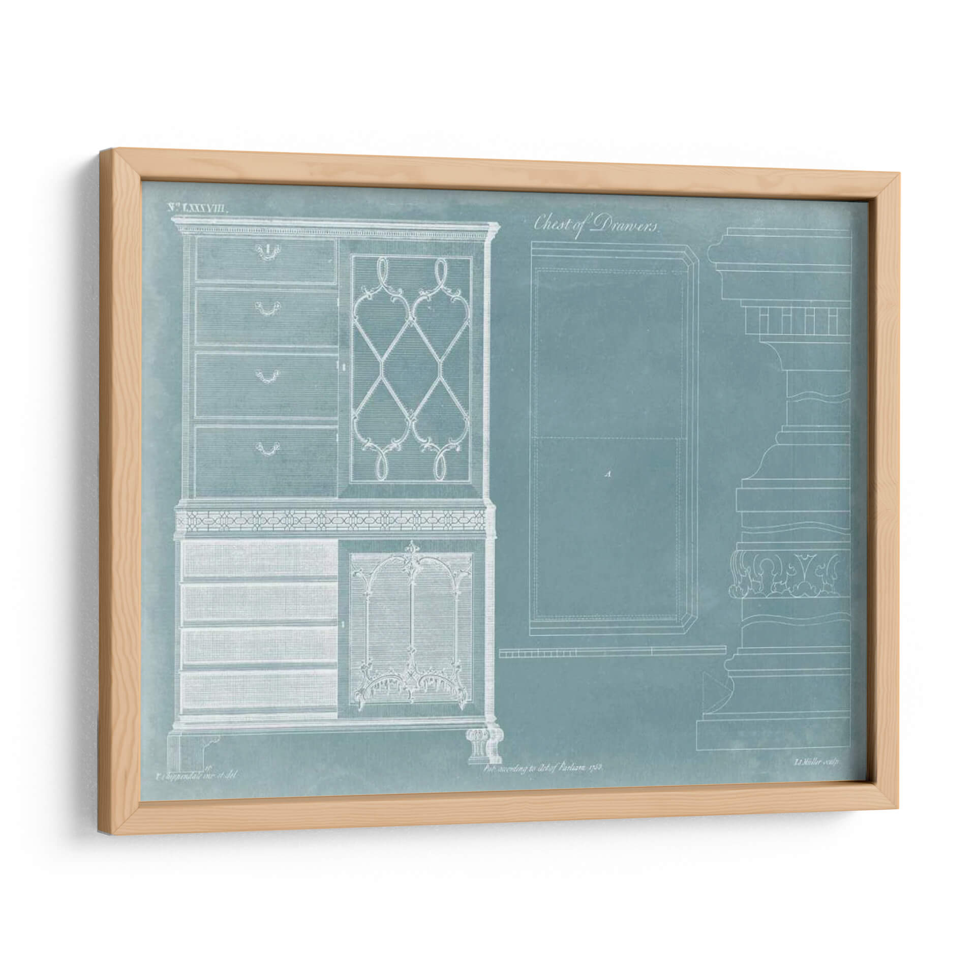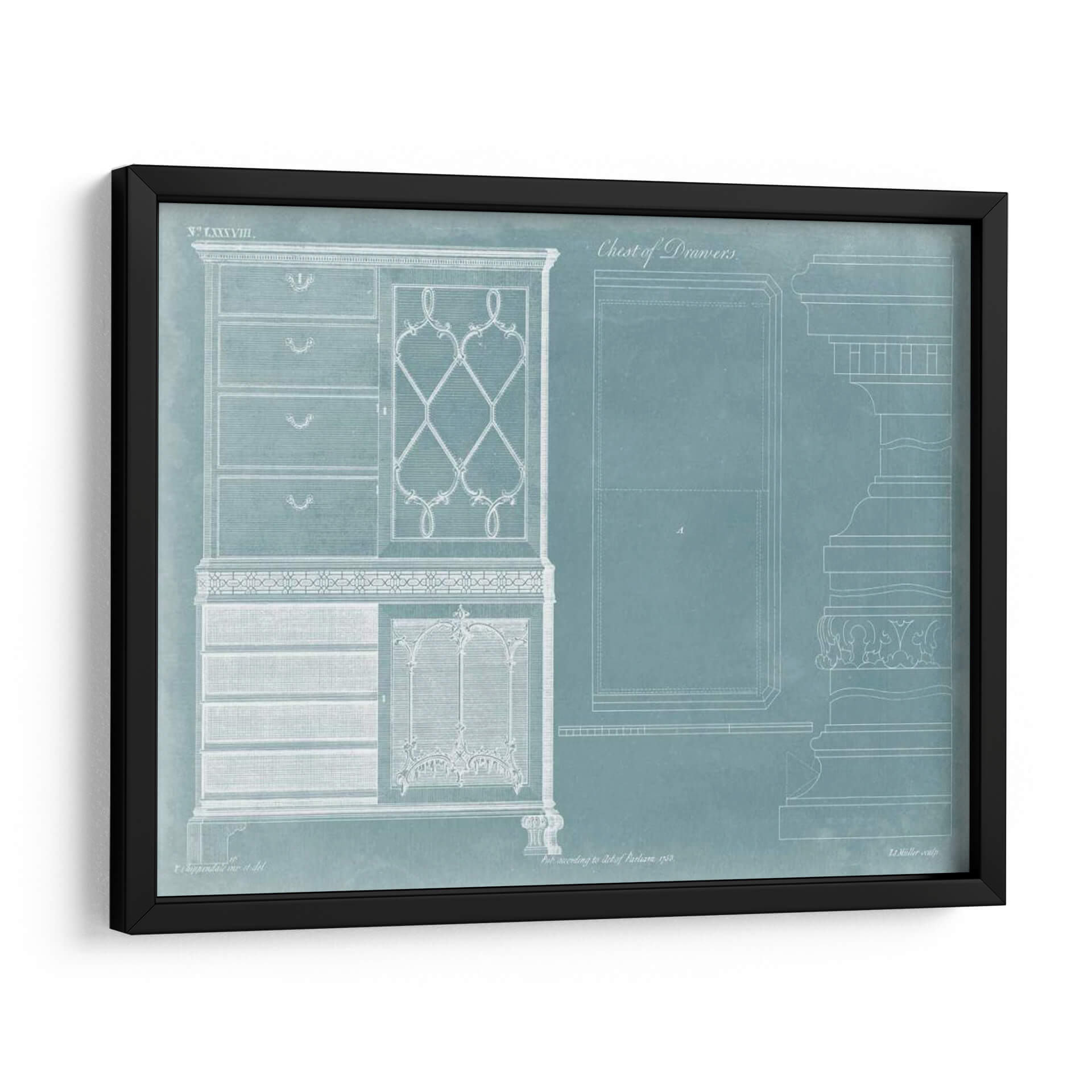 Transforma tu espacio con la elegancia atemporal de "Cofre De Cajas De Chippendale", una obra maestra de Thomas Chippendale que evoca el refinamiento de los diseños clásicos. Este cuadro decorativo, presentado en un sereno tono azul verdoso, captura la intrincada arquitectura de un mueble de época con un detalle exquisito. Las líneas limpias y los patrones ornamentados de la vitrina y los cajones se delinean con un blanco nítido, creando un contraste visual impactante que atrae la mirada. La composición se asemeja a un plano arquitectónico o un estudio de diseño, aportando un aire de sofisticación intelectual y un toque de nostalgia a cualquier habitación. Ideal para aquellos que aprecian la artesanía detallada y la historia del diseño, esta pieza es perfecta para añadir un punto de interés y elegancia clásica a salones, estudios u oficinas. Su paleta de colores suave y su diseño detallado invitan a la contemplación, ofreciendo un ambiente de calma y distinción. Integra este cuadro decorativo para infundir en tu hogar un sentido de herencia y un estilo impecable, convirtiéndolo en una adición memorable a tu colección de arte de pared.