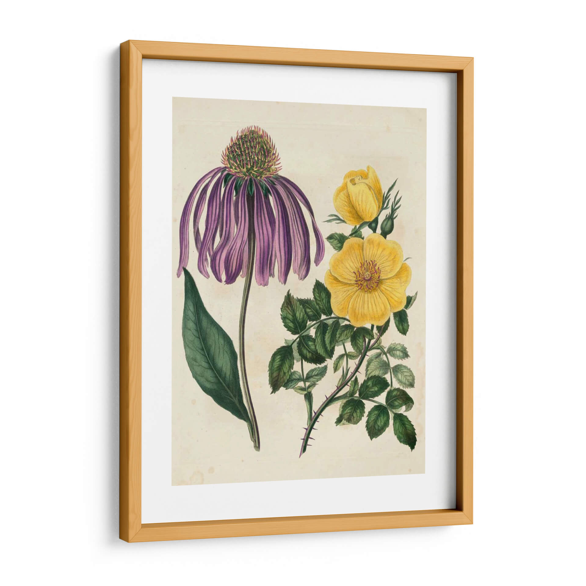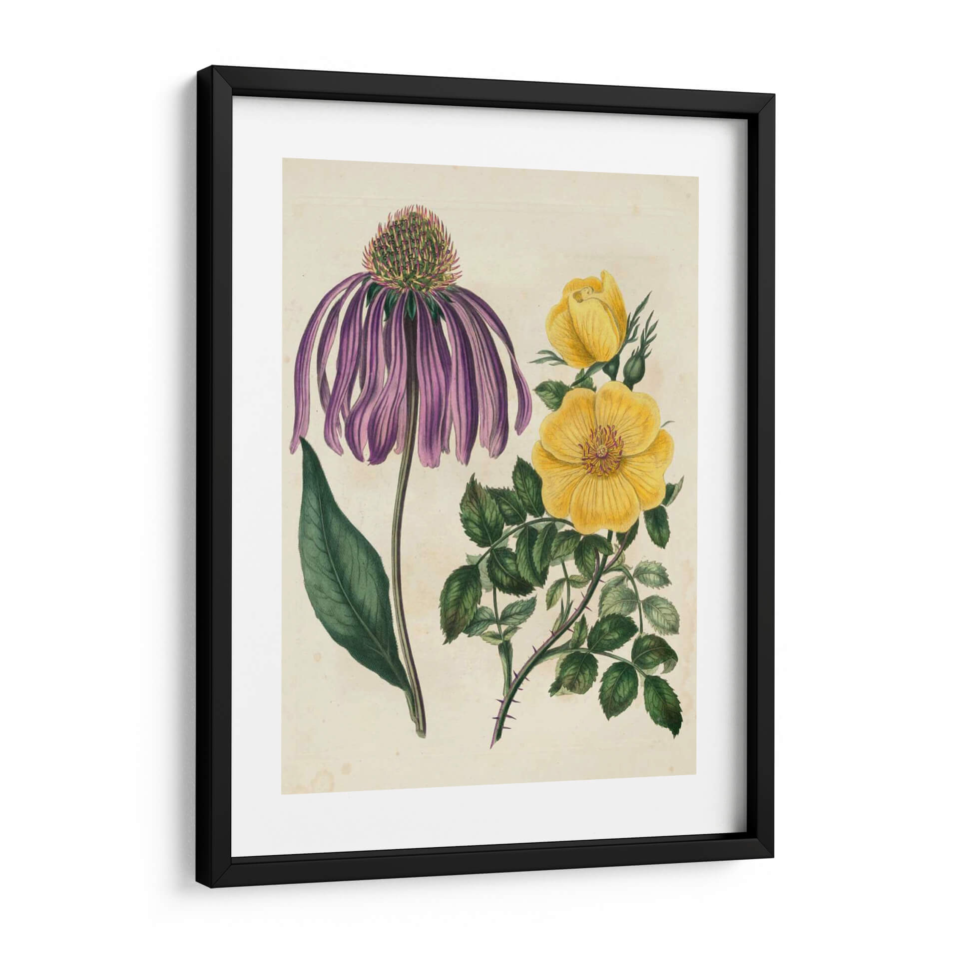 Sumérgete en la belleza botánica con "Emparejamientos De Jardín Vii", una exquisita obra de arte de Sydenham Edwards que captura la delicadeza de la naturaleza. Este cuadro decorativo presenta una vibrante flor púrpura, reminiscente de una equinácea, junto a dos rosas amarillas en plena floración, todo ello presentado sobre un fondo de estilo vintage con toques de pergamino que evocan la era de los herbaria y las ilustraciones científicas clásicas. La detallada representación de los pétalos, las hojas y los espinos de las rosas, junto con la intrincada estructura de la flor principal, revela la maestría del artista y su profundo conocimiento botánico. La paleta de colores, dominada por los contrastes entre el púrpura profundo y el amarillo radiante, salpicada de verdes intensos, crea una composición visualmente atractiva y equilibrada. Esta pieza es ideal para añadir un toque de elegancia natural y un aire de sofisticación atemporal a cualquier espacio. Perfecta para salones, comedores o estudios que busquen un punto focal de inspiración orgánica y un recordatorio de la belleza intrínseca del mundo floral. Un cuadro decorativo que trasciende el tiempo, aportando serenidad y un toque de historia natural a tu hogar u oficina.
