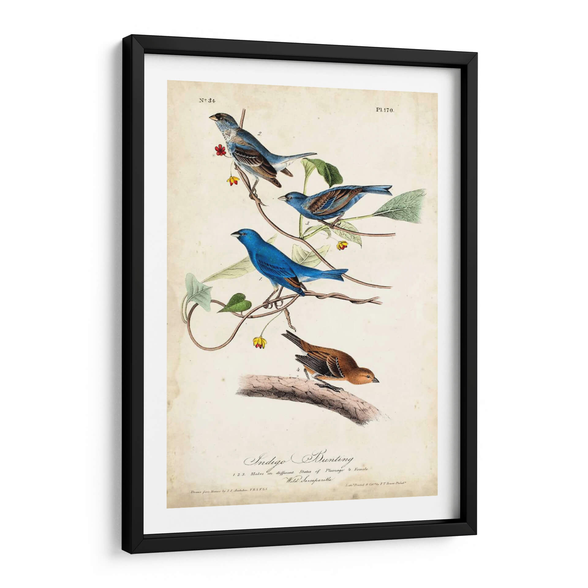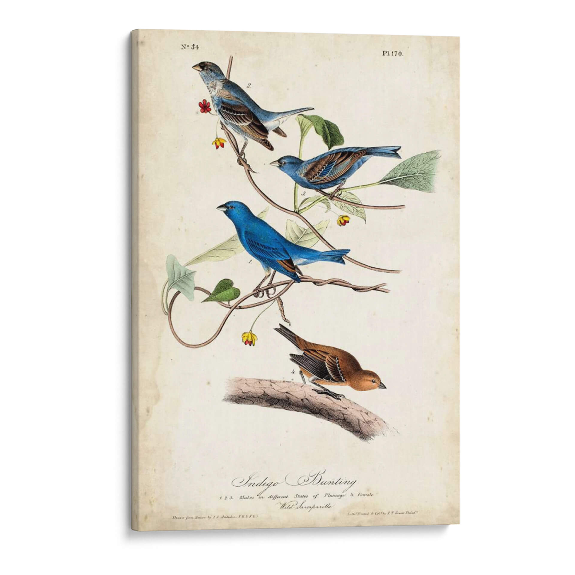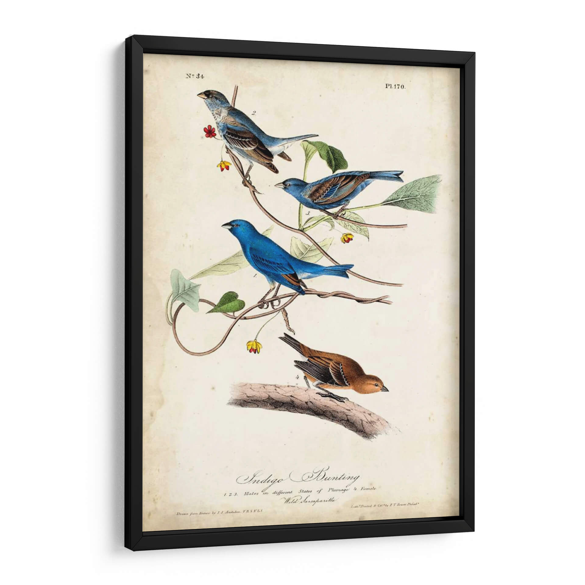 Embellece tu espacio con el encanto atemporal de "Empavesado De Índigo", una obra maestra del renombrado artista John James Audubon. Esta exquisita ilustración de aves, inspirada en el estilo clásico de la ornitología, captura la delicadeza y la vibrante belleza del gorrión índigo en diferentes etapas de plumaje y sexos. La composición presenta varias aves posadas elegantemente sobre ramas, adornadas con pequeñas flores amarillas y follaje verde sutil. La paleta de colores, dominada por los profundos y cautivadores tonos de índigo, se complementa con toques de marrón terroso y el contraste de los acentos florales, creando una atmósfera de serenidad y elegancia natural. El fondo de tono sepia envejecido aporta un aire de autenticidad histórica y sofisticación, evocando la sensación de un estudio naturalista del siglo XIX. Este cuadro decorativo es perfecto para añadir un toque de distinción y color a cualquier habitación, desde una sala de estar acogedora hasta un estudio sereno o una oficina profesional. Ideal para amantes de la naturaleza, la ornitología o aquellos que aprecian el arte clásico y detallado, "Empavesado De Índigo" es una pieza que inspira contemplación y admiración, aportando un vínculo con la belleza del mundo natural a tu hogar. Añade esta joya de la historia natural a tu colección de arte de pared y transforma tu entorno con su gracia y colorido.