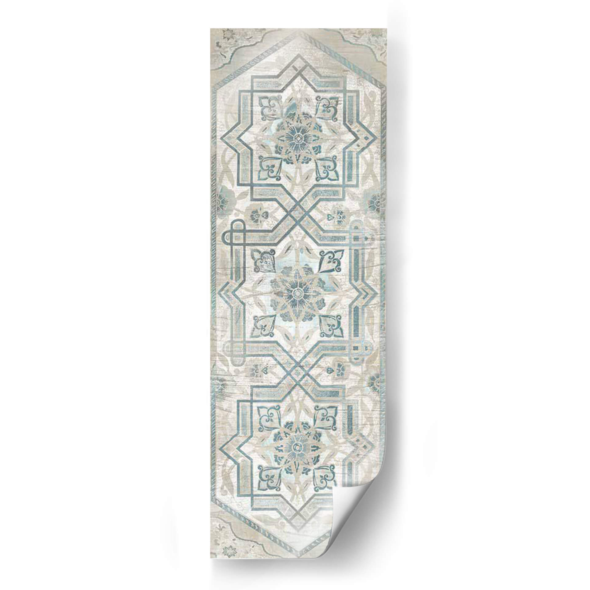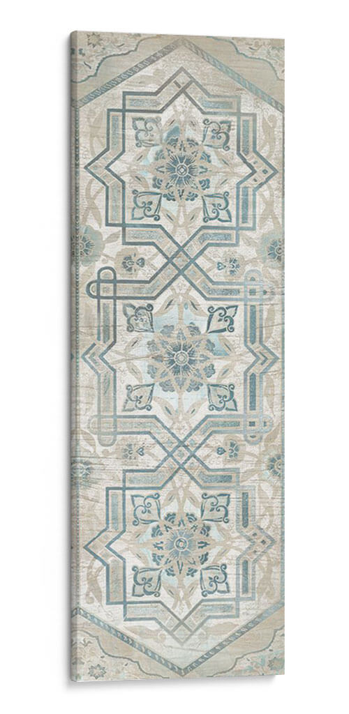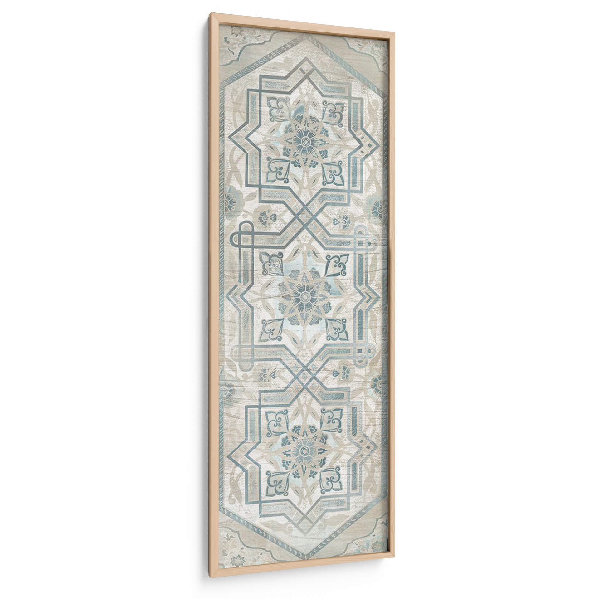 Sumérgete en la elegancia atemporal de "Panel Persa Vintage III", una obra de arte digital que evoca la rica herencia del diseño persa con un toque contemporáneo. Esta pieza presenta un intrincado patrón geométrico, reminiscente de los azulejos tradicionales persas, adornado con delicados motivos florales y arabescos. La paleta de colores se centra en tonos serenos de azul pálido, beige arena y grises suaves, creando una atmósfera de calma y sofisticación. El estilo vintage, combinado con una textura sutil que simula madera desgastada, añade profundidad y carácter, haciendo que la obra parezca una reliquia preciosa. La composición vertical y simétrica guía la mirada a través de una repetición armoniosa de formas, generando un efecto hipnótico y equilibrado. "Panel Persa Vintage III" es ideal para quienes buscan infundir a sus espacios un aire de refinamiento histórico sin sacrificar la modernidad. Este cuadro decorativo es perfecto para añadir un punto focal de serenidad y elegancia a salones, dormitorios o pasillos, complementando tanto decoraciones clásicas como contemporáneas, y aportando un toque de viaje exótico a tu hogar.