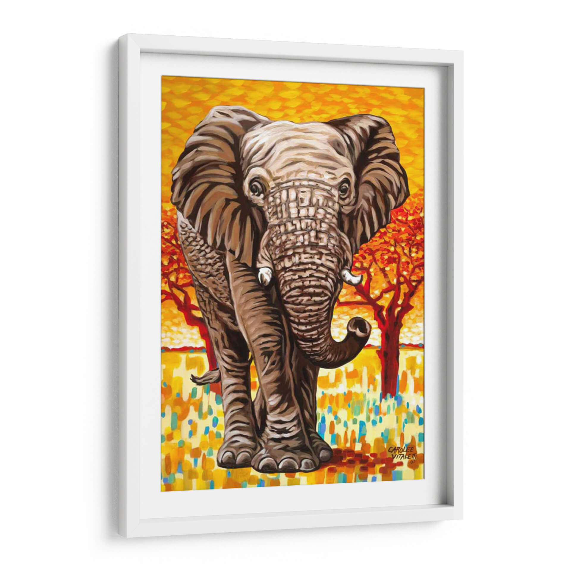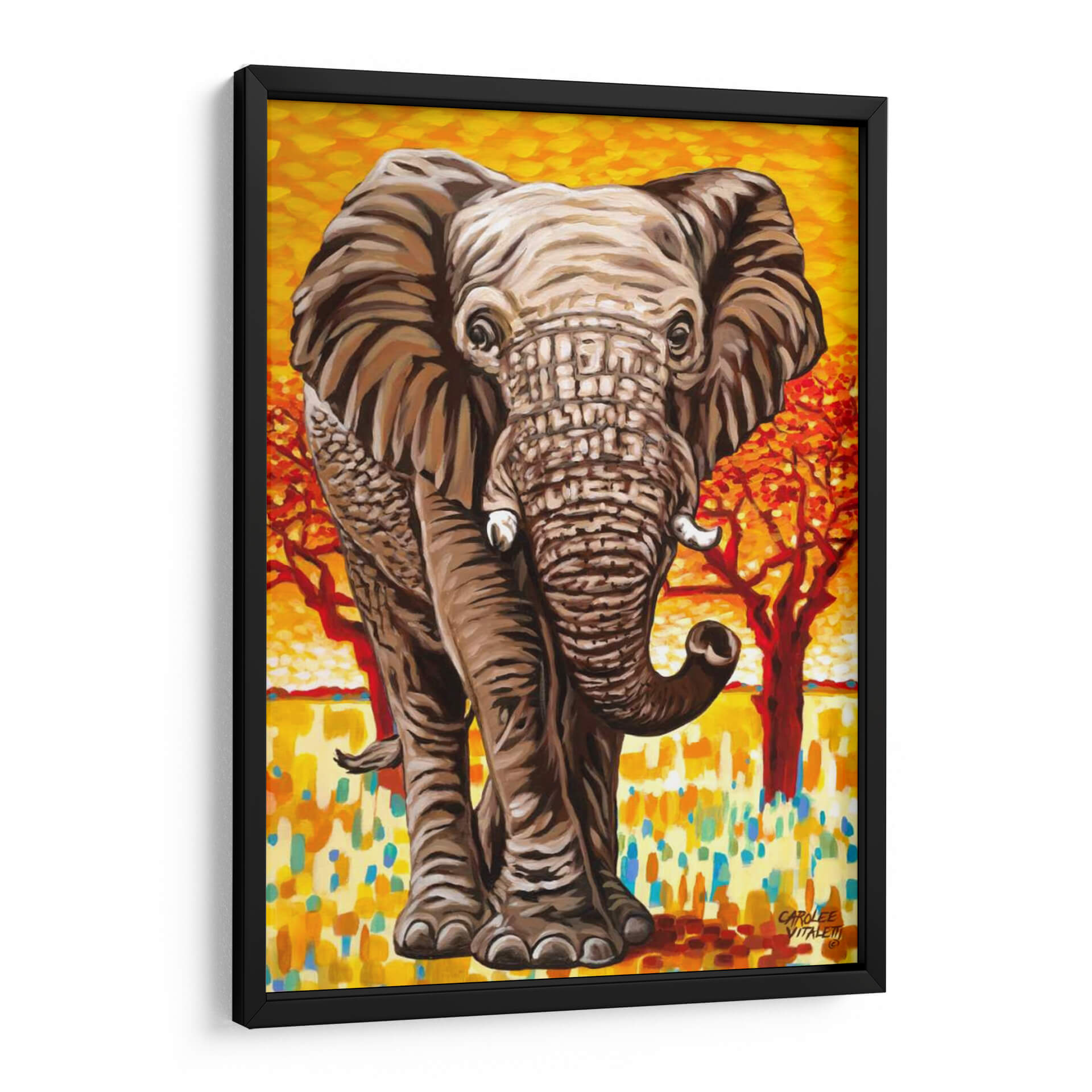 Sumérgete en la majestuosidad de la sabana africana con "África Salvaje I", una obra de arte vibrante y evocadora de Carolee Vitaletti. Este cuadro decorativo captura la imponente presencia de un elefante de frente, con una mirada penetrante que parece conectar directamente con el espectador. La paleta de colores es rica y cálida, dominada por intensos tonos ocres, naranjas y amarillos en el fondo, que simulan un atardecer africano o la sequedad de la estación seca. Los árboles, con sus ramas de un rojo intenso, añaden un toque dramático y estilizado al paisaje. La técnica pictórica, con pinceladas visibles y texturizadas, otorga profundidad y dinamismo a la pieza, especialmente en el detallado estudio de la piel arrugada del elefante y la exuberante vegetación en primer plano. Esta obra es ideal para infundir carácter y un sentido de aventura en cualquier espacio, desde una sala de estar moderna hasta un estudio con inspiración natural. "África Salvaje I" no es solo una decoración de pared; es una ventana a la potencia y la belleza indómita de la naturaleza, un punto focal que invita a la reflexión y la admiración.