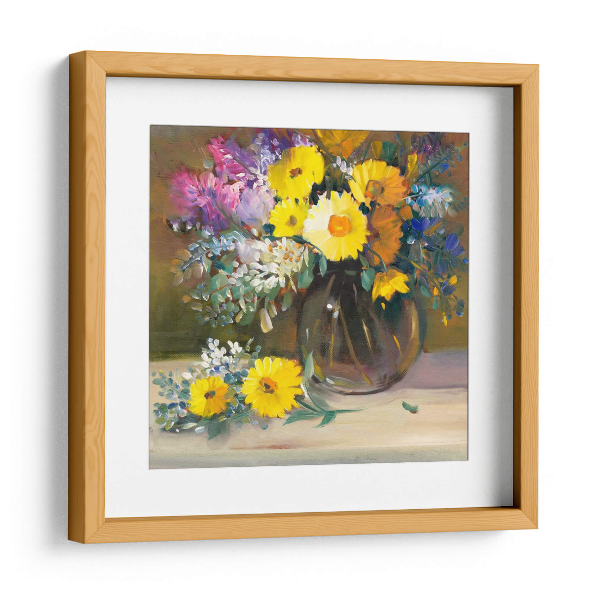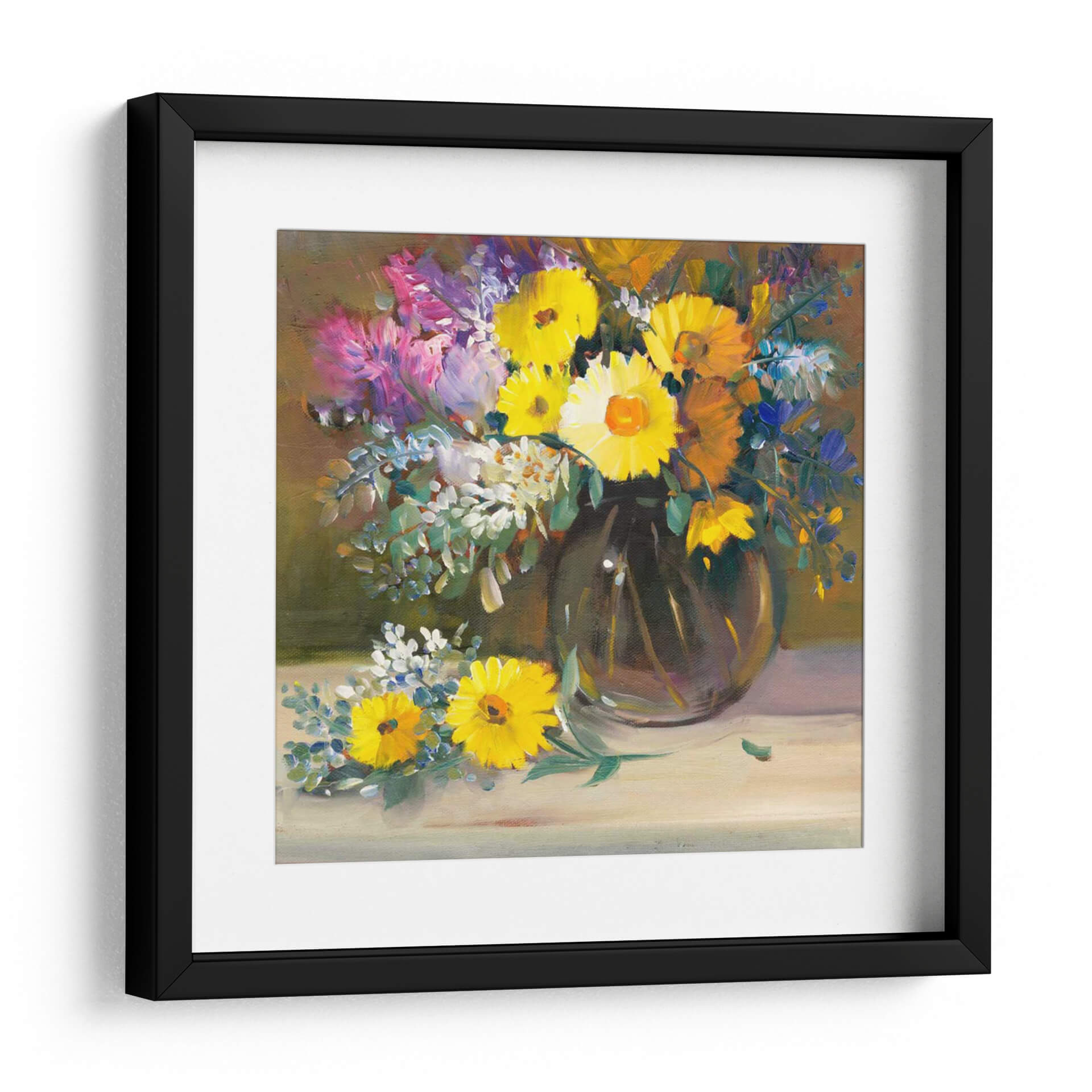 Embellece tu hogar con el cautivador cuadro decorativo "Bodegón Floral II" de Tim O'Toole. Esta obra maestra captura la exuberancia y la vitalidad de un arreglo floral vibrante, presentado en un estilo que fusiona la tradición con un toque contemporáneo. Los ricos tonos amarillos y anaranjados de las flores centrales contrastan maravillosamente con los toques de púrpura, azul y blanco que salpican el ramo, creando una explosión de color que ilumina cualquier estancia. La técnica de pintura, con pinceladas visibles y una textura sugerida, aporta profundidad y un carácter artesanal a la pieza, invitando al espectador a apreciar la belleza de la naturaleza en su máxima expresión. Ideal para añadir un punto de interés y calidez a salones, comedores o estudios, este cuadro decorativo transformará tu espacio en un oasis de frescura y estilo. Su composición equilibrada y la atmósfera alegre que irradia lo convierten en la elección perfecta para quienes buscan una decoración que inspire y deleite.