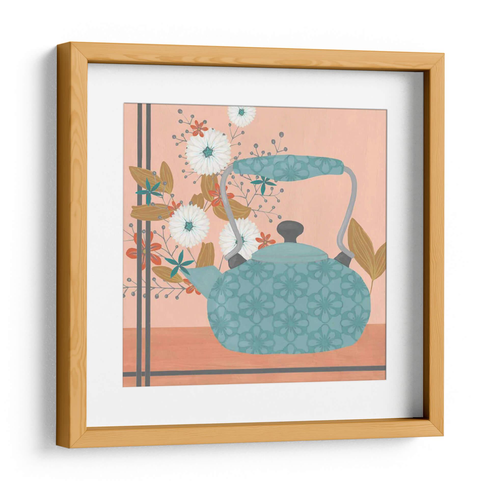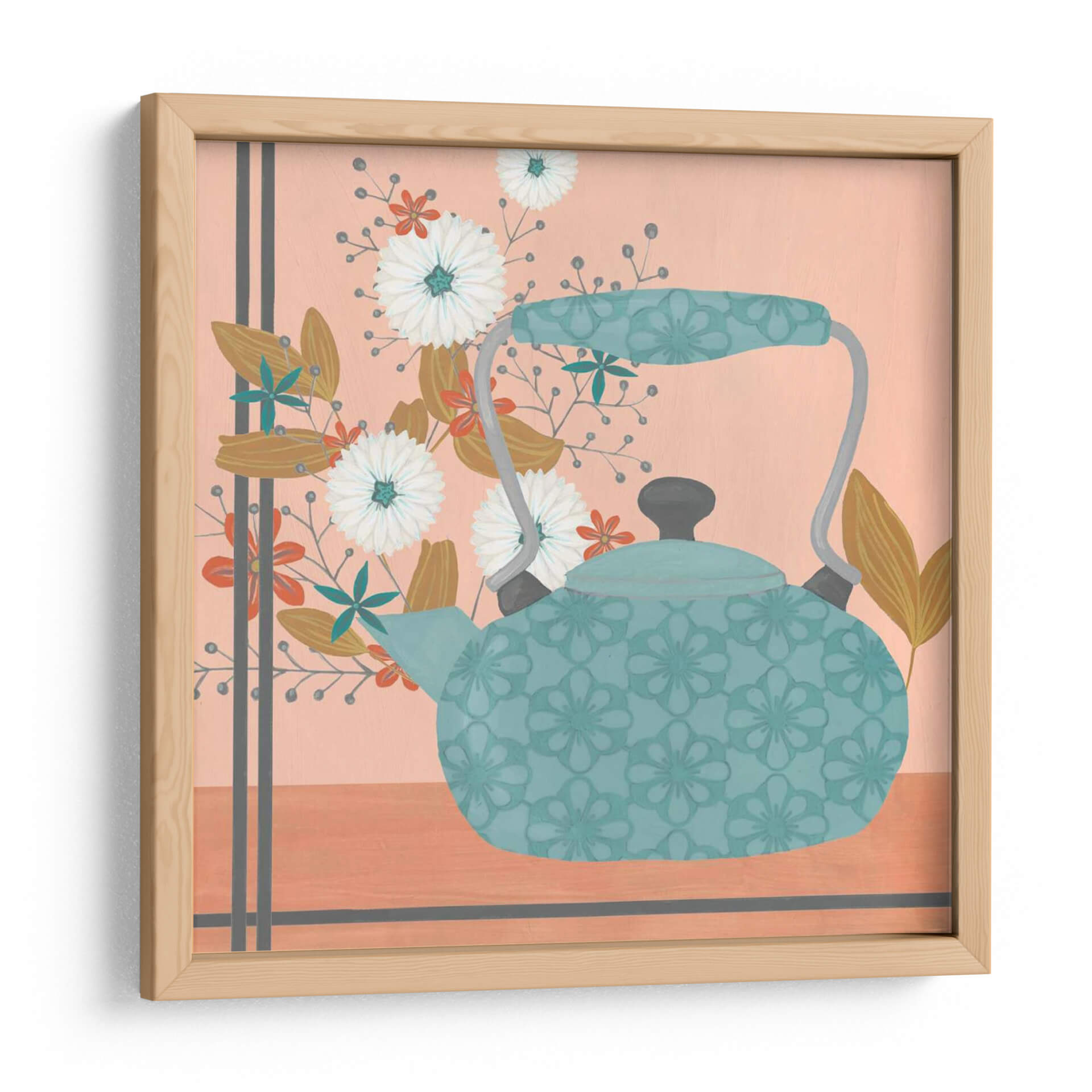 Inyecta un toque de encanto caprichoso y calidez a tu hogar con "Cocina Caprichosa III", una obra de arte vibrante y detallada del aclamado artista June Erica Vess. Este cuadro decorativo presenta un tetera de un cautivador tono azul verdoso, adornada con un delicado patrón floral en tonos más claros. Rodeada de un exuberante follaje en tonos ocres y terracota, junto a flores blancas y anaranjadas, la pieza evoca una sensación de frescura primaveral y serenidad. La paleta de colores, dominada por un suave melocotón de fondo y acentos grises y marrones, crea una atmósfera acogedora y alegre, perfecta para cualquier espacio que busque un toque de personalidad y estilo. El estilo pictórico, con sus líneas definidas y un toque de arte popular, se complementa con una composición equilibrada que atrae la mirada hacia el elemento central. Este cuadro es ideal para cocinas, comedores, o cualquier rincón donde desees añadir un punto de interés visual y una pincelada de alegría cotidiana. Transforma tu pared en una galería personal con esta pieza única.