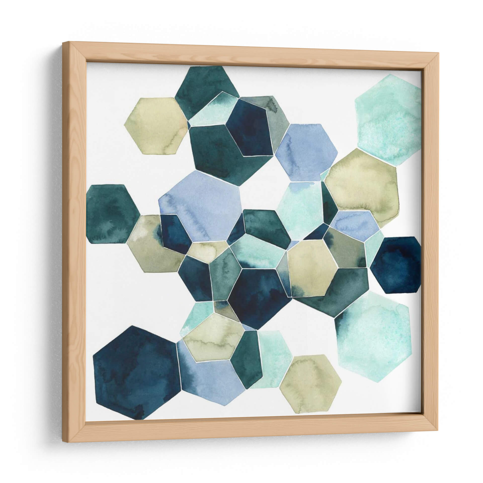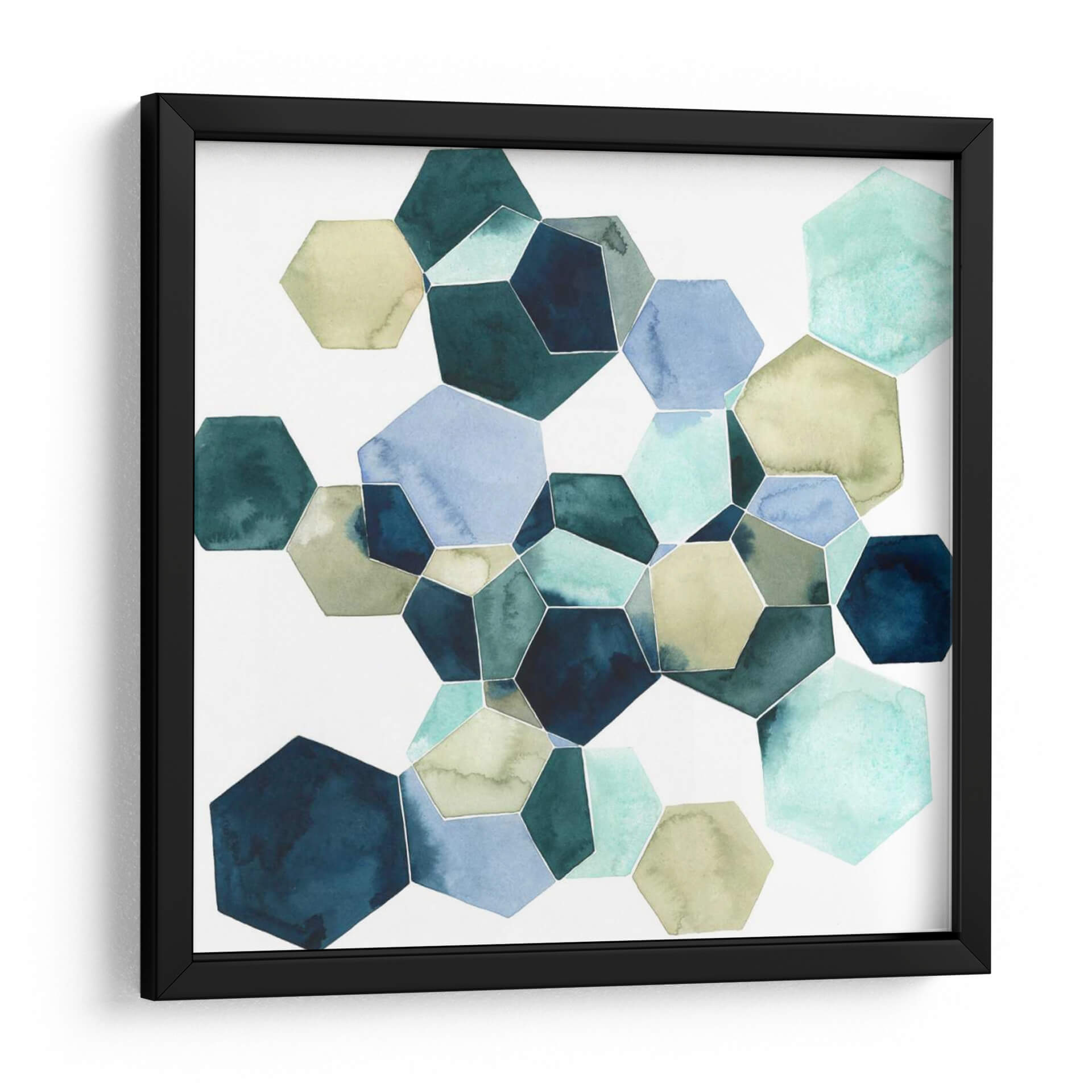 Sumérgete en la serena belleza de "Cristalizar I", una obra de arte abstracta de Grace Popp que redefine la elegancia geométrica. Este cuadro decorativo presenta una cautivadora composición de hexágonos interconectados, cada uno capturado en delicadas tonalidades acuosas que evocan la tranquilidad del océano y la calidez de la tierra. La paleta de colores, que abarca desde profundos azules marinos y verdes esmeralda hasta suaves tonos piedra y celestes, crea una atmósfera de calma y equilibrio, perfecta para cualquier espacio que busque un toque de sofisticación natural. La técnica de acuarela, con sus sutiles gradaciones y transparencias, aporta una profundidad y un carácter orgánico a las formas geométricas definidas, resultando en una pieza visualmente atractiva y reconfortante. "Cristalizar I" es ideal para añadir un punto focal de serenidad en un dormitorio, un toque de refinamiento en una sala de estar moderna, o una atmósfera de concentración en una oficina. Transforma tu hogar con esta pieza de arte abstracto que combina la precisión geométrica con la fluidez etérea de la acuarela, creando un diálogo visual armonioso y atemporal que resuena con la belleza del mundo natural.