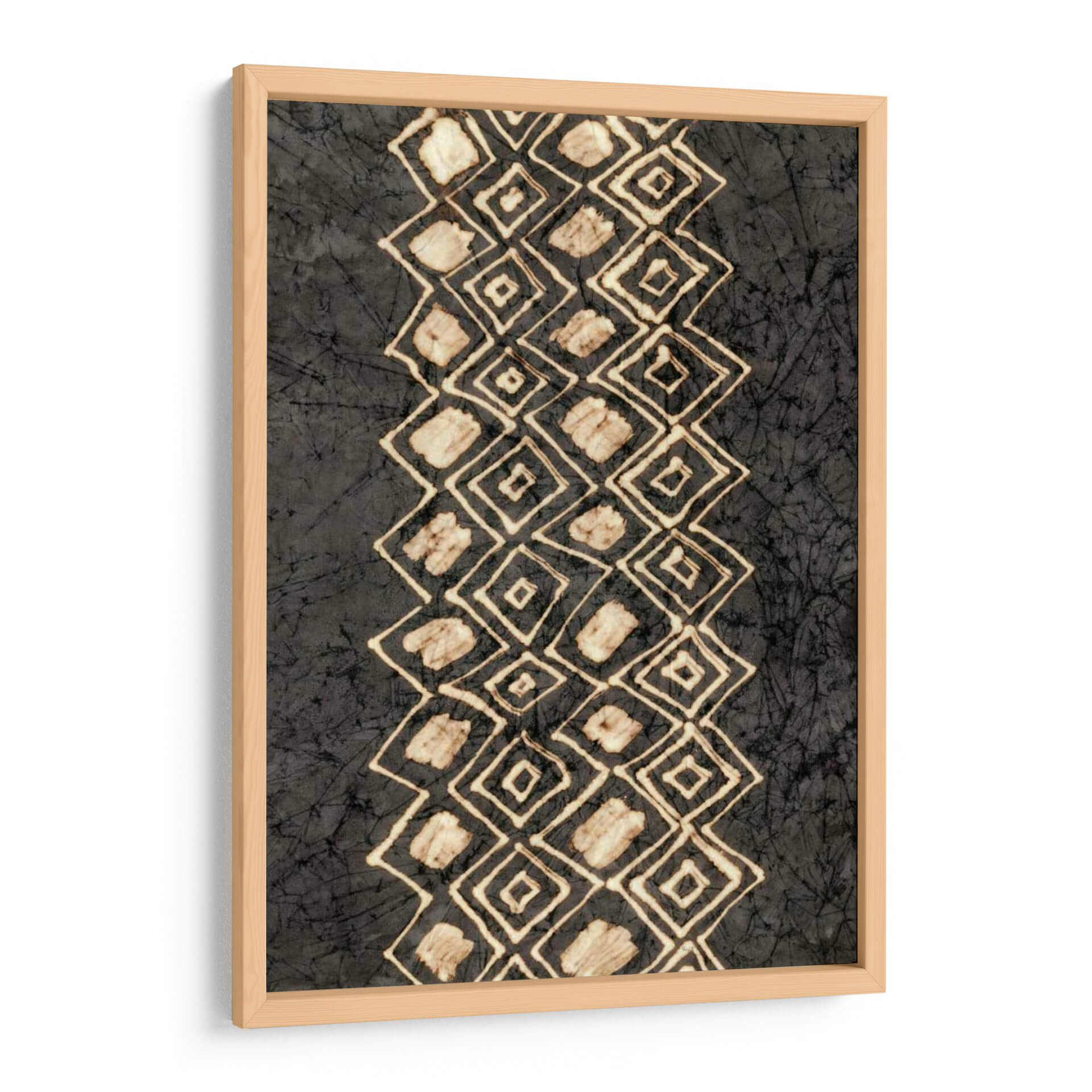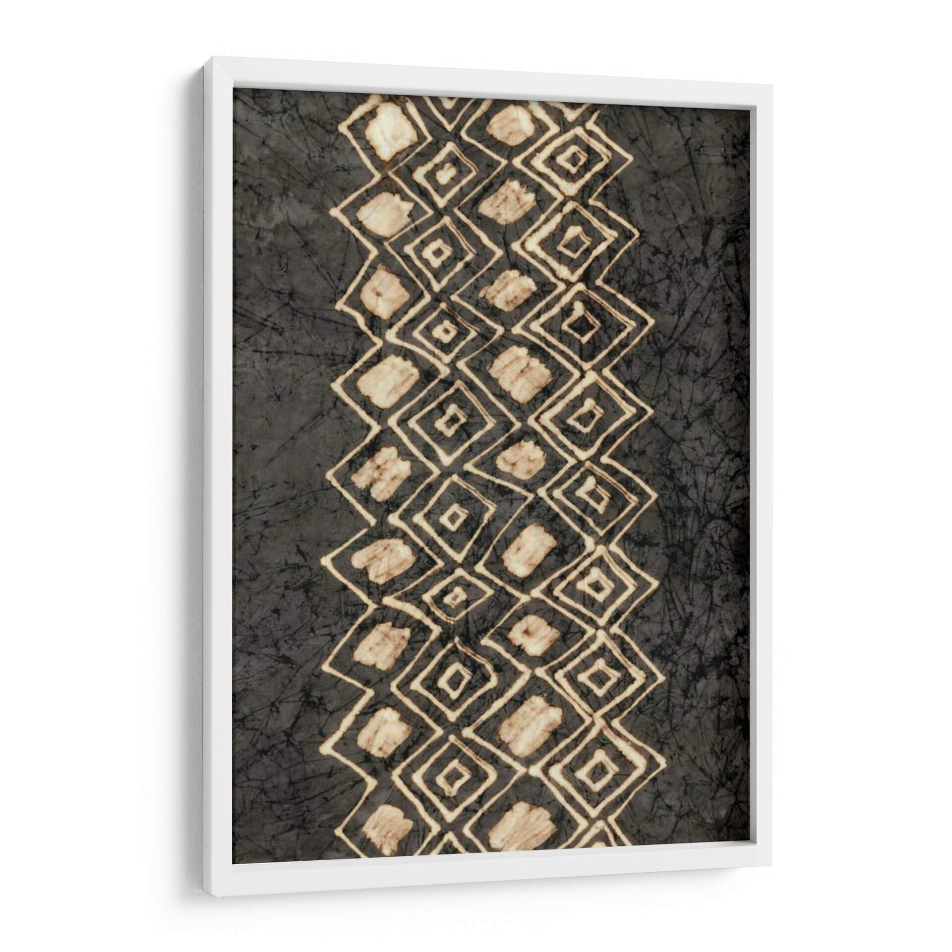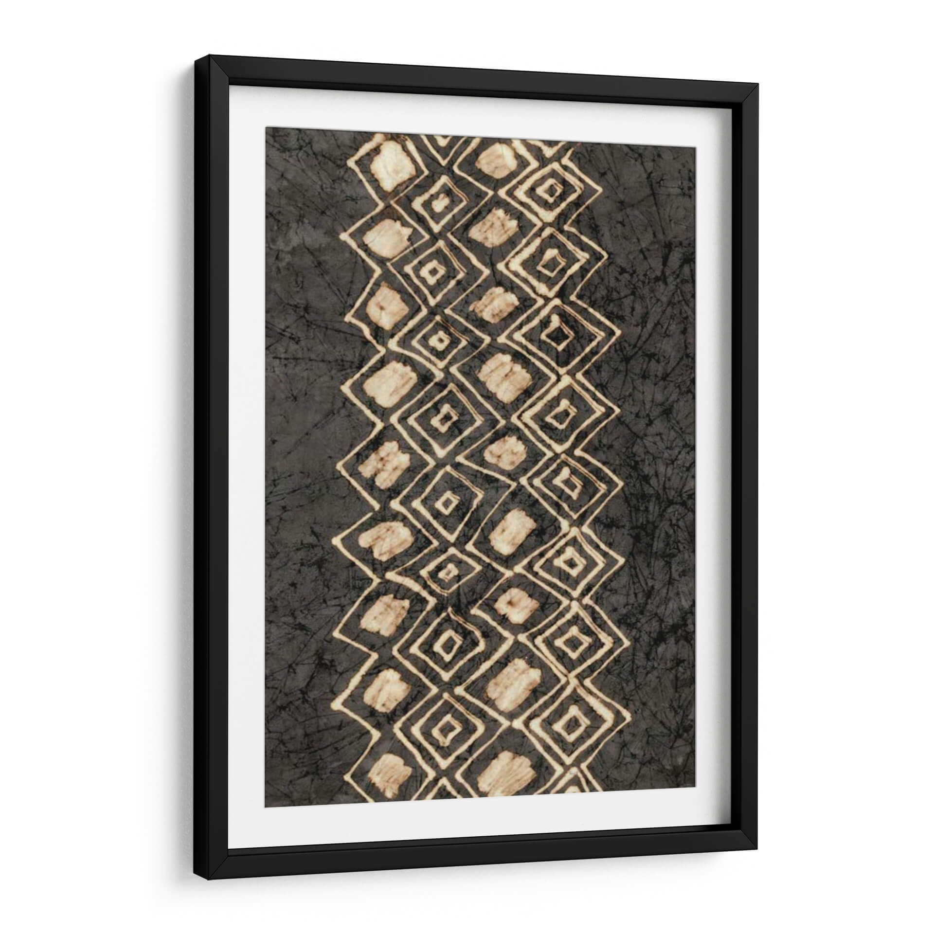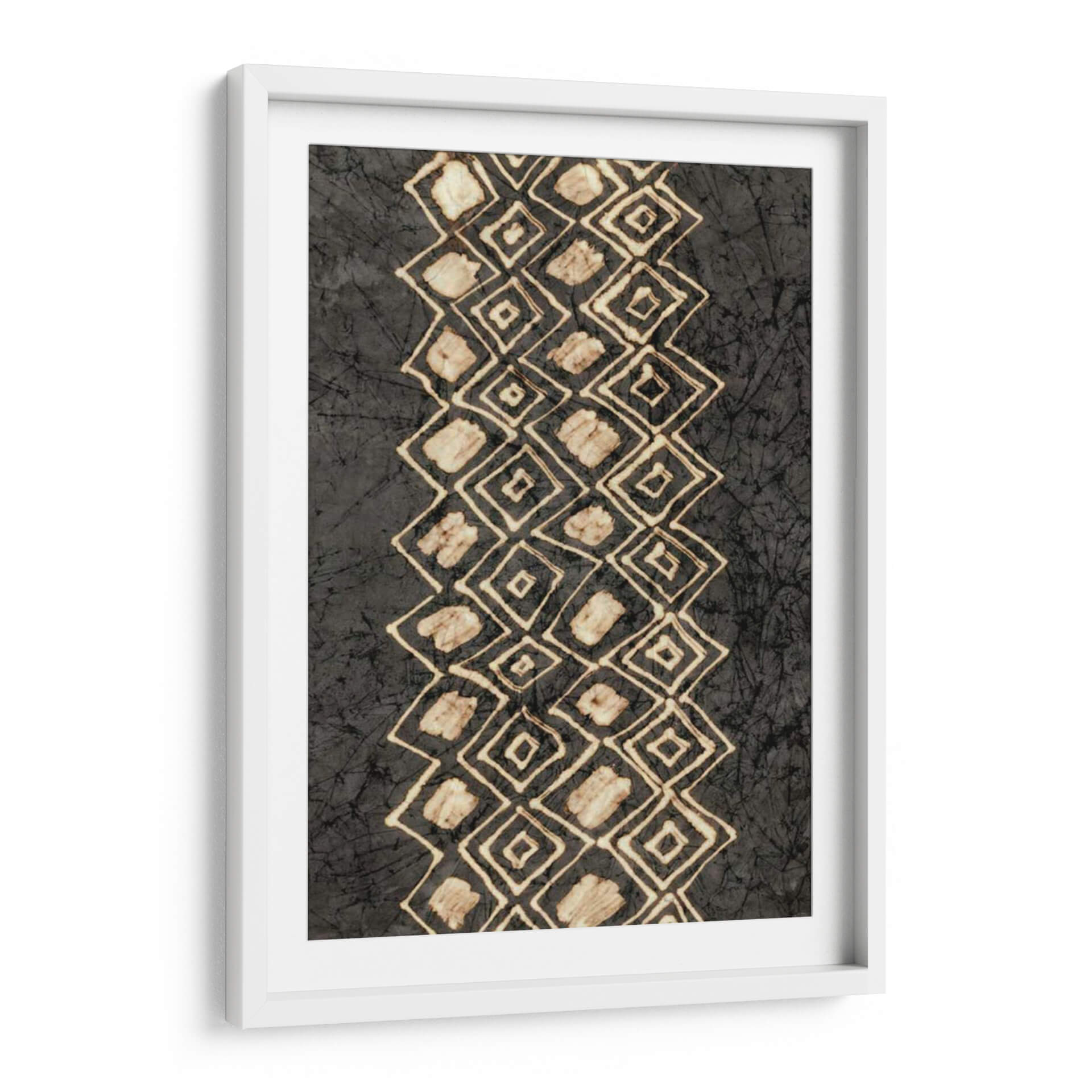 Sumérgete en la riqueza visual de "Diseños Primitivos IV", una obra de arte contemporáneo que evoca una conexión ancestral con la tierra y la tradición. Esta pieza, creada por Renee W. Stramel, presenta un diseño abstracto cautivador, con una banda vertical de rombos interconectados que desciende por el lienzo, contrastando con un fondo texturizado en tonos oscuros. Los rombos, trazados con líneas finas y rellenos irregulares en tonos arena y beige, sugieren patrones tribales o elementos naturales estilizados, como conchas o semillas. La paleta de colores, dominada por el carbón, el gris y toques de blanco roto y ocre, crea una atmósfera de misterio y serenidad, perfecta para espacios que buscan un toque de profundidad y autenticidad. Su composición vertical y el diseño de repetición rítmica aportan orden y fluidez, haciendo de este cuadro decorativo una pieza versátil que puede complementar tanto ambientes modernos como rústicos. "Diseños Primitivos IV" es ideal para quienes aprecian el arte con narrativa, aportando un aire de sofisticación terrenal y un punto de intriga a cualquier sala de estar, estudio u oficina, invitando a la contemplación y al diálogo.