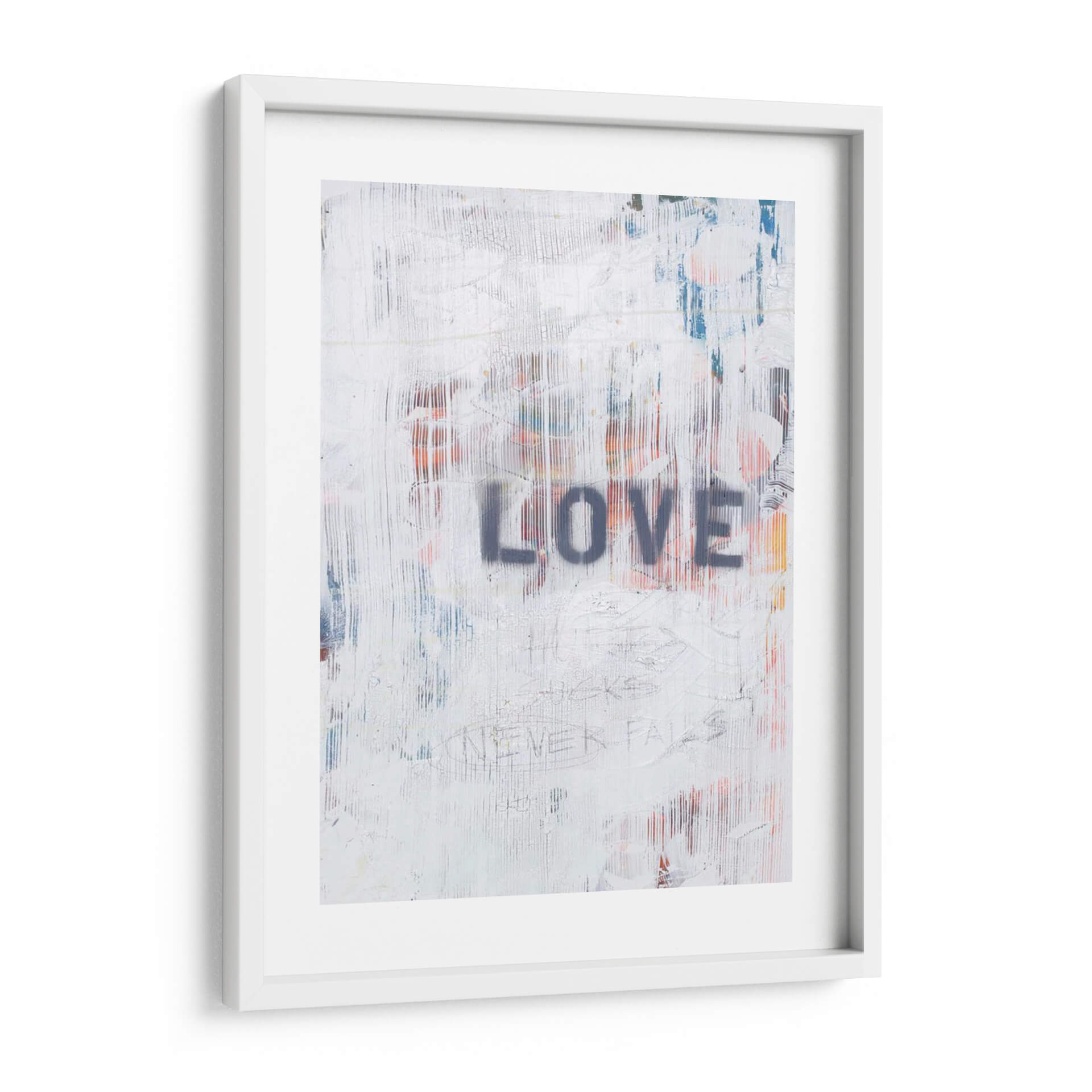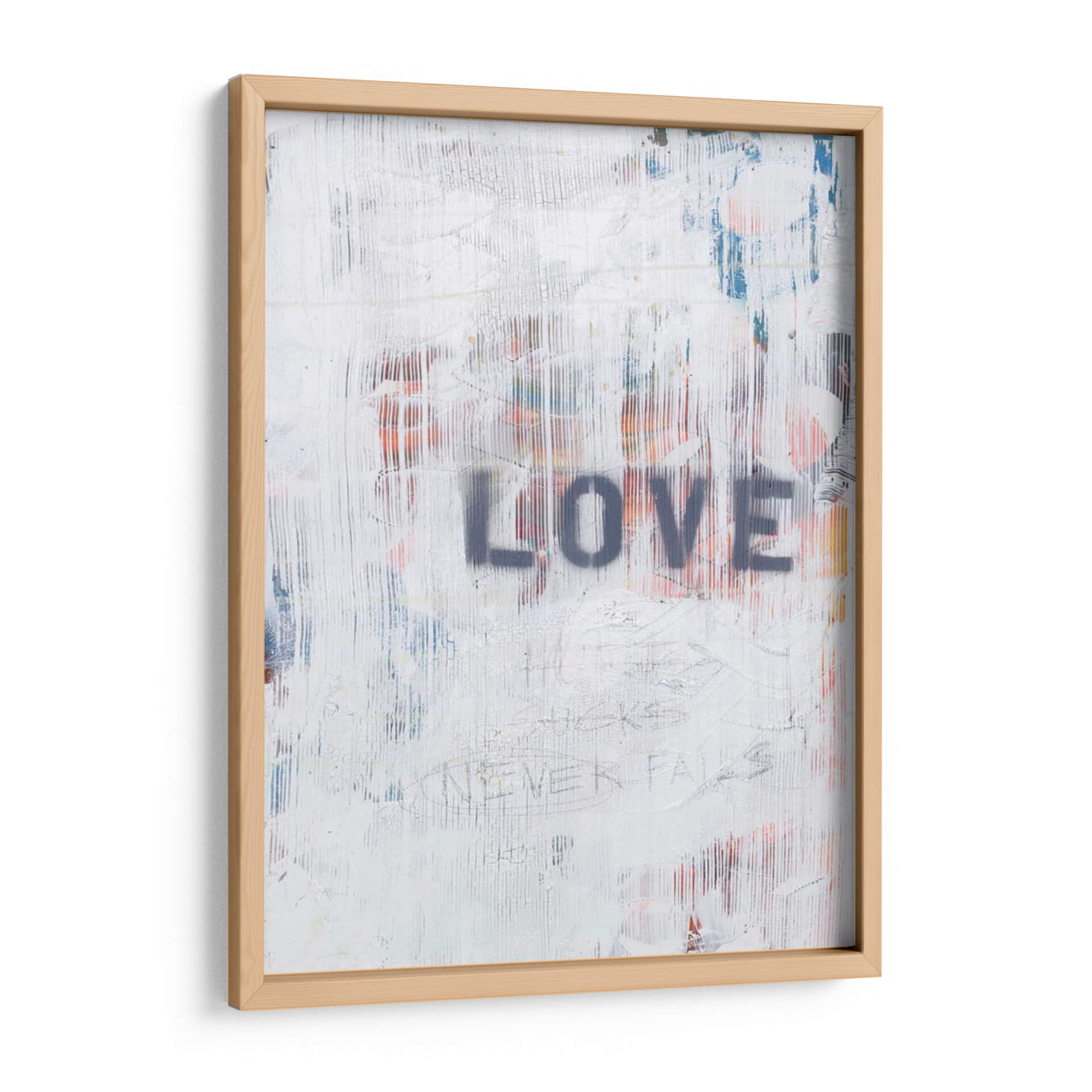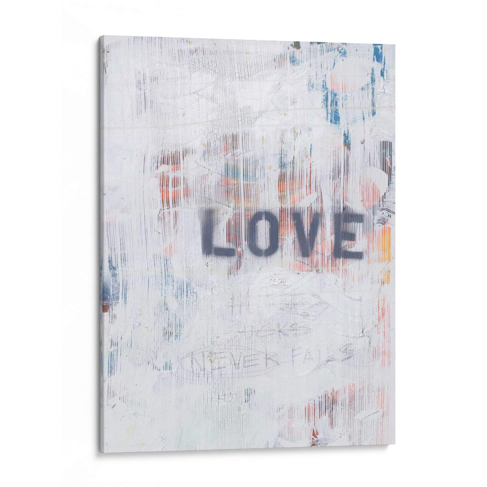 Transforma tu espacio con la cautivadora obra "El Amor Nunca Falla Ii", una pieza de arte contemporáneo que irradia un mensaje potente y universal. Este cuadro decorativo abstracto presenta una base texturizada en blanco roto, con capas de pintura que sugieren la roughneza de un muro urbano intervenido. Destacan pinceladas verticales en tonos grises, azules y anaranjados que aportan profundidad y dinamismo a la composición. En el centro, la palabra "LOVE" se estampa con letras mayúsculas en gris oscuro, utilizando una técnica de esténcil que evoca el arte callejero y la espontaneidad. Debajo, sutiles grafitis y trazos finos, incluyendo la frase "NEVER FAILS", añaden un toque de autenticidad y narrativa visual. La paleta de colores, predominantemente neutra con explosiones de color, crea un equilibrio visual perfecto, ideal para añadir un toque de carácter y reflexión a salones modernos, oficinas o espacios que busquen un punto focal inspirador. "El Amor Nunca Falla Ii" no es solo una decoración, sino una declaración de intenciones que infunde optimismo y fuerza a tu entorno.